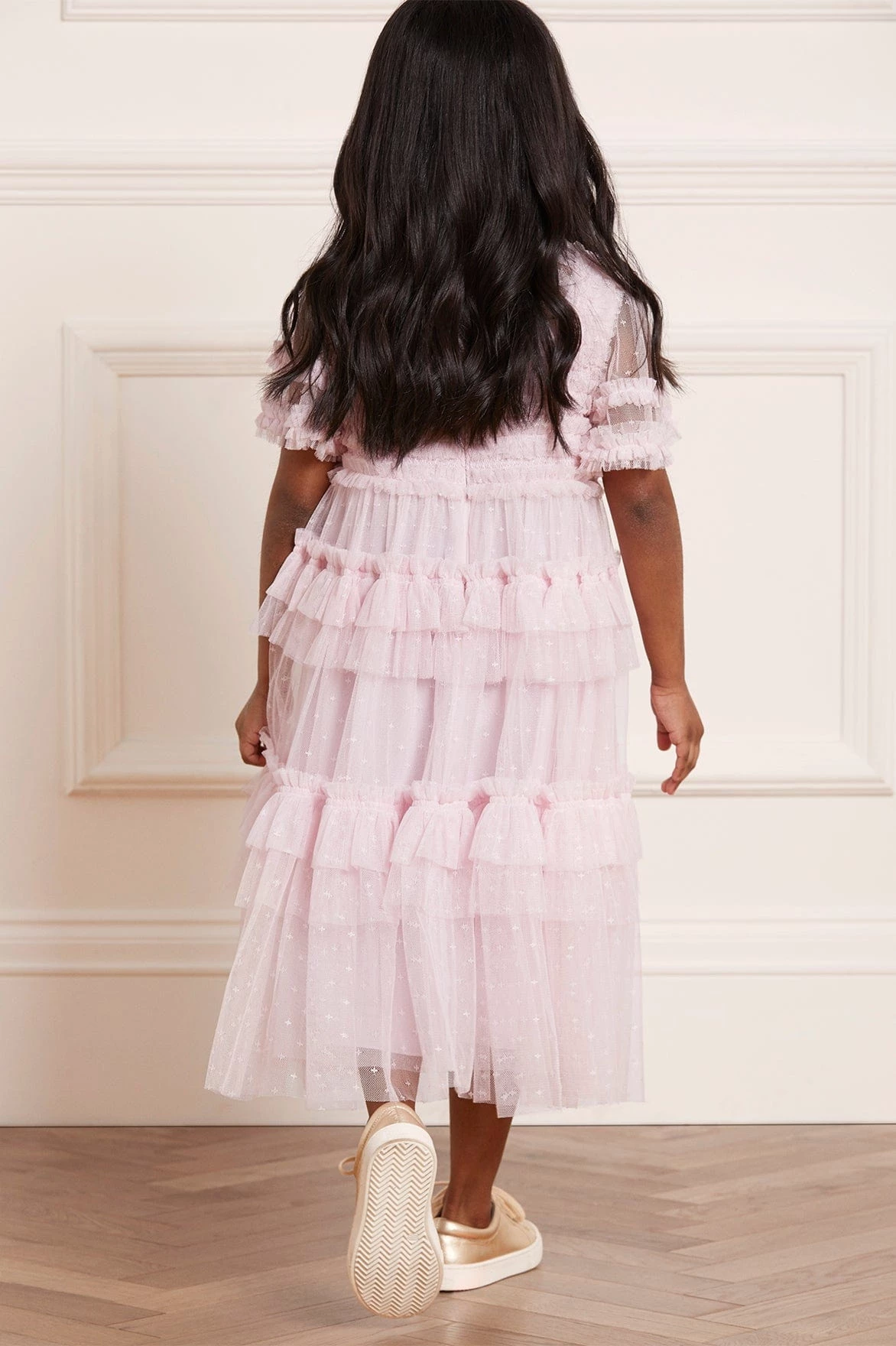NEW SEASON | The Peaches Smocked KIDS Dress in Wisteria. This dress is designed with tiers, frills and a full skirt for added movement. Beautifully designed with an elasticated smocked waist for comfort and pretty detailing. Features short sleeves, tulle ruffles, and a kiss ‘x’ motif throughout. The perfect piece for your little one’s wardrobe.