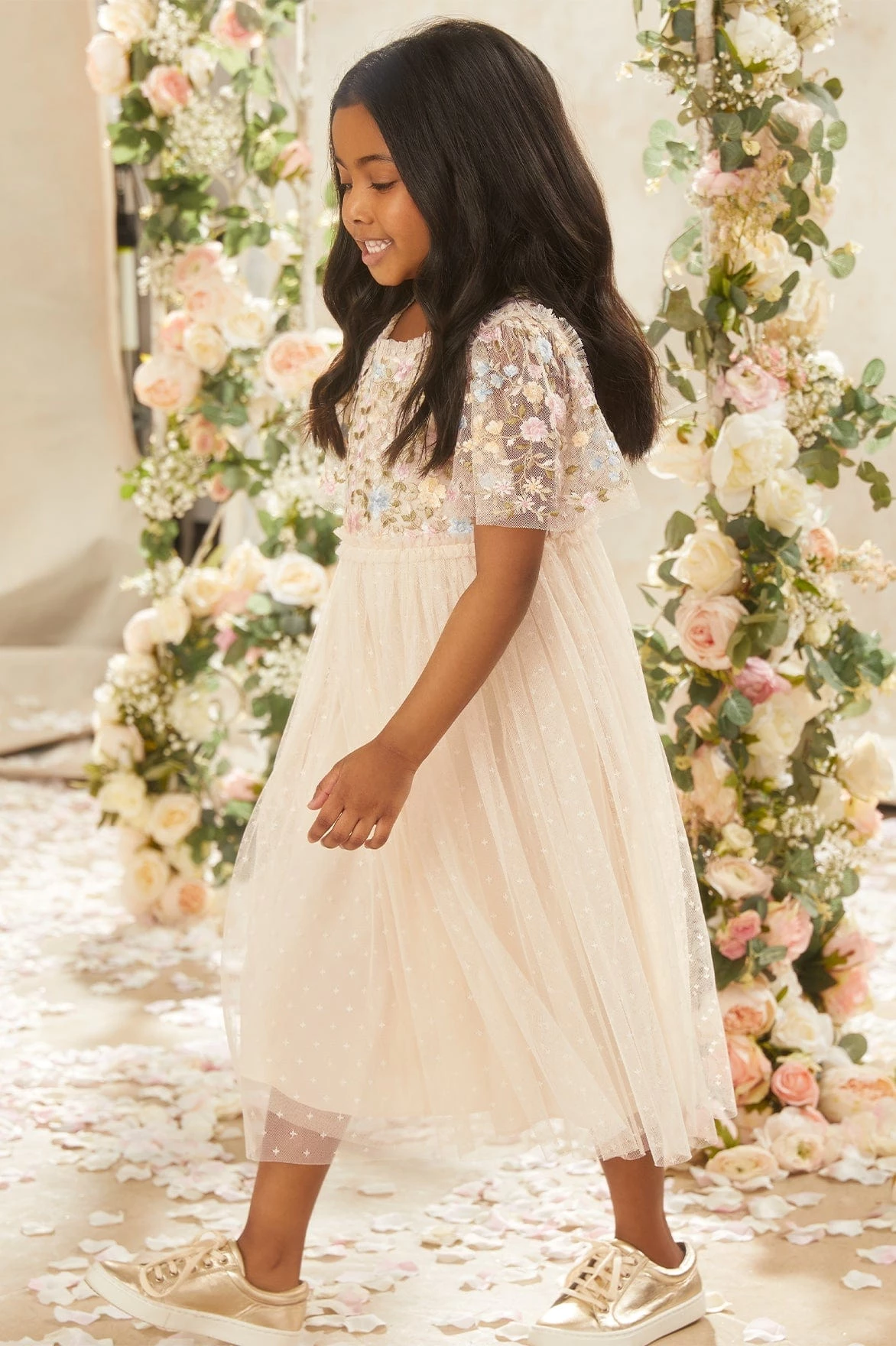 NEW SEASON | The Secret Garden Bodice KIDS Dress in Champagne / Sundaze. A signature Needle & Thread style featuring tulle trims and a layered tulle skirt. The bodice of this dress is adorned with statement embroidery artwork. Designed with a floral motif design in pastel shades. The perfect statement piece for her wardrobe.
