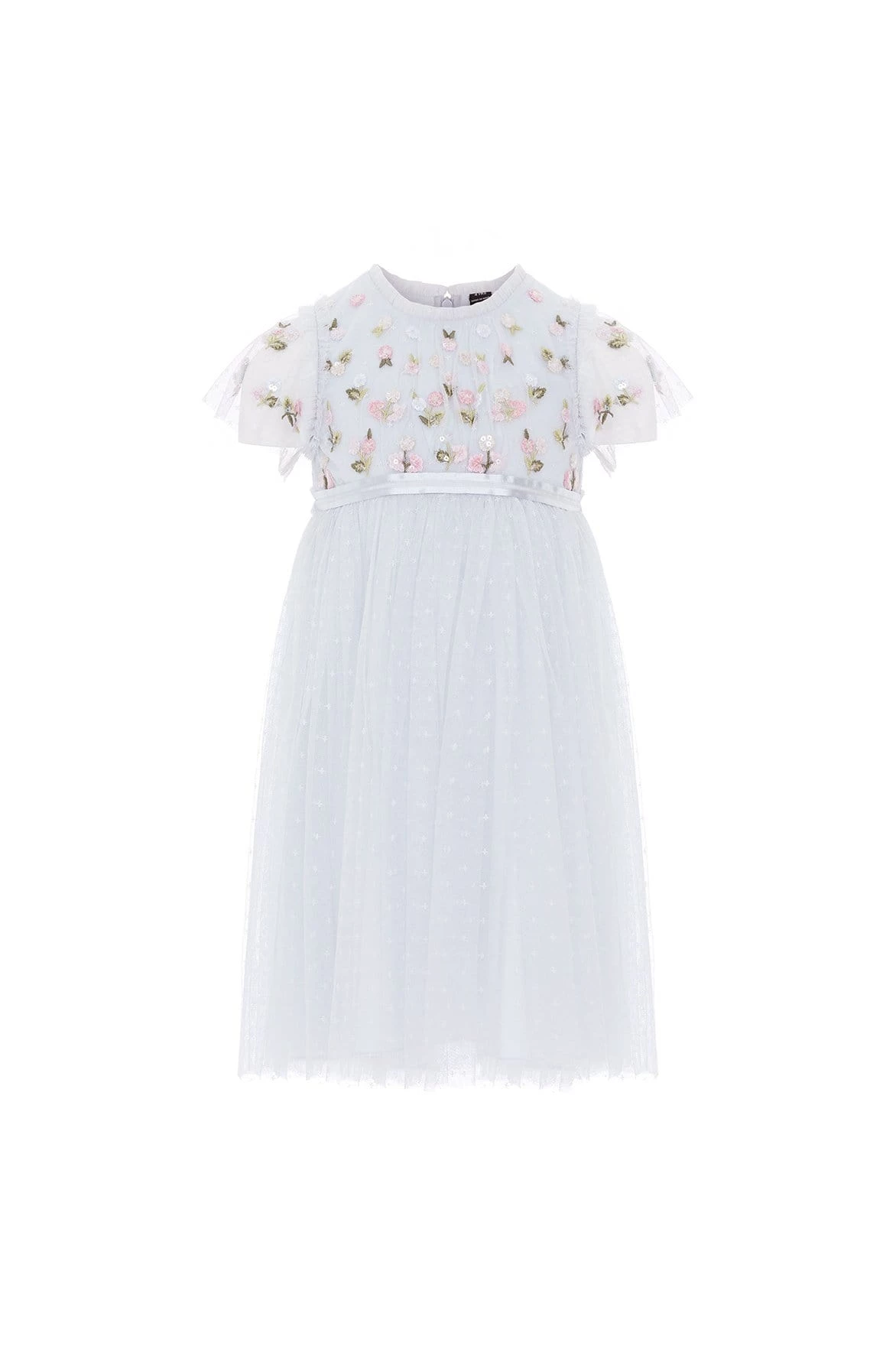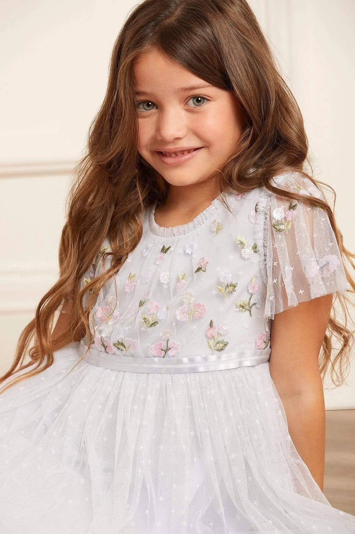 NEW SEASON | The Serefina Rococo Bodice KIDS Dress in Ice Blue. Decorated beautifully with floral cluster motifs in soft pastel tones scattered throughout. The skirt has generous box pleats inspired by archive couture to create dramatic volume and movement. Make the Serefina her new wardrobe favourite.
