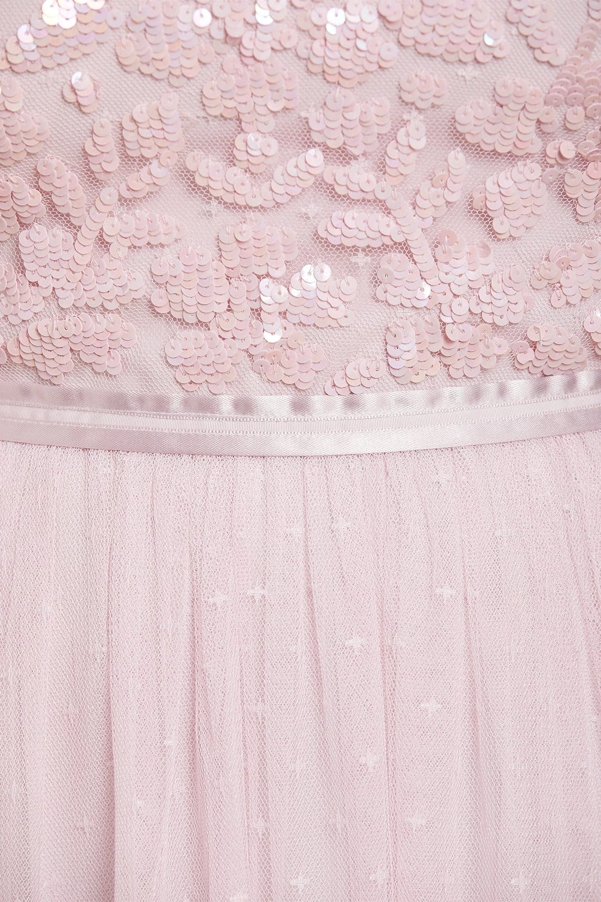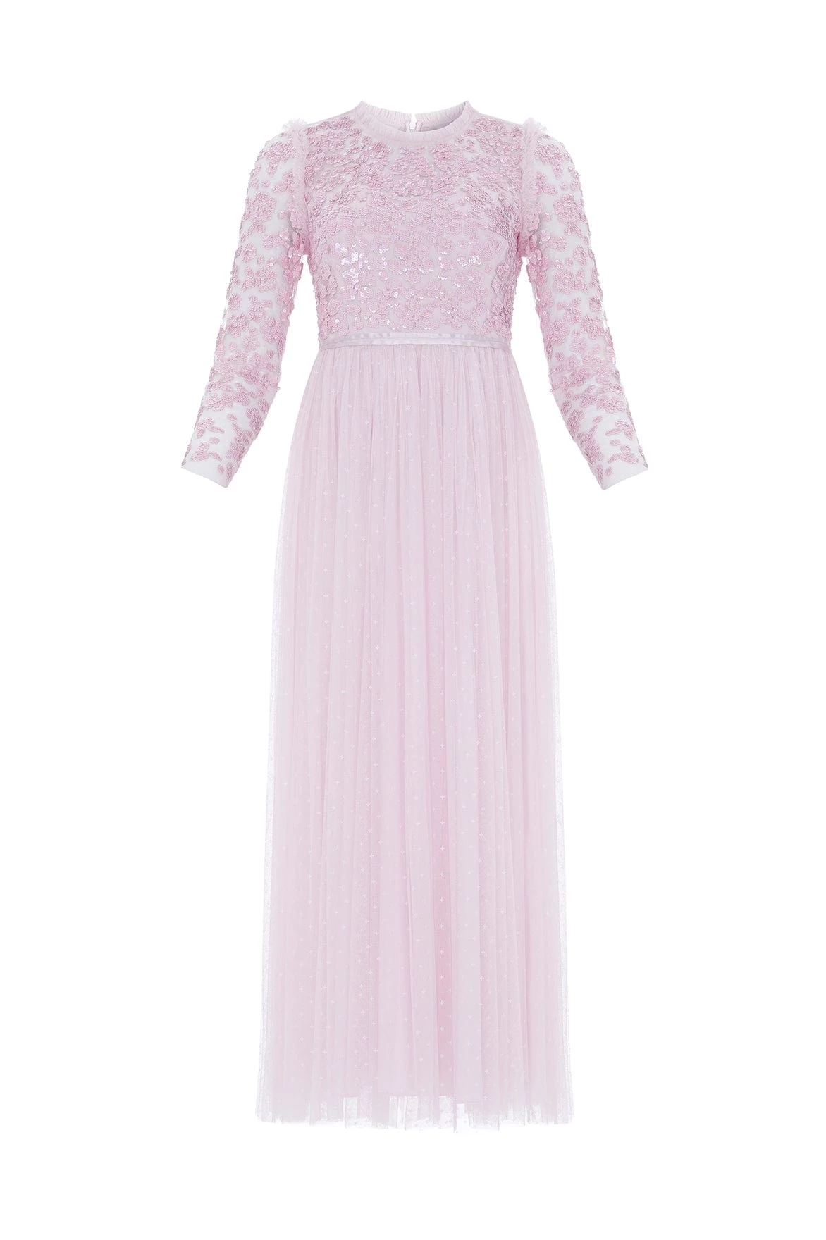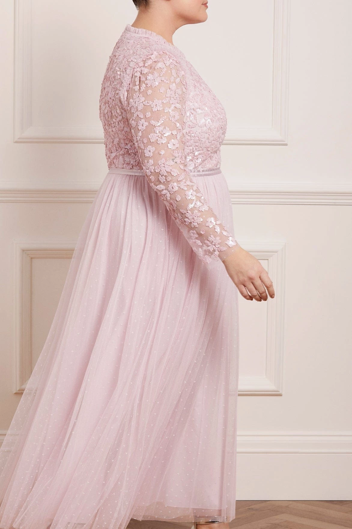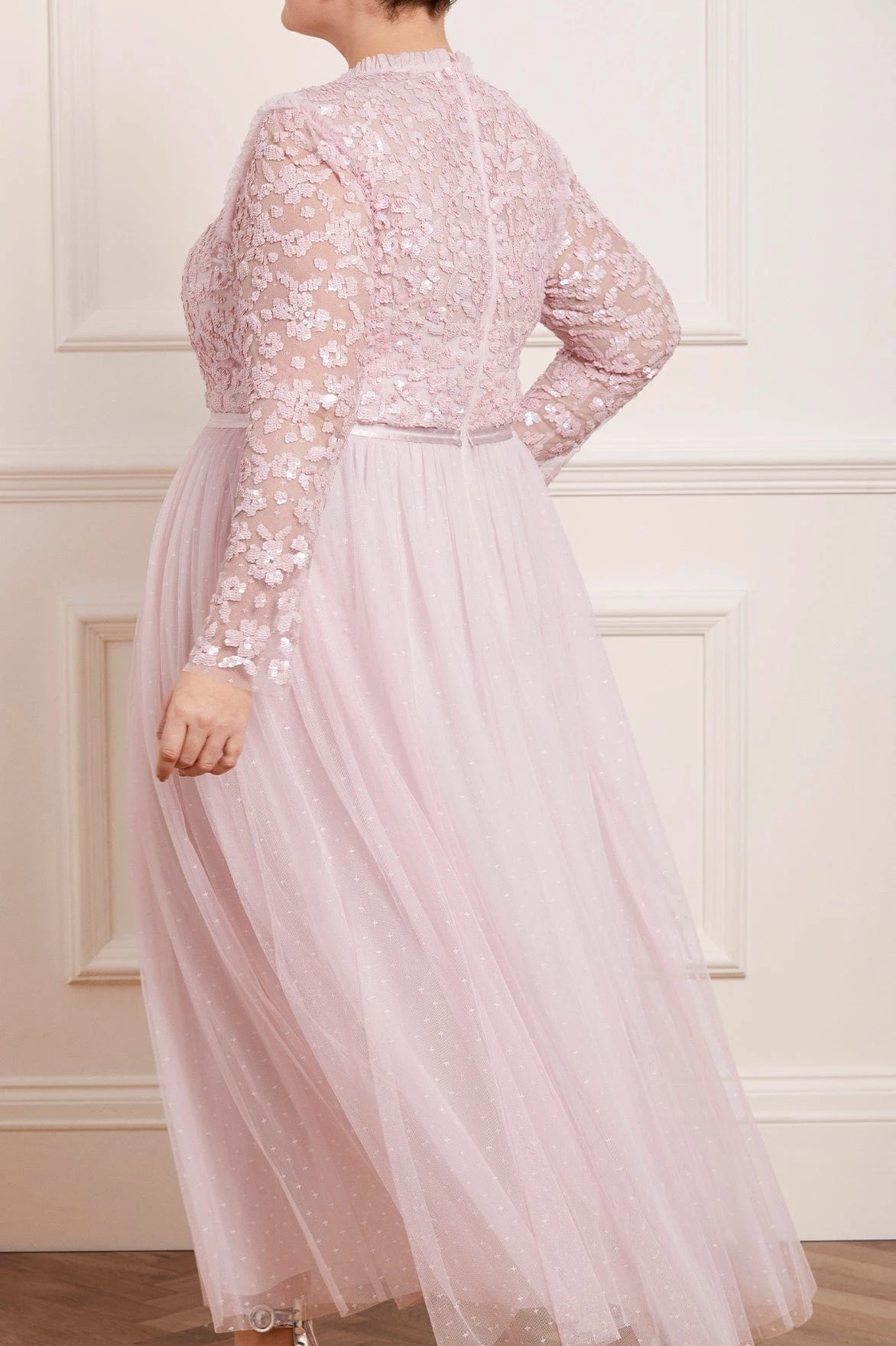 The Amalie Long Sleeve Bodice Ankle Gown in Wisteria. Featuring a bodice decorated with intricate, shimmering sequins and floral motifs. This gown is designed with a layered tulle skirt featuring ‘x’ kiss motifs throughout, adding subtle texture. The perfect gown for your next occasion.