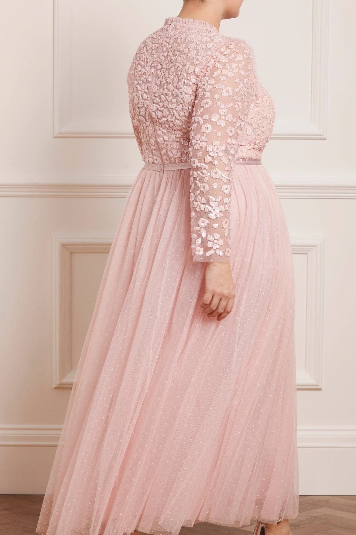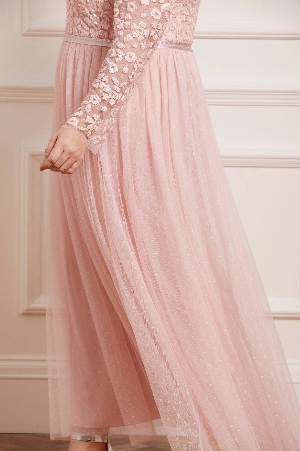 The Amalie Bodice Long Sleeve Ankle Gown in Seashell Coral. Featuring a bodice decorated with intricate shimmering sequins and floral motifs, this gown is designed with a layered tulle skirt featuring ‘x’ kiss motifs throughout, adding subtle texture. Make this gown your new season go-to.