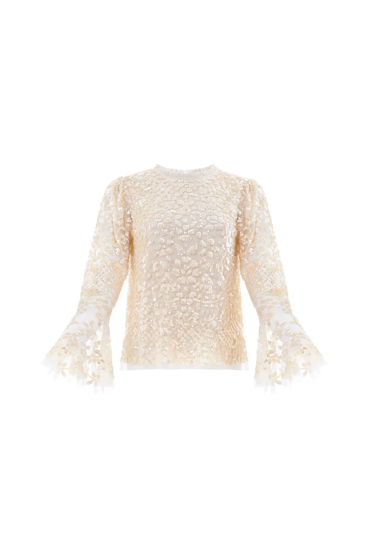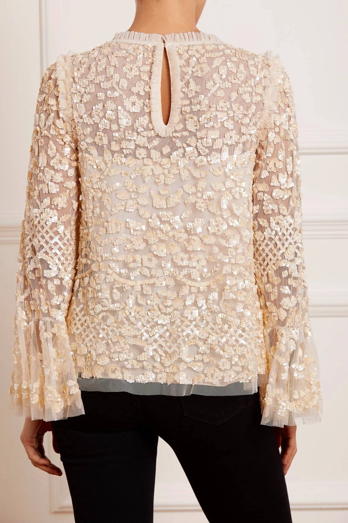 NEEDLE & THREAD EXCLUSIVE. The Amalie Sequin Top in Champagne. Decorated with intricate shimmering sequins and floral motifs, this top is designed with fluted sleeves and cuffs for romantic styling. Make a statement in effortless glamour.