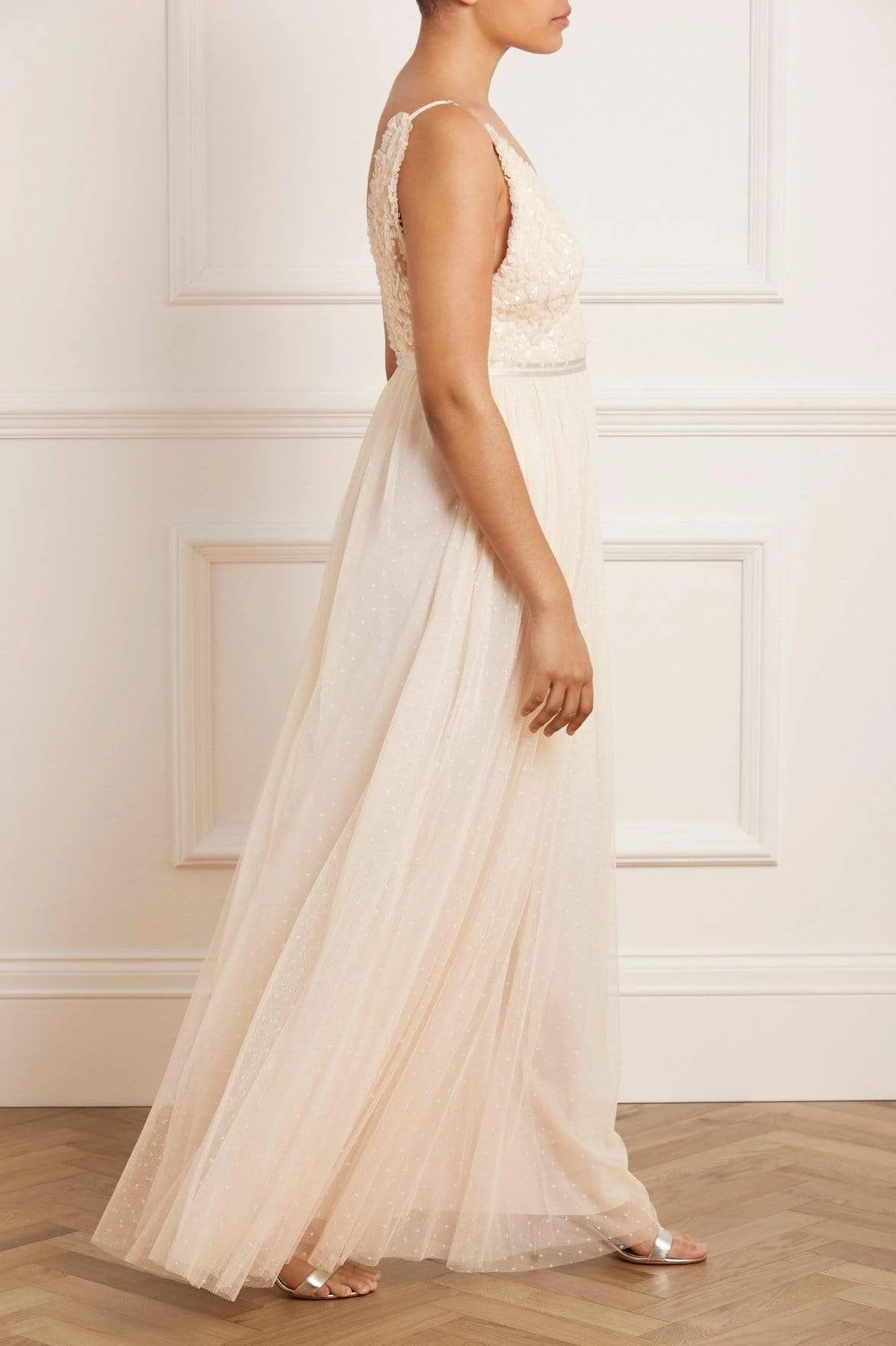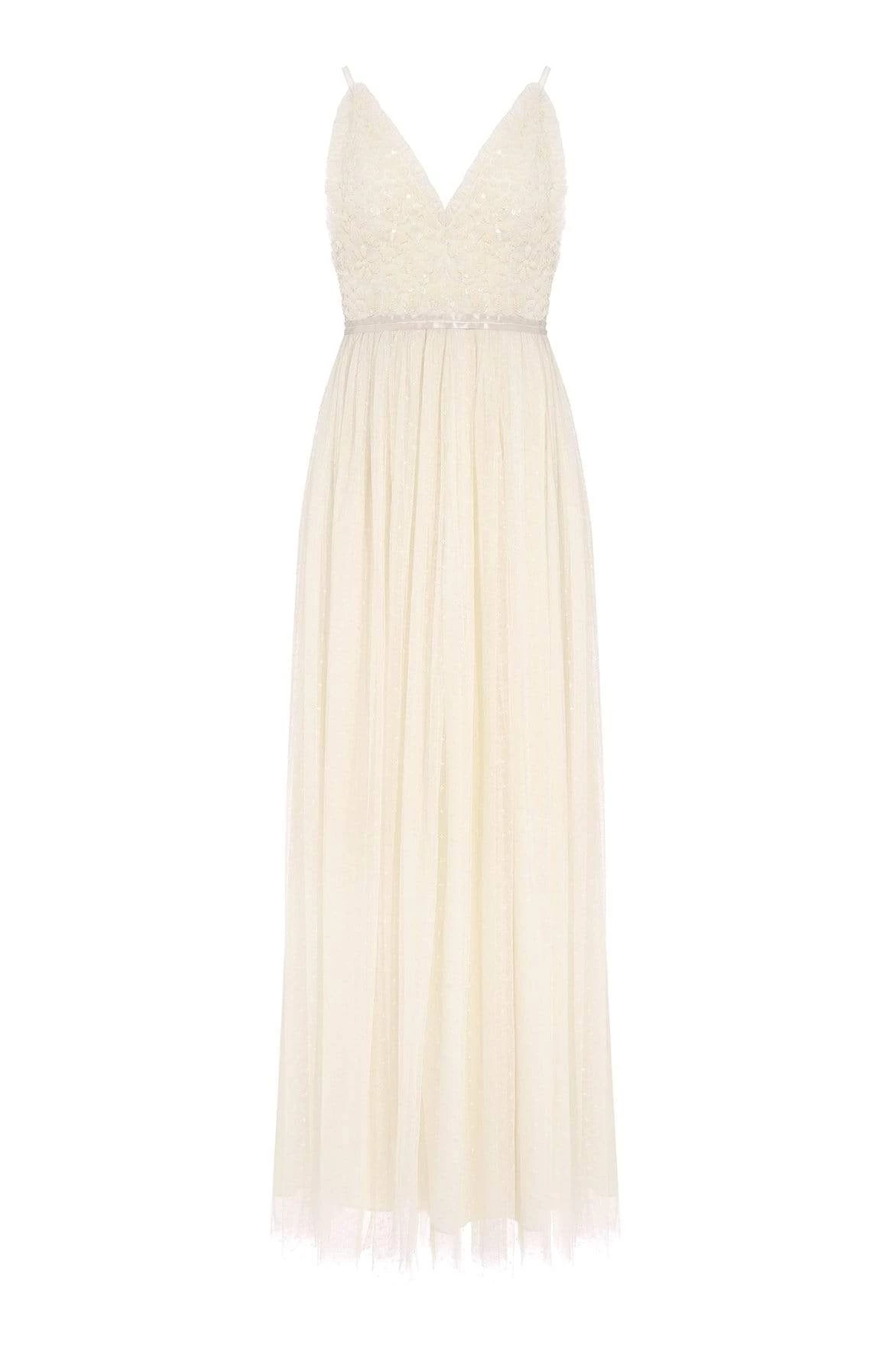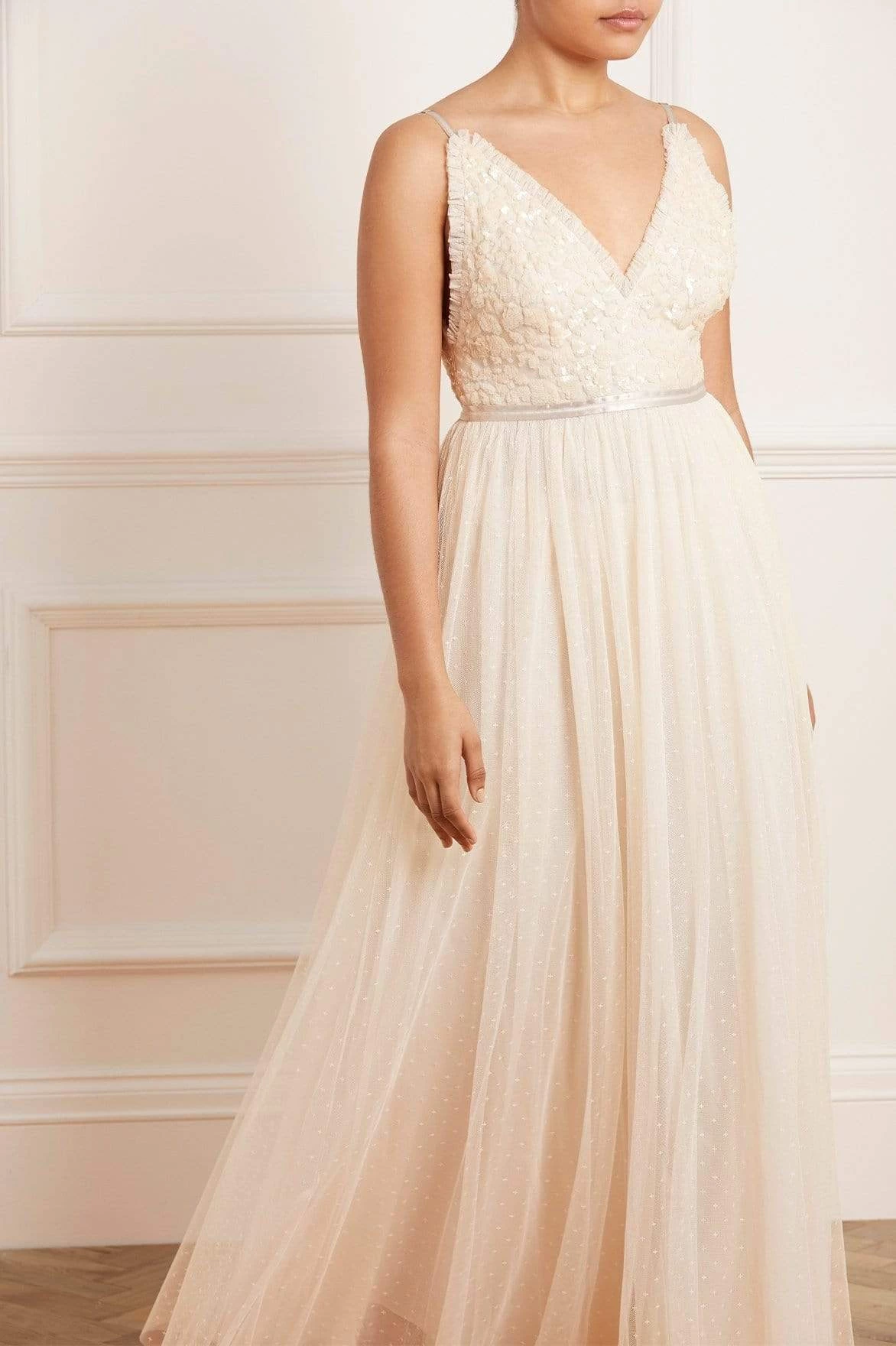 The Aurelia Bodice Cami Gown in Champagne. This Needle & Thread signature style is beautifully designed with floral lace artwork inspired by a vintage tablecloth. Adorned with shimmering sequins on the bodice gently flowing into a soft tulle full length skirt. Make an entrance in the Aurelia.