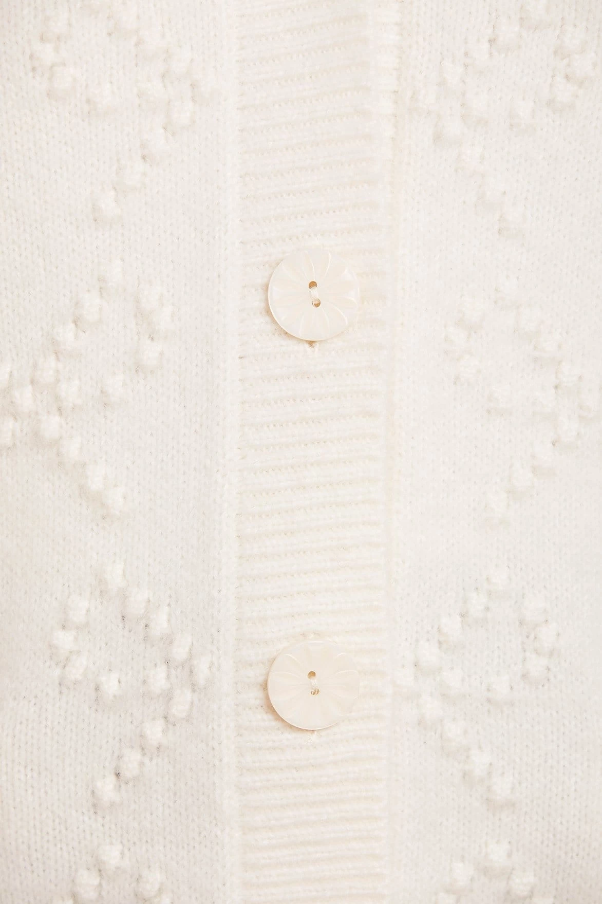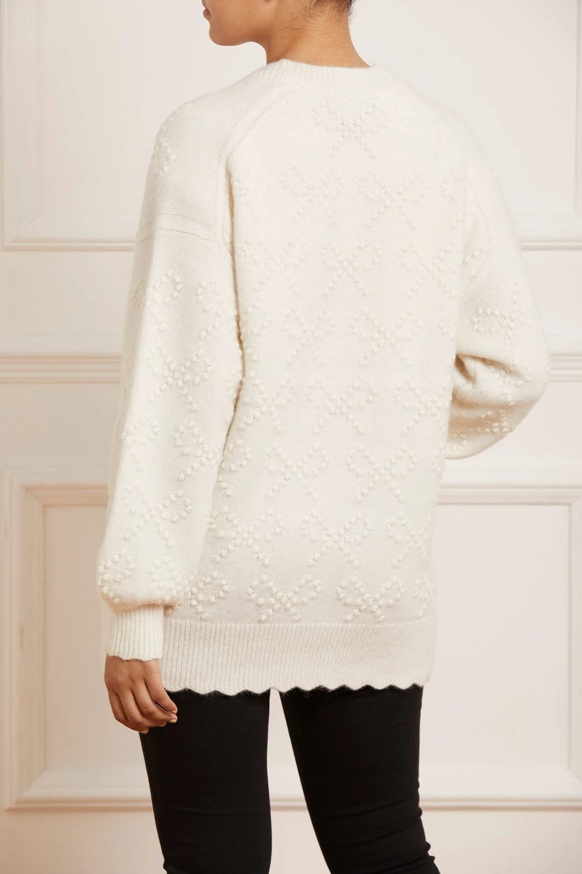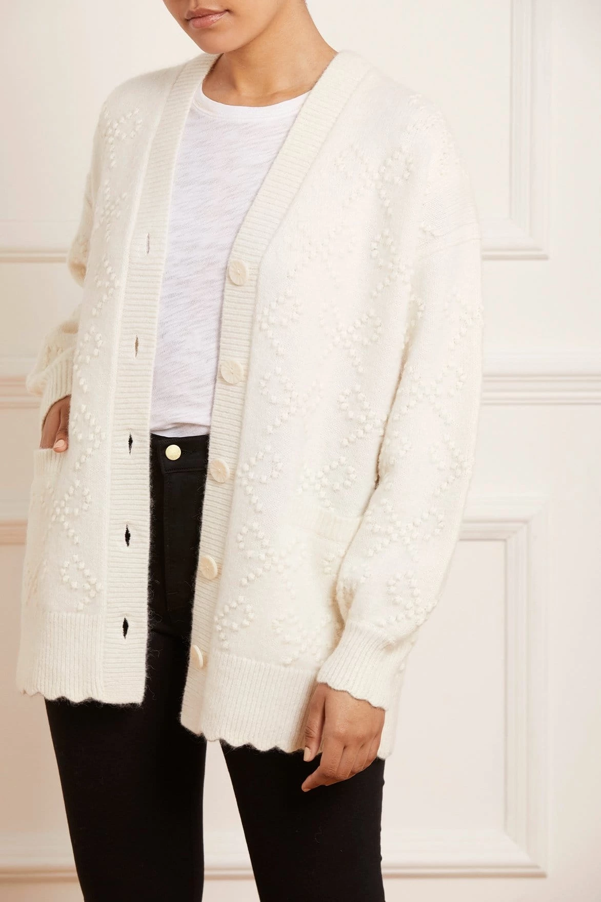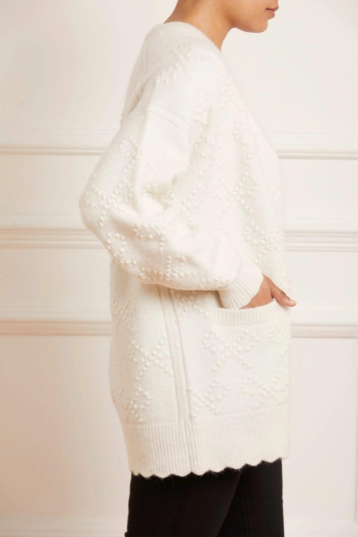 The Bow Stitch Longline Cardigan in Champagne. This chic cardigan is crafted in soft alpaca yarn, creating a fluffy-feel texture. Finished in a wear-with-anything neutral colour decorated with bobble stitches and romantic bow motifs for a touch of playfulness. This comfortable knit is designed with an oversized fit, making it the perfect layering piece. Beautifully fitted with vintage-sourced buttons with an intricate embossed design. The ideal everyday wardrobe staple.