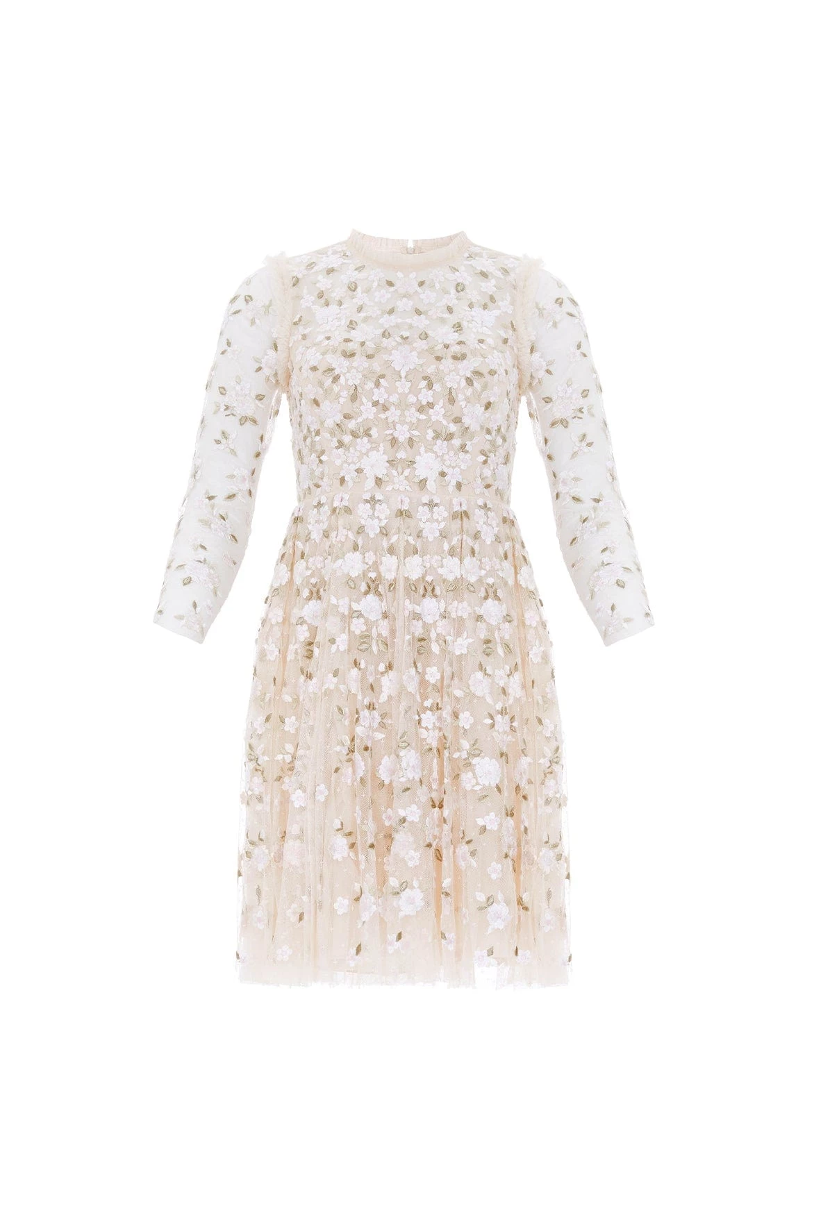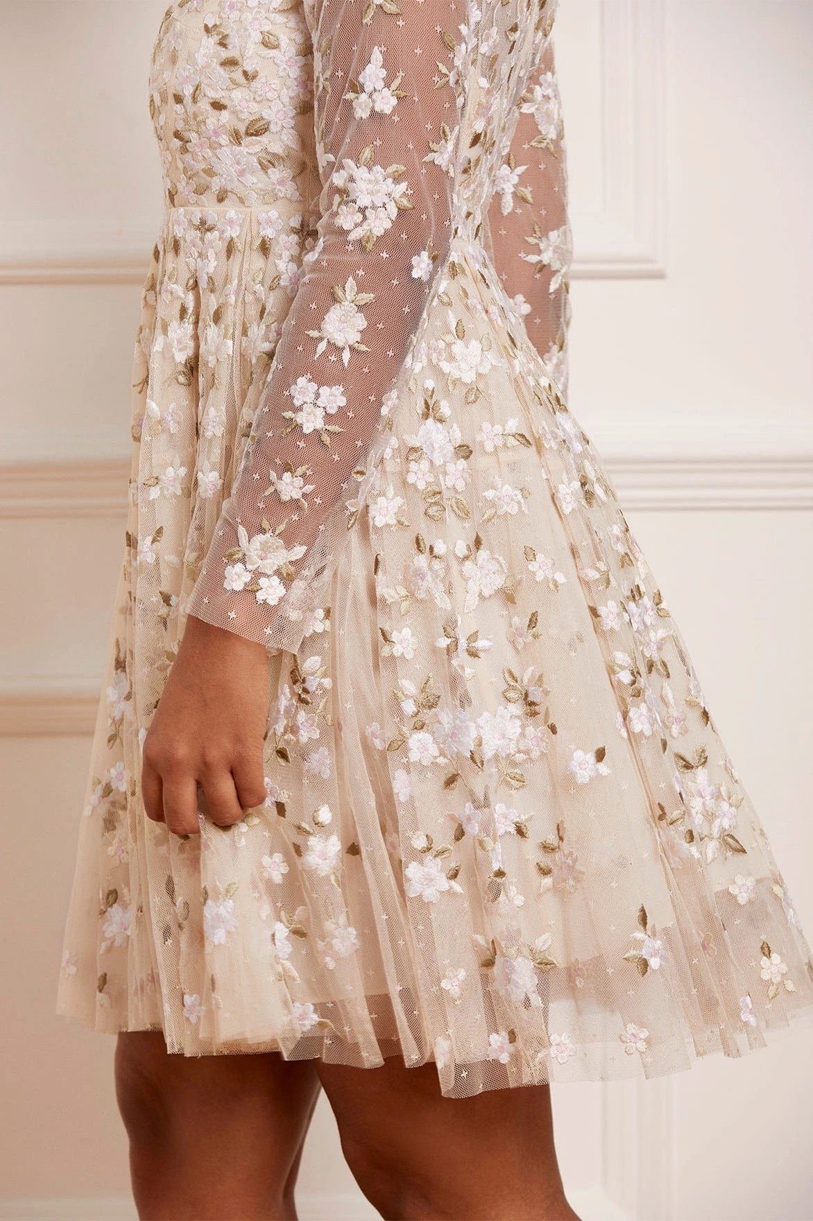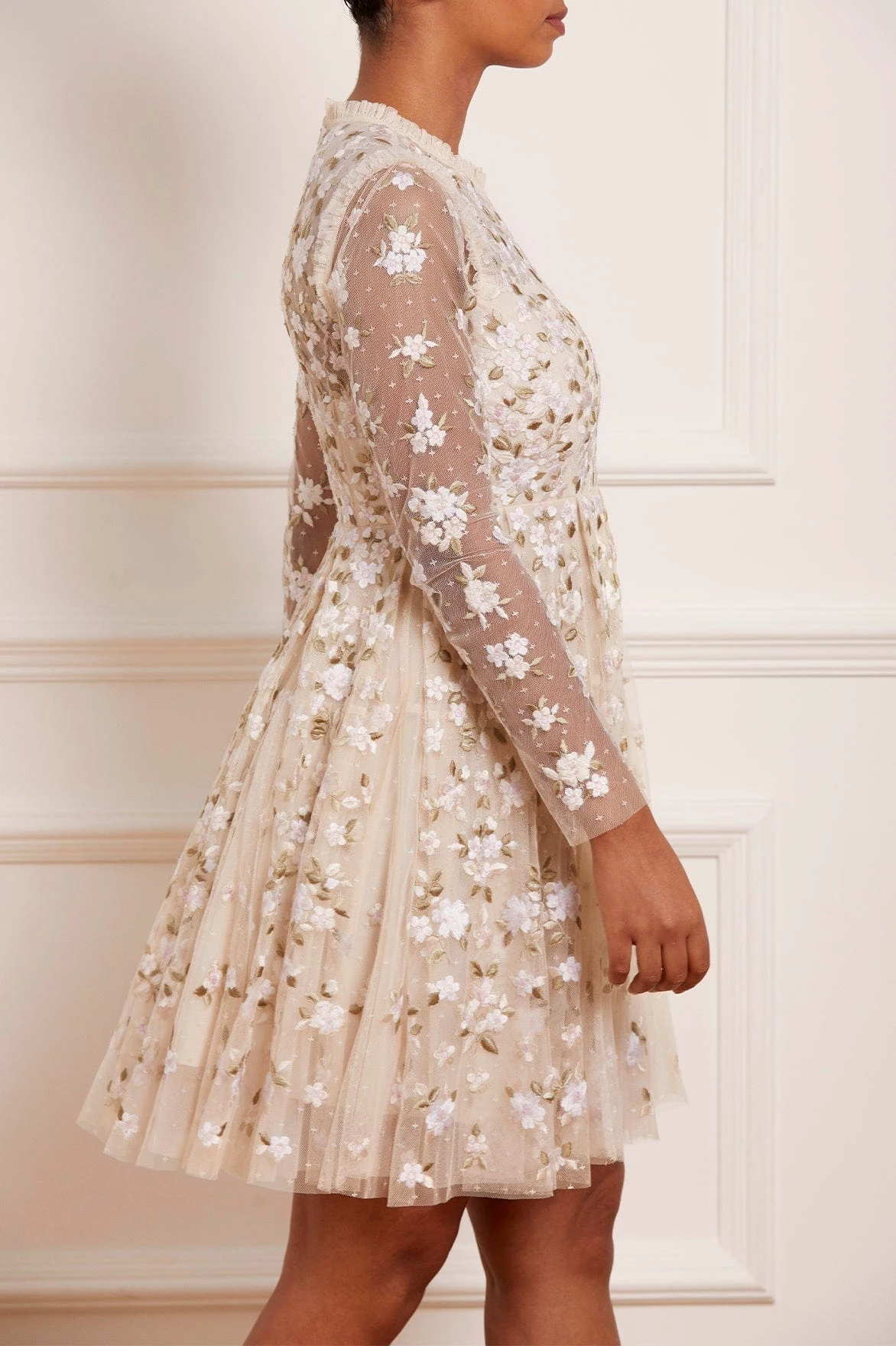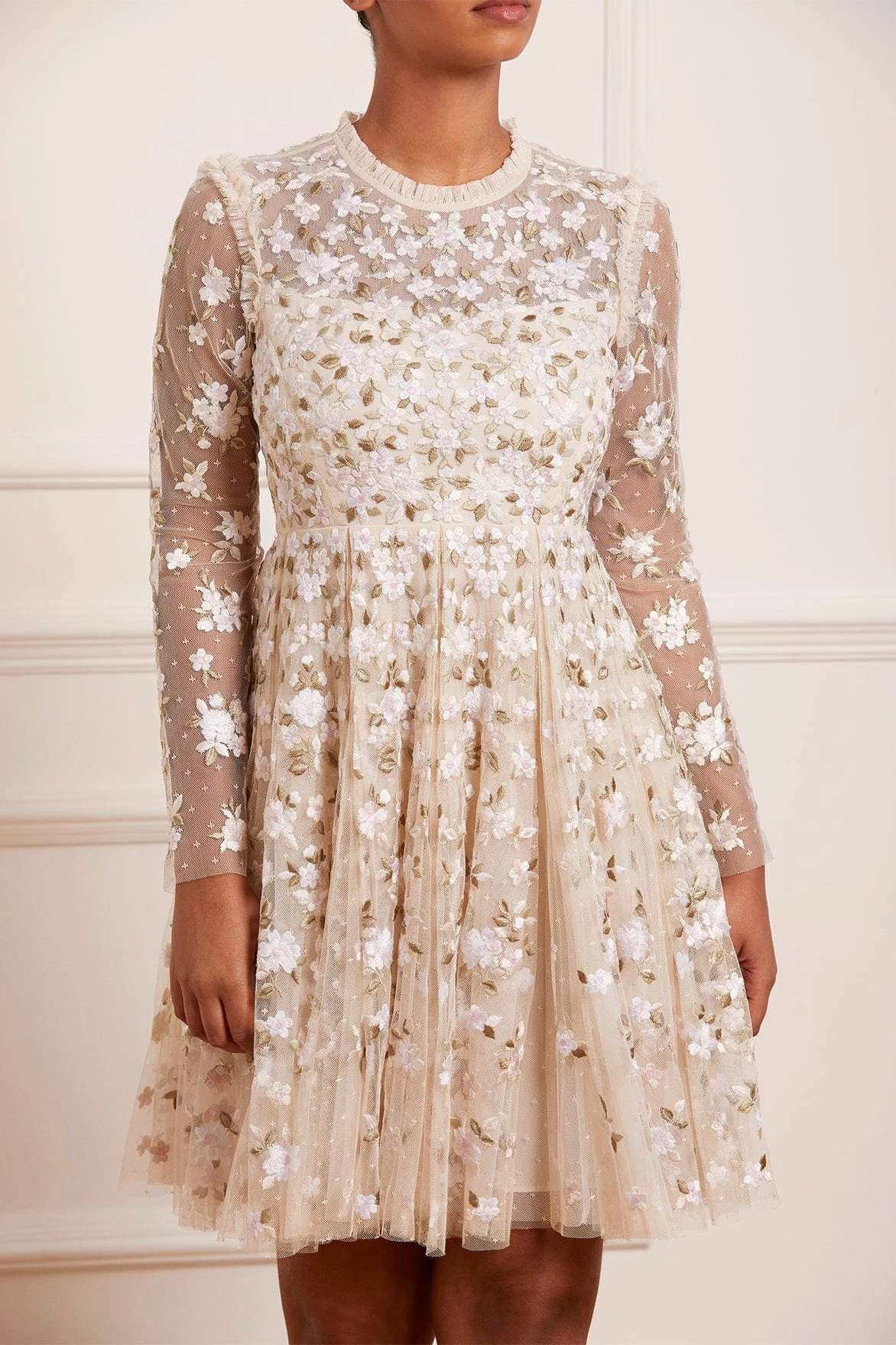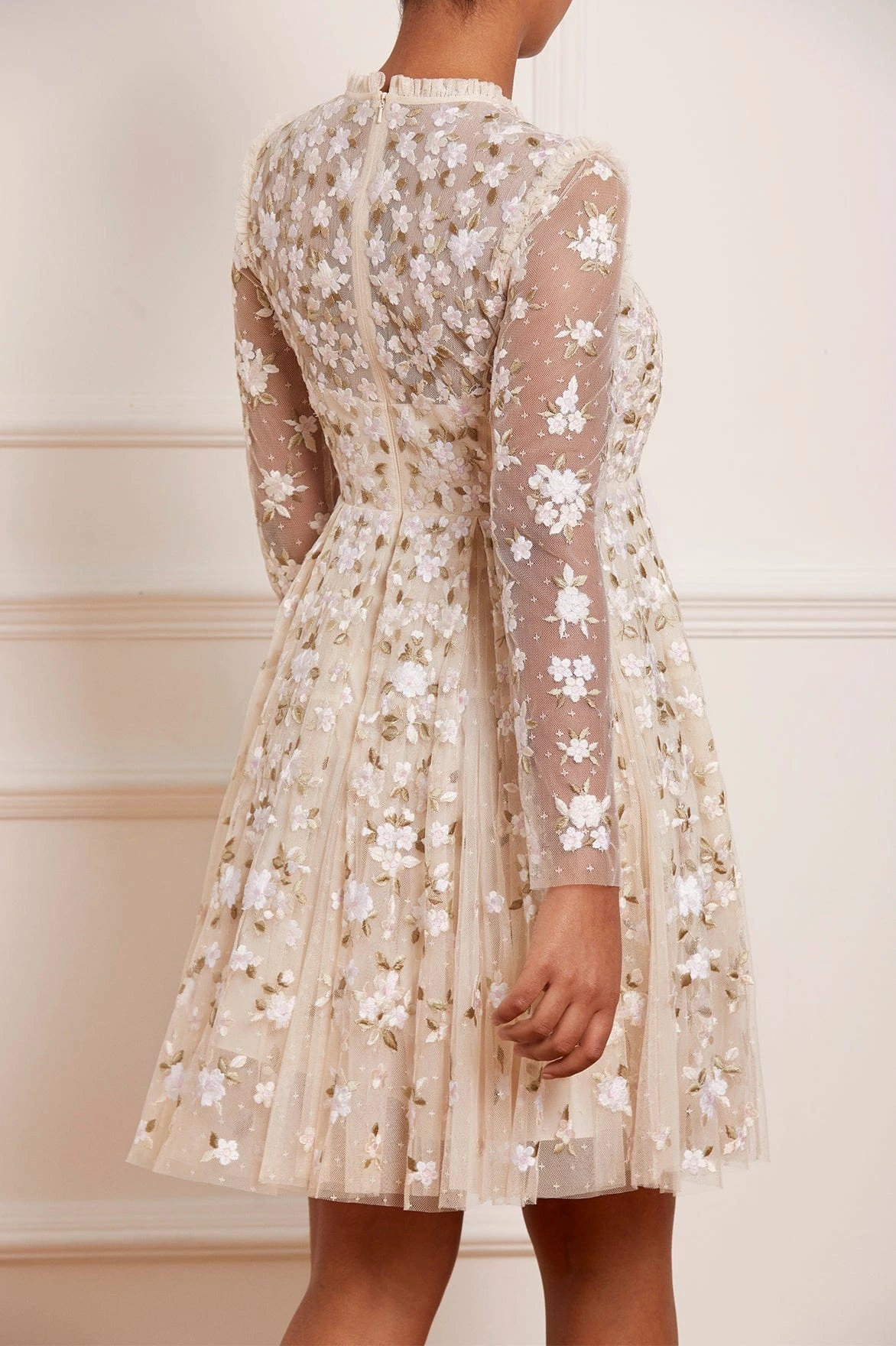 The Camellia Ditsy Mini Dress in Champagne / White. A beautifully classic Needle & Thread style. The artwork of this dress is embroidered beautifully with floral motifs on soft, pretty tulle. This dress features a full pleated skirt, creating a voluminous shape for added movement. Be the first to make a statement in the Camellia.