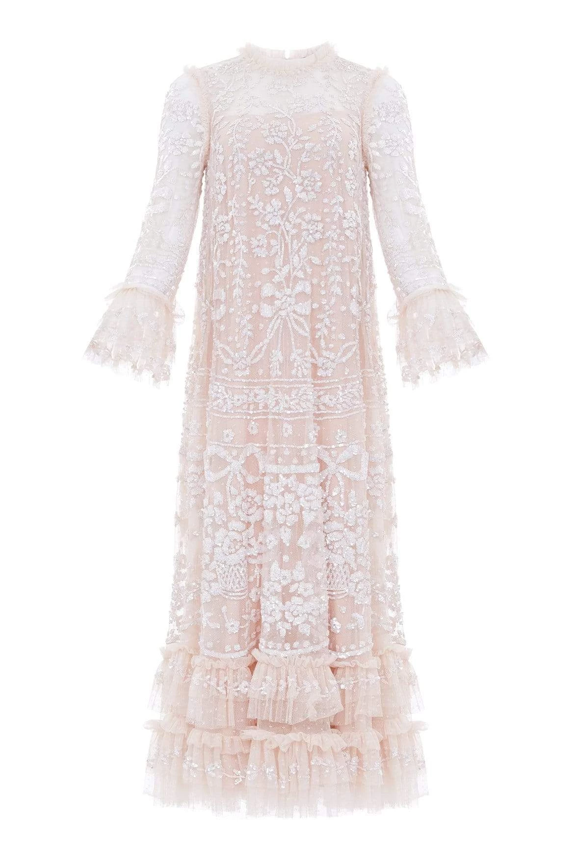 The Celia Long Sleeve Ankle Gown in Strawberry Icing. This statement long sleeve gown is designed with romantic artwork featuring ornate florals with ribbon bows, densely filled with shimmering ivory sequins and exquisite detailing. Crafted with an effortless, loose fit with soft, playful tulle frills on the hem and cuffs. A key piece of the collection.