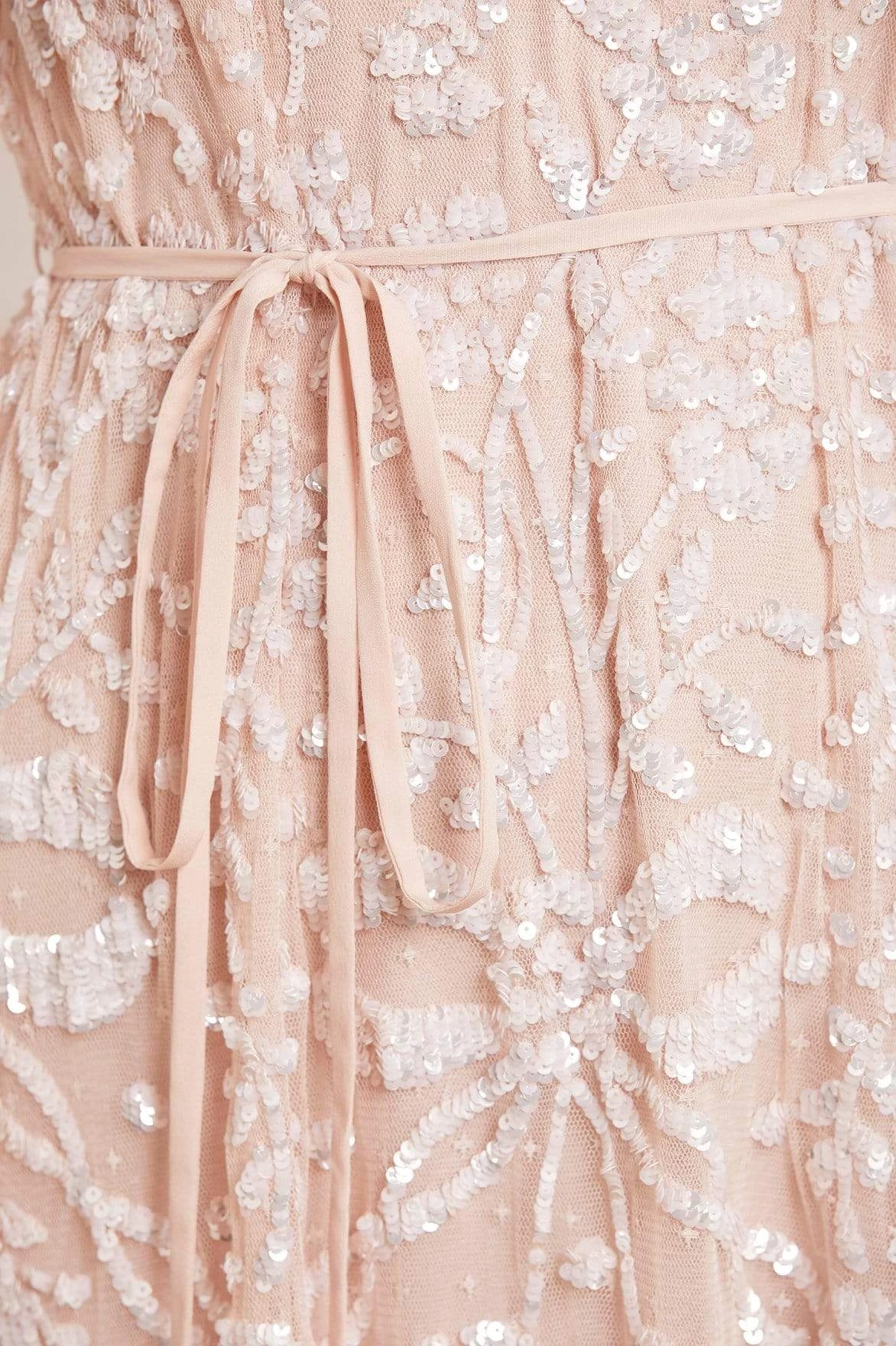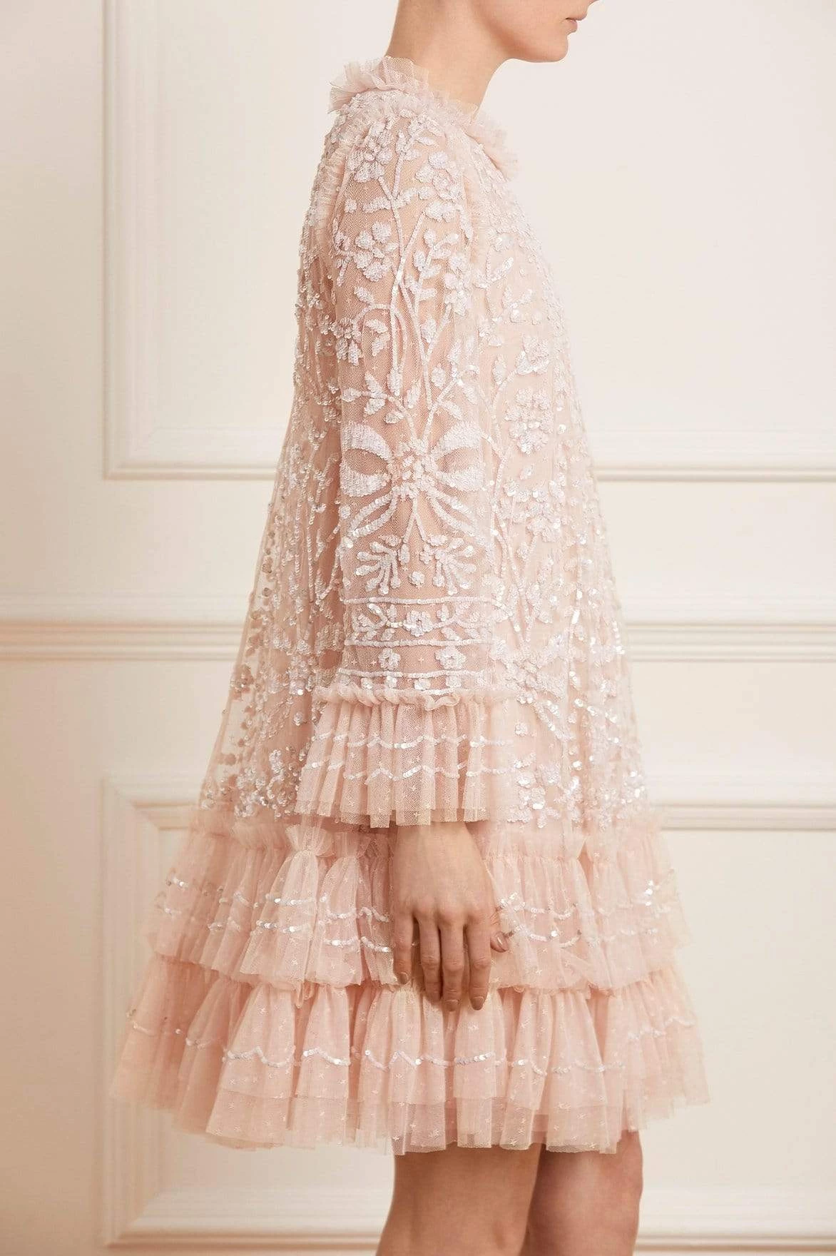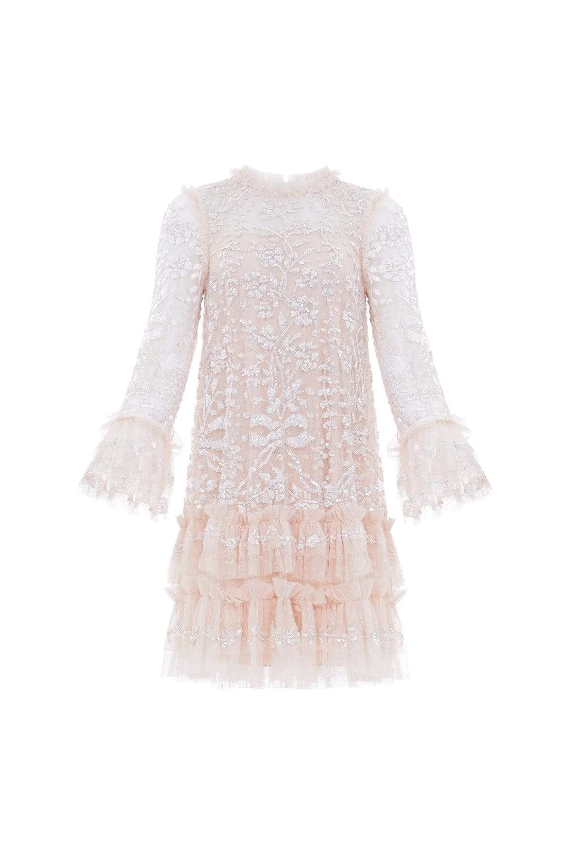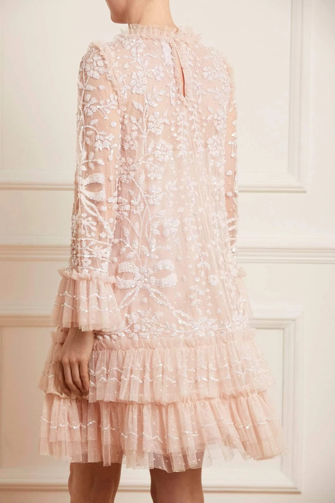 The Celia Long Sleeve Mini Dress in Strawberry Icing. This statement long sleeve dress is designed with romantic artwork featuring ornate florals with ribbon bows, densely filled with shimmering ivory sequins and exquisite detailing. Crafted with an effortless, loose fit with soft, playful tulle frills on the hem and cuffs. A key piece of the collection.