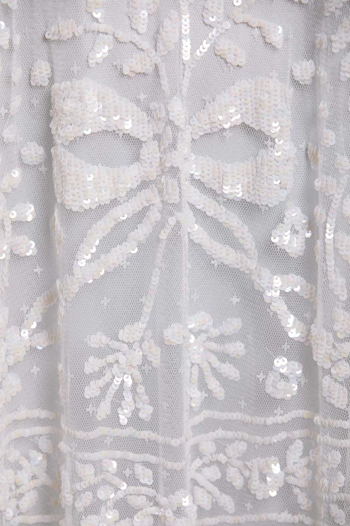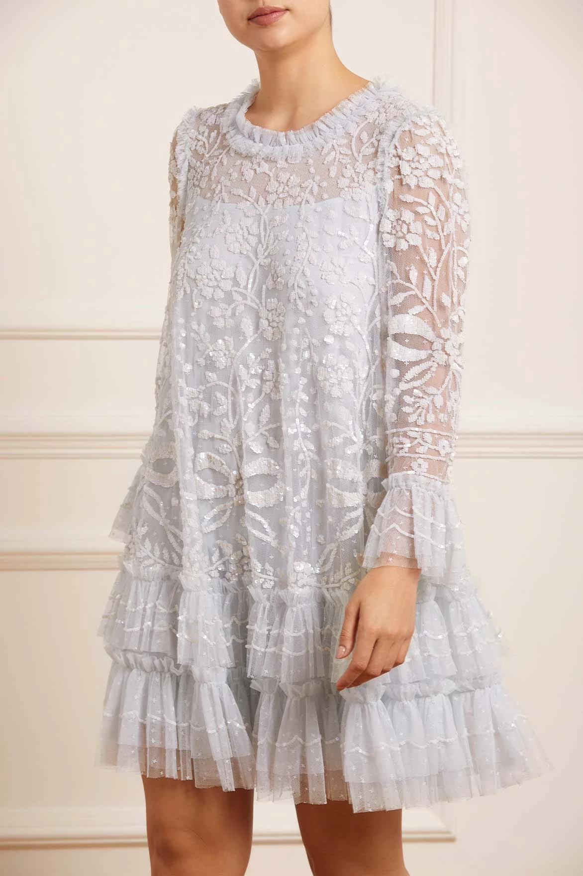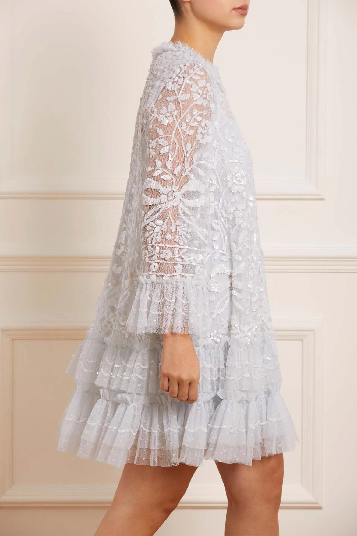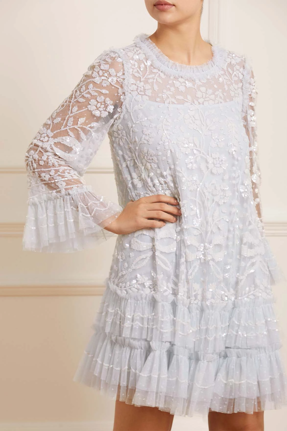 The Celia Long Sleeve Mini Dress in Ice Blue. This statement long sleeve dress is designed with romantic artwork featuring ornate florals, ribbon bows densely filled with shimmering ivory sequins and exquisite detailing. Crafted to produce an effortless, loose fit with soft, playful tulle frills on the hem and cuffs. A key piece in our collection.