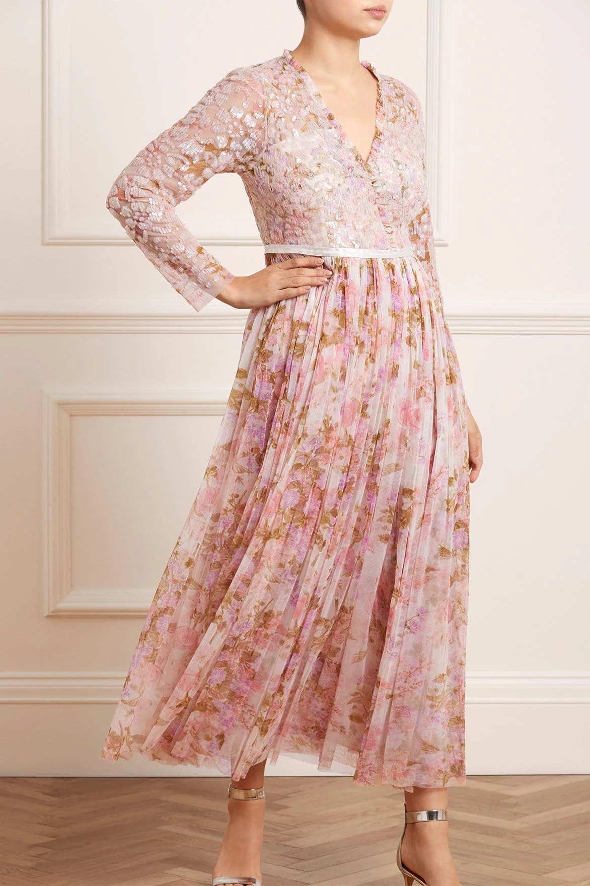 The Darling Meadow V Neck Bodice Ankle Gown in Pink / Multi. This statement gown is beautifully printed with painted flowers and garden motifs, inspired by a vintage French fabric. The bodice is adorned with shimmering, iridescent sequins in romantic floral motifs and features our signature Needle & Thread satin ribbon at the waist. Crafted with layers of tulle creating romantic, delicate movement. The perfect gown for every special occasion.