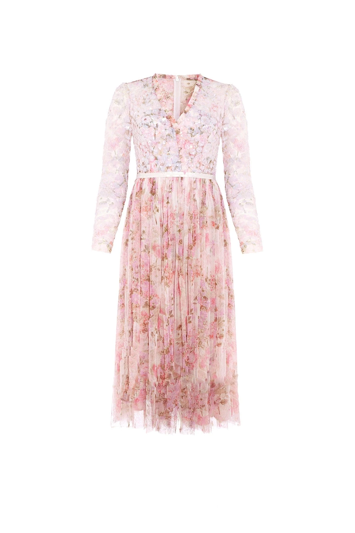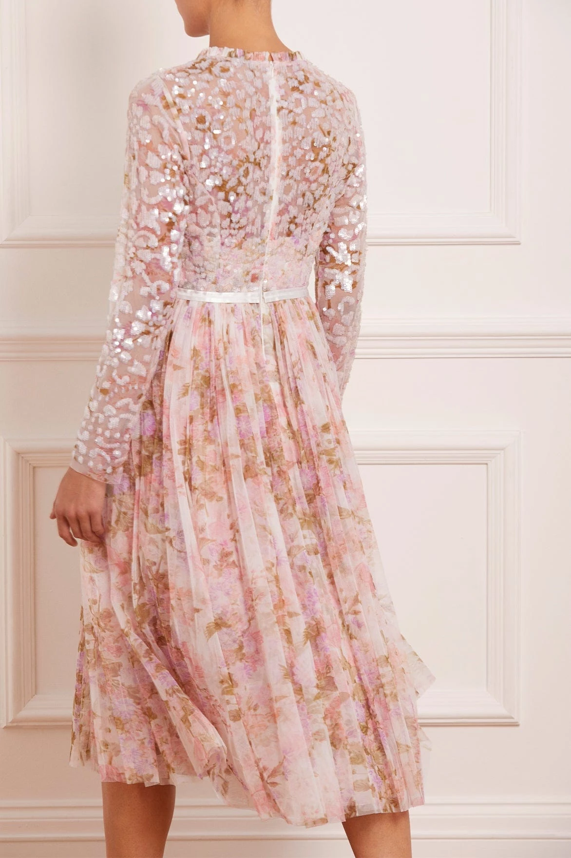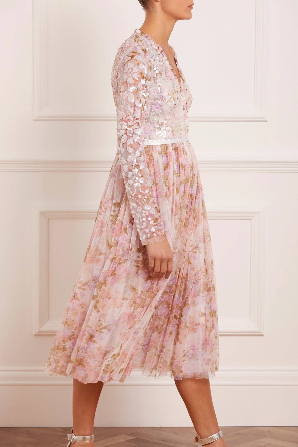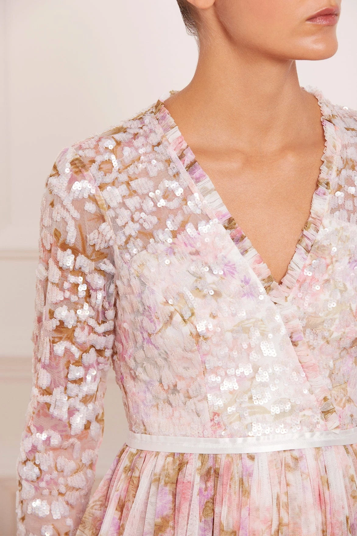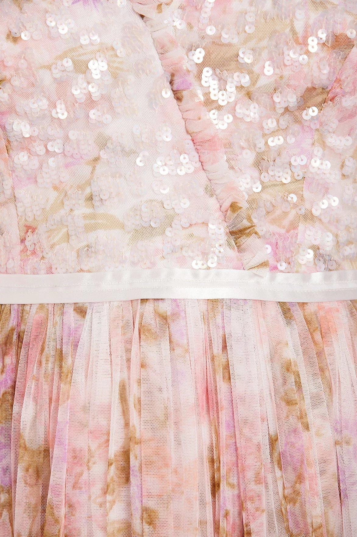 – Floral printed tulle decorated with tonal iridescent sequins