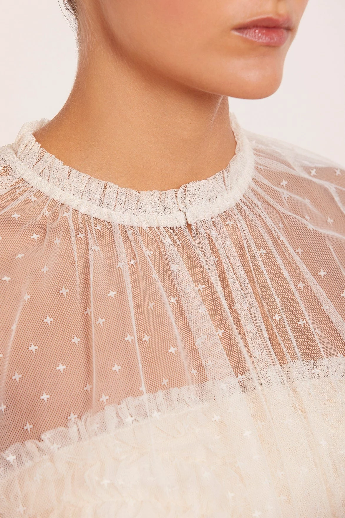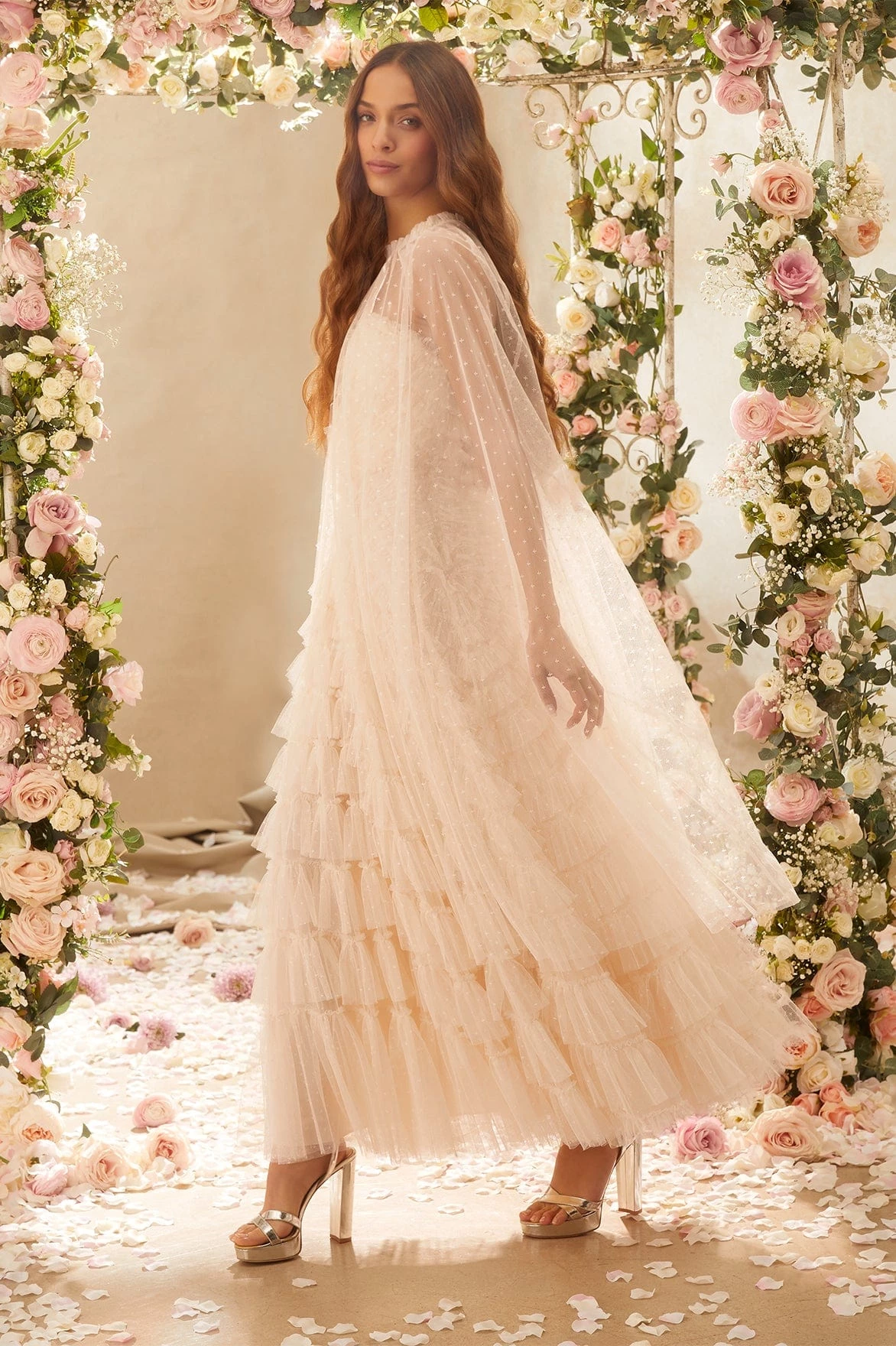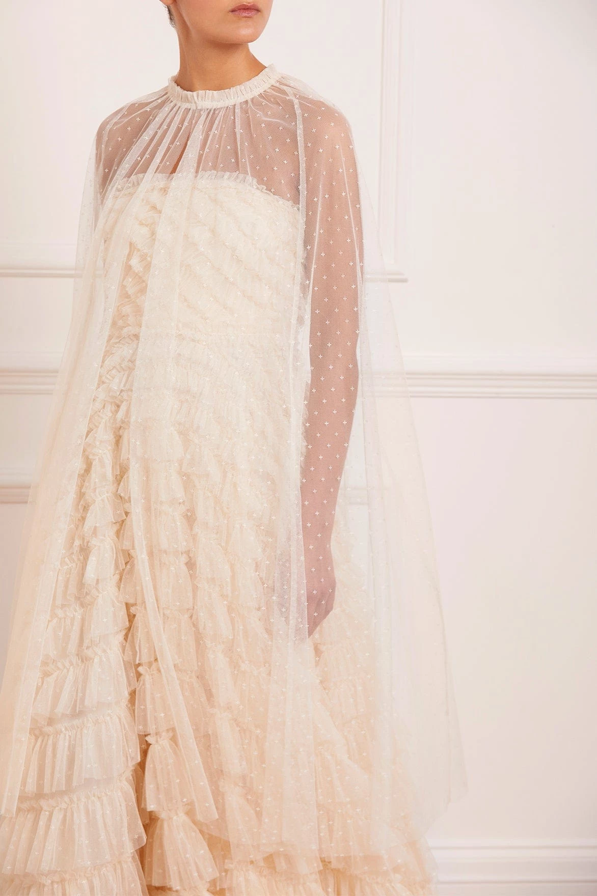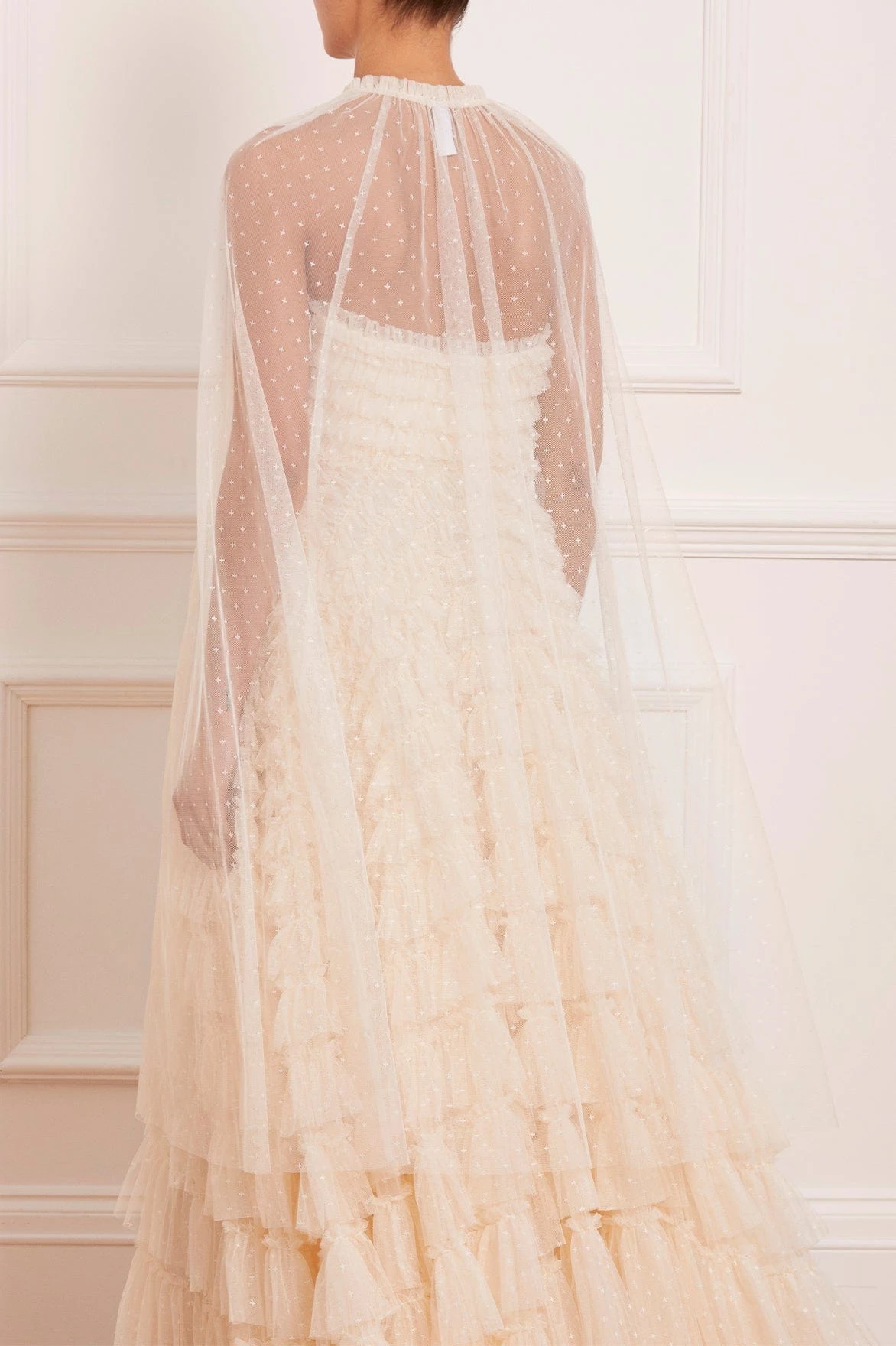 NEW SEASON |NEEDLE & THREAD EXCLUSIVE. The Elizabeth Rose Midaxi Cape in Champagne. This cape is delicately textured with ‘x’ kisses tulle and signature Needle & Thread frills across the neckline. Beautifully designed to style layer over our Elizabeth Rose Corset Ankle Gown.