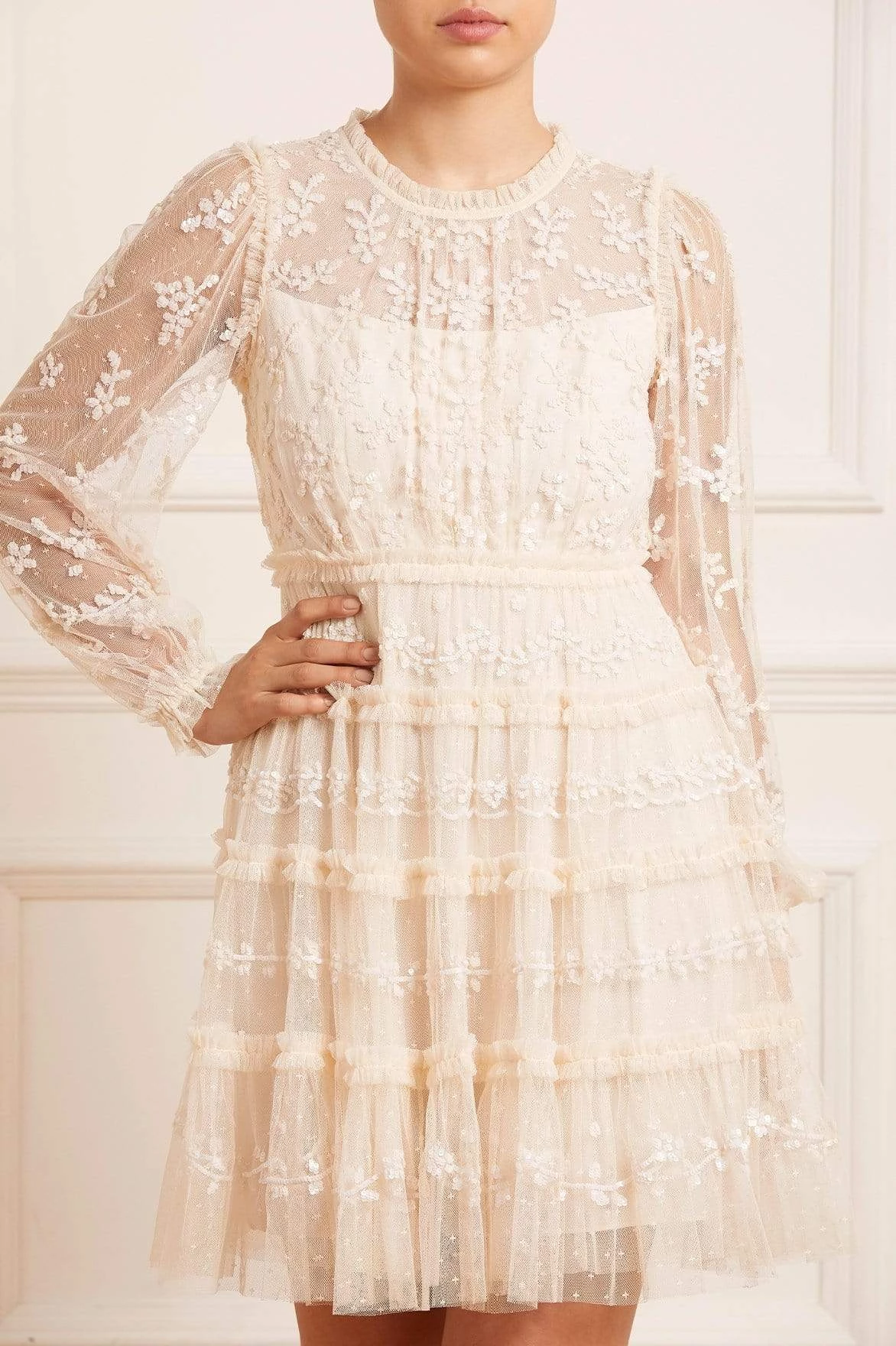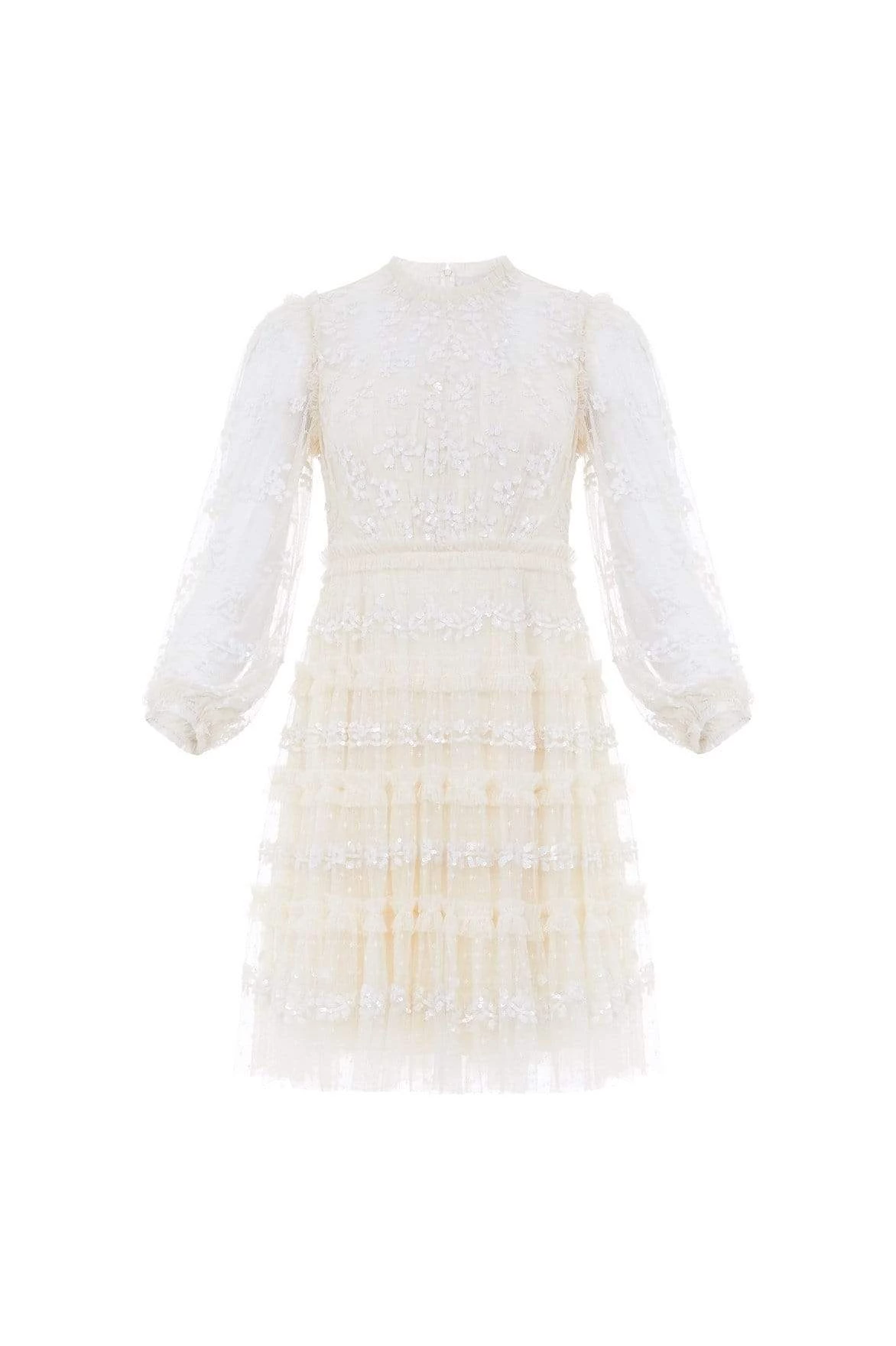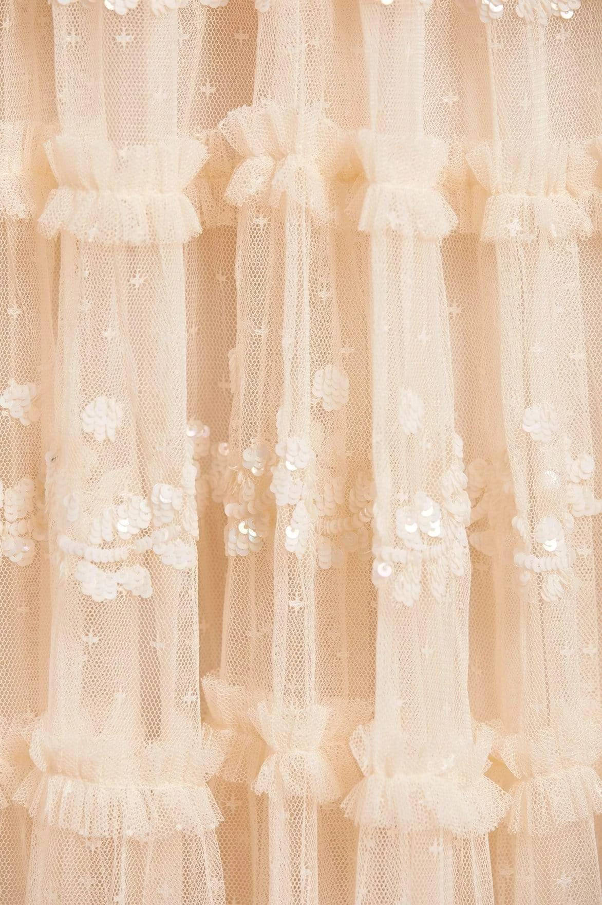 The Eve Sequin Mini Dress in Champagne. This dress is romantically designed with a flattering, gently gathered bodice and full sleeves. Crafted with layers of our signature kisses tulle, and intricately adorned with shimmering sequin borders in pretty, lace-inspired designs. Make a statement in the Eve.