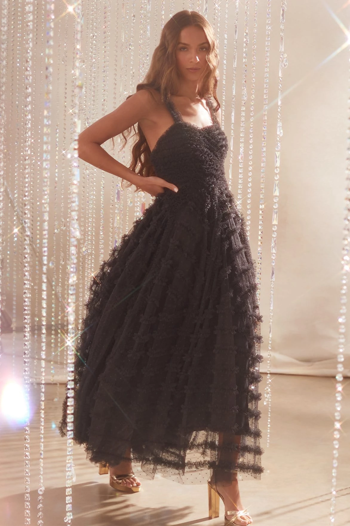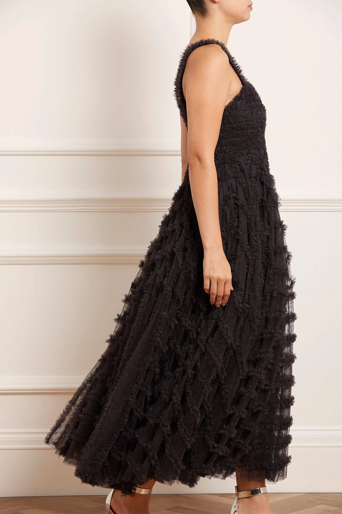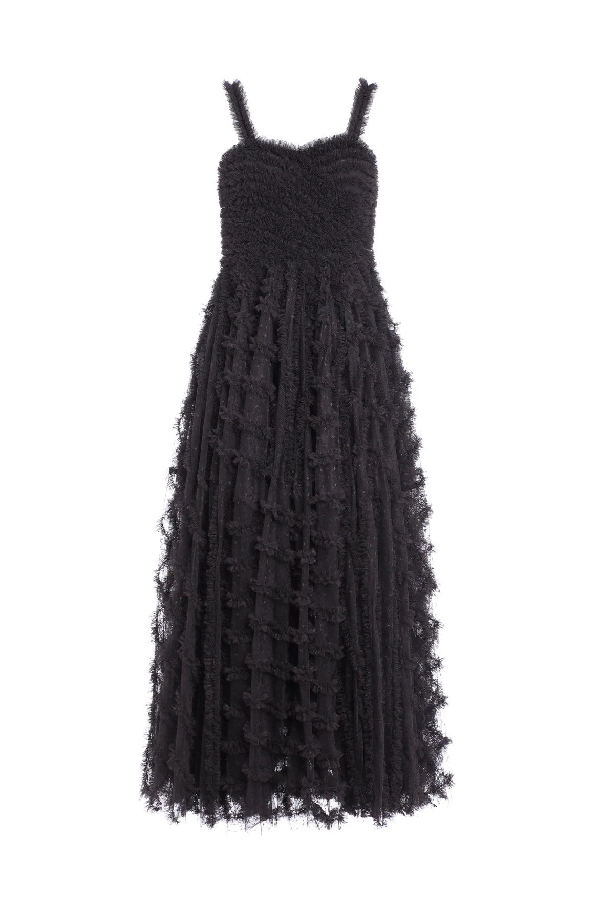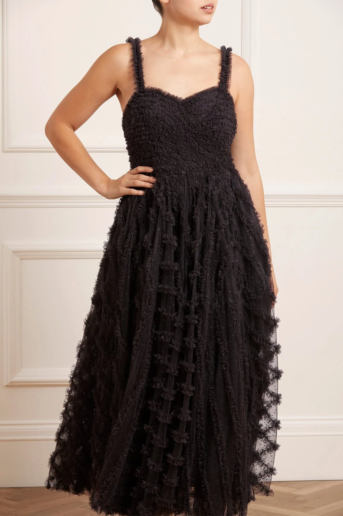 NEEDLE & THREAD EXCLUSIVE. The Florence Cami Ankle Gown in Graphite. This statement gown is designed with gentle ruffle details throughout for a romantic, flattering effect. The skirt of the dress is crafted in circular pieces to create dramatic volume and a sweeping hemline. A key piece of the season.