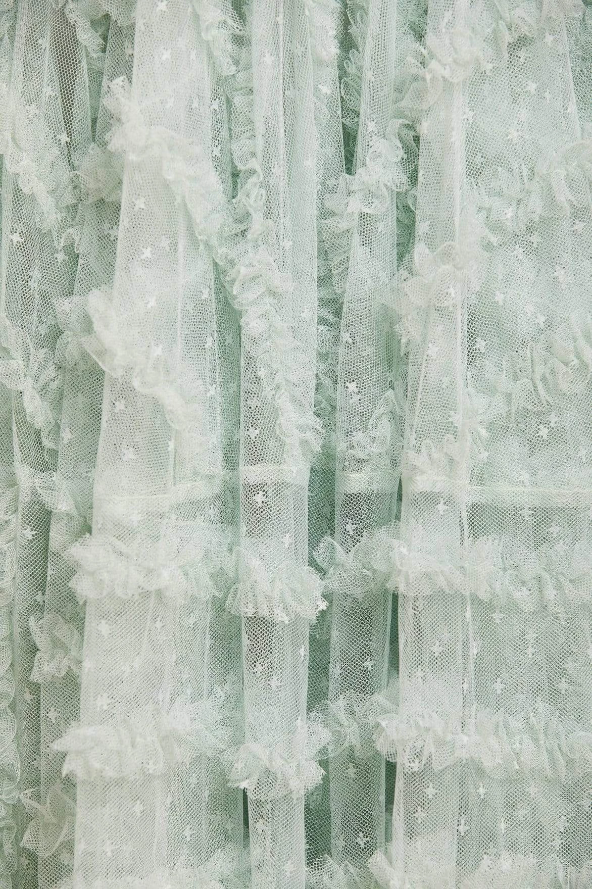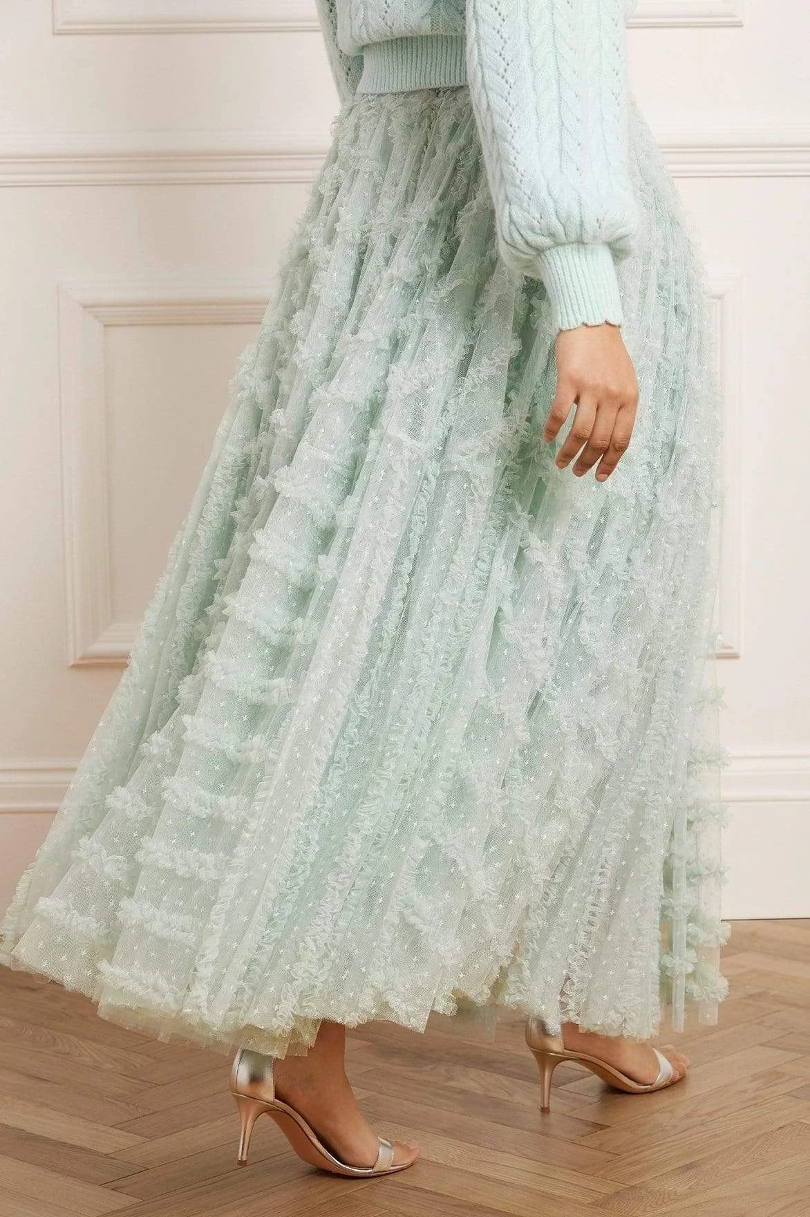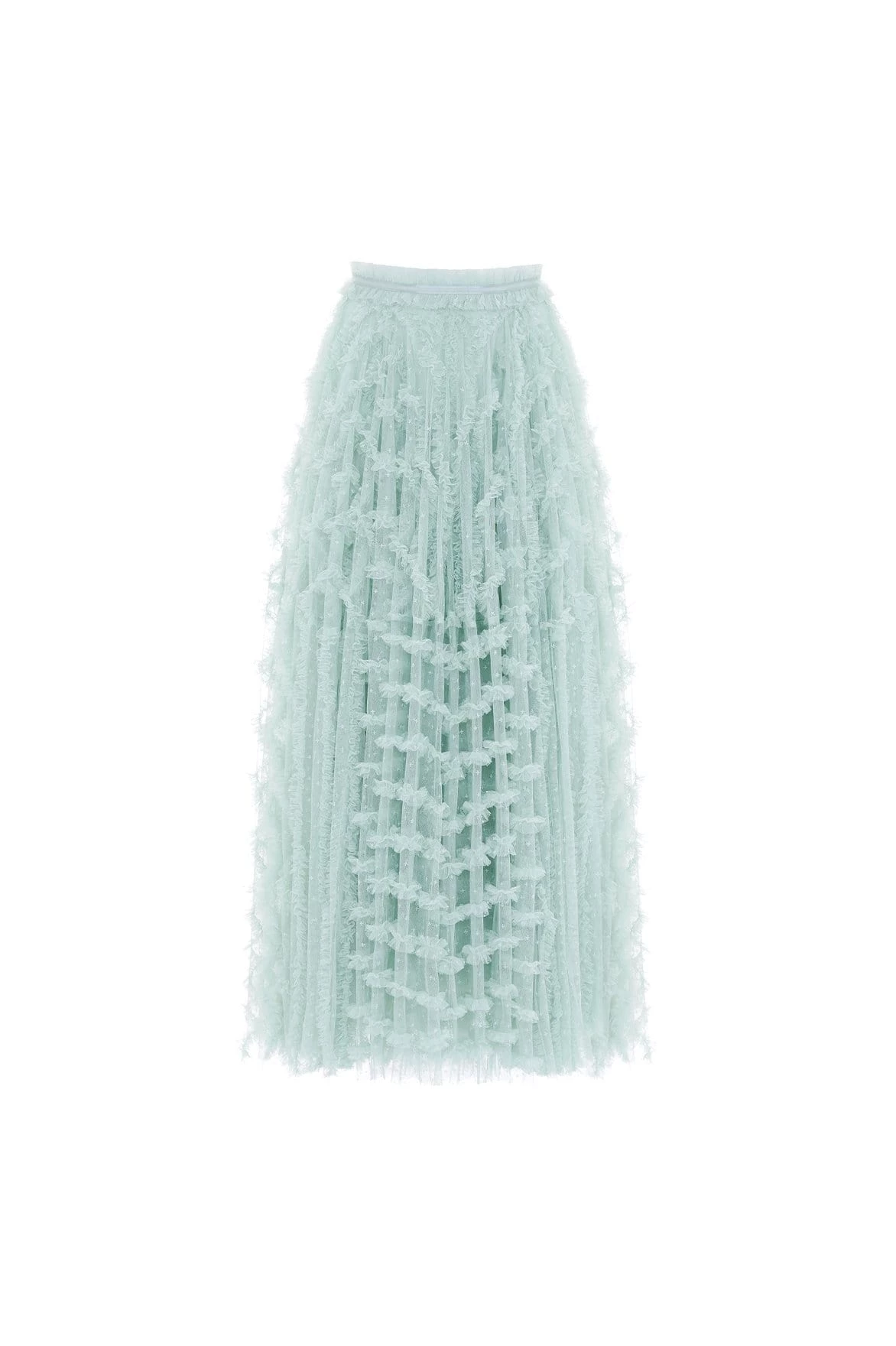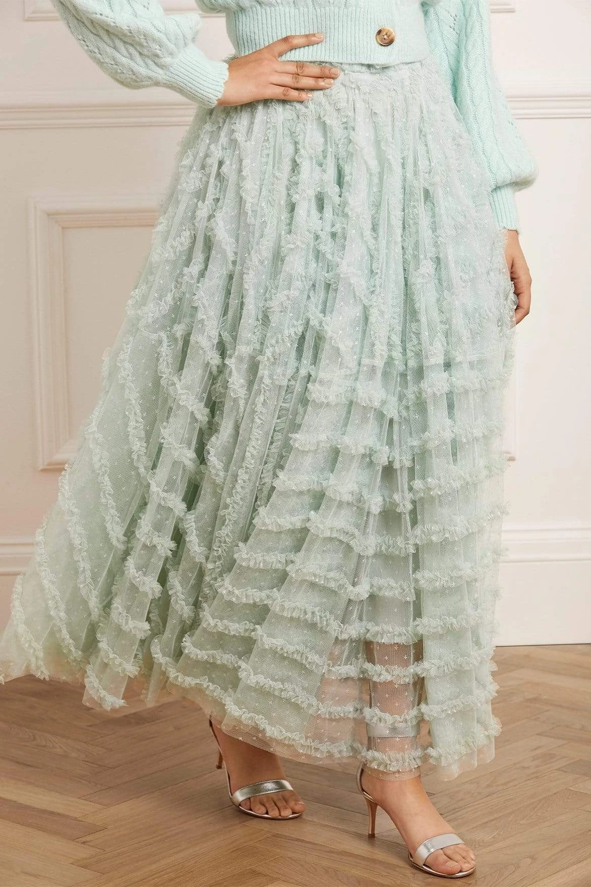 NEEDLE & THREAD EXCLUSIVE. The Florence Ruffle Ankle Skirt in Sweet Green. This beautiful skirt is crafted with layers of tulle, creating a voluminous romantic look. The ankle-length skirt is designed elegantly with a satin waistband and gathered neatly with tulle trims. Pair with your favourite top and make an entrance this season.