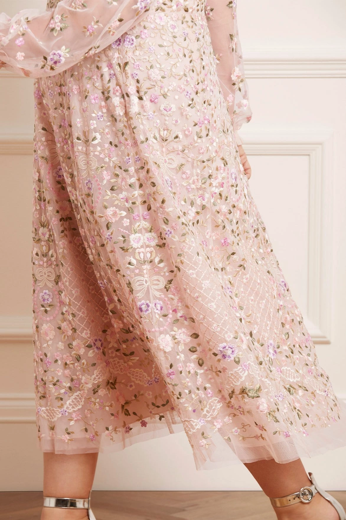 The Floret Ballerina Dress in Petal Pink. This piece is inspired by vintage lace and garden florals and fully embroidered in rich, multi-coloured thread. Beautifully decorated with intricate flowers and delicate trellis motifs, creating an effortless silhouette. A style you’ll keep coming back to.