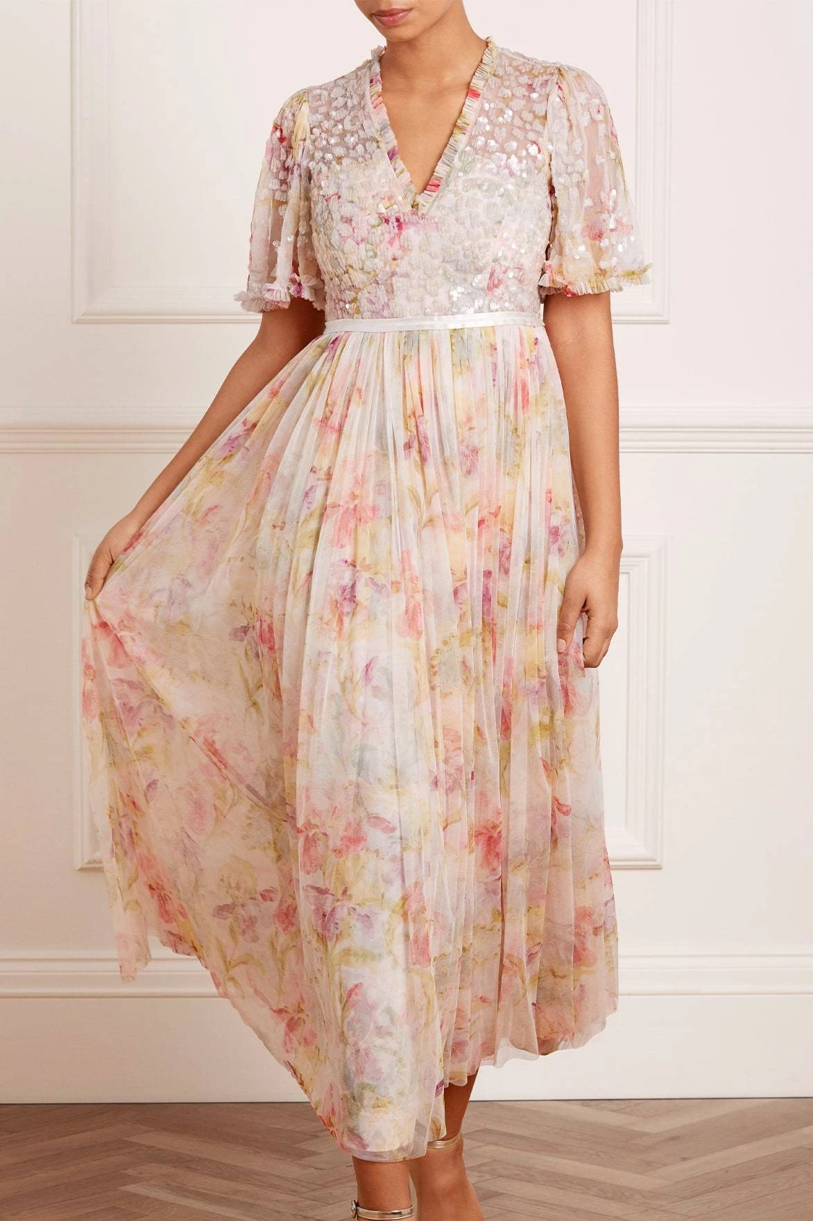 The Iris Sequin Bodice Short Sleeve V-Neck Ankle Gown in Moonshine. Beautifully adorned with shimmering sequins across the bodice. Designed with delicate soft tulle, featuring large iris motifs in detailed embroidery and lace-inspired texture. Decorated with a signature Needle & Thread waistband and a layered skirt for romantic movement. The perfect dress for all your upcoming events.