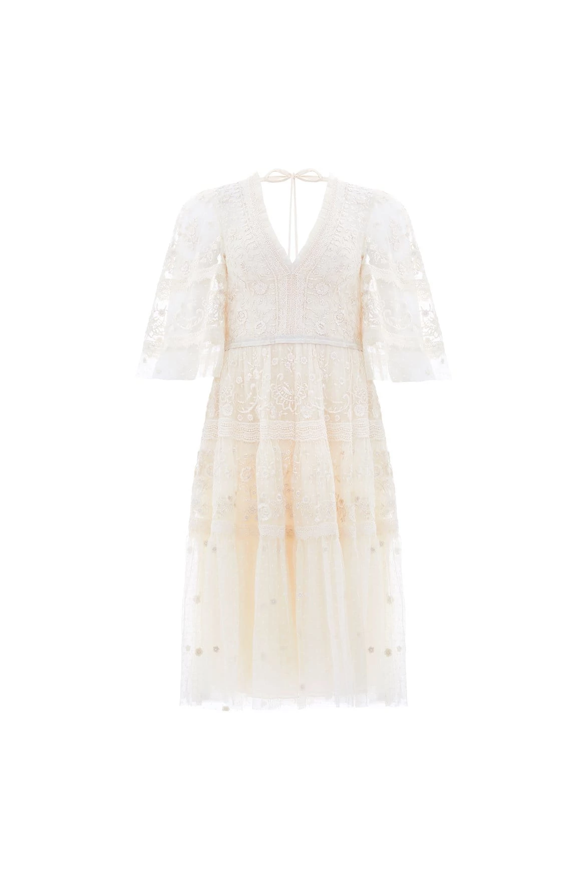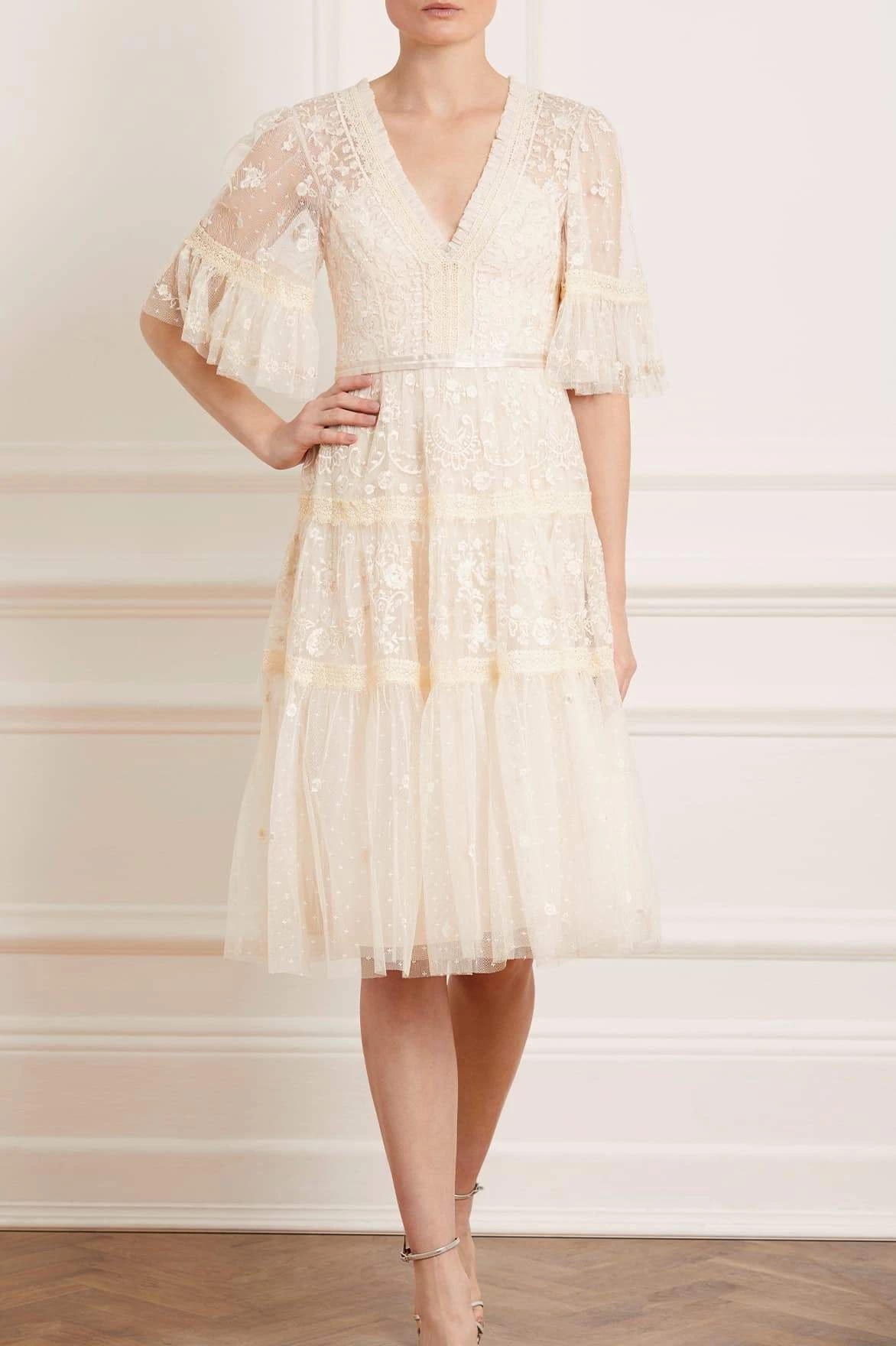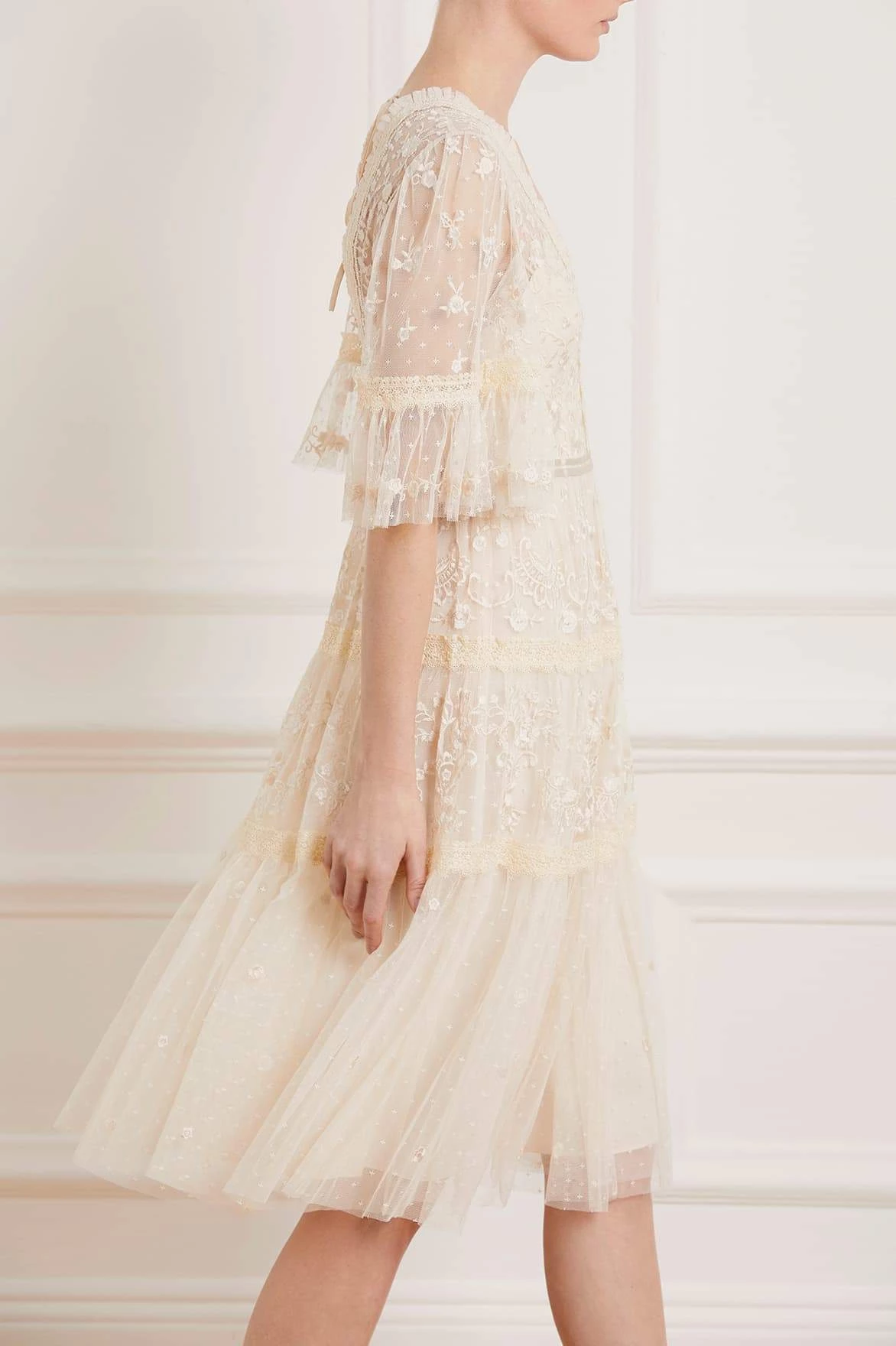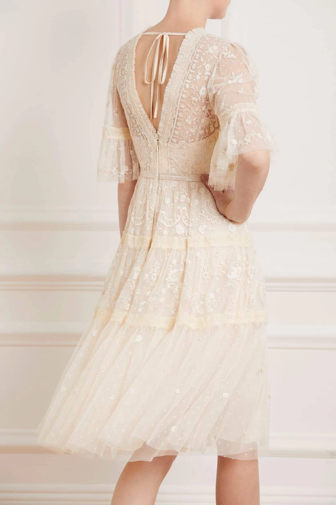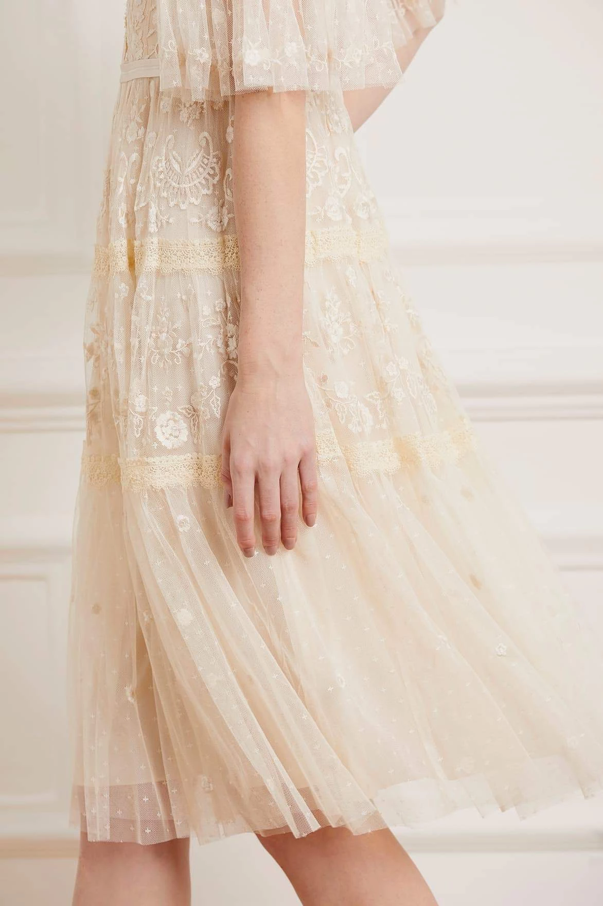 The Lottie Lace Midi Dress in Champagne. A signature Needle & Thread style, updated for the new season ahead. Taking inspiration from Victorian lace, the Lottie features intricately embroidered artwork in a romantic red on delicate tulle. Lace trims border the neckline and frame each tier of the skirt. This embroidered lace dress has sheer, romantic sleeves and our signature grosgrain ribbon at the waist. The perfect dress to take you from day to night.