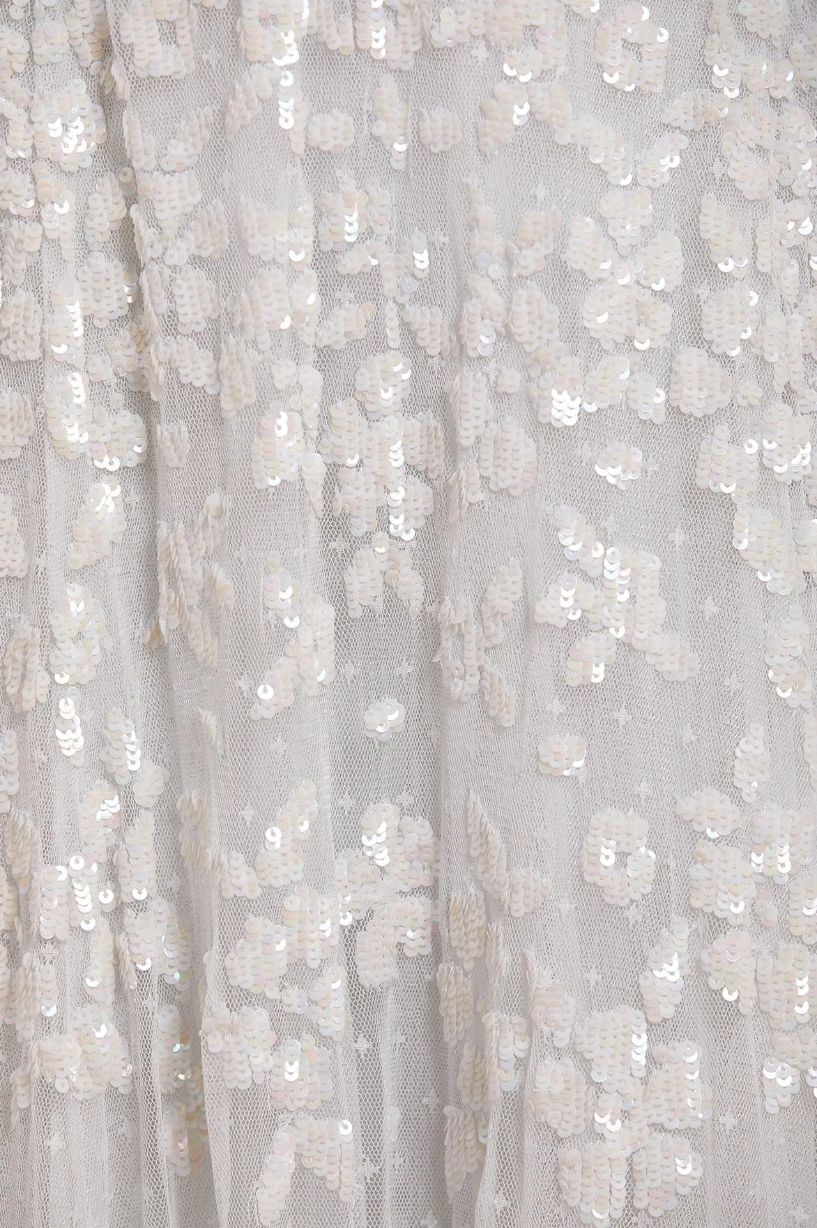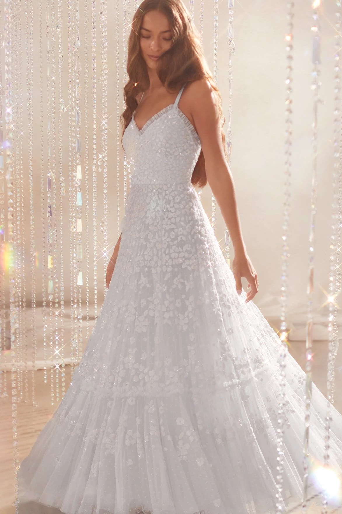 The Margot Cami Ankle Gown in Ice Blue. This statement piece is adorned with a floral, sequin artwork creating an all over shimmer effect. Crafted with a dramatic, sweeping hemline to create romantic movement. Make a statement in this show-stopping piece.