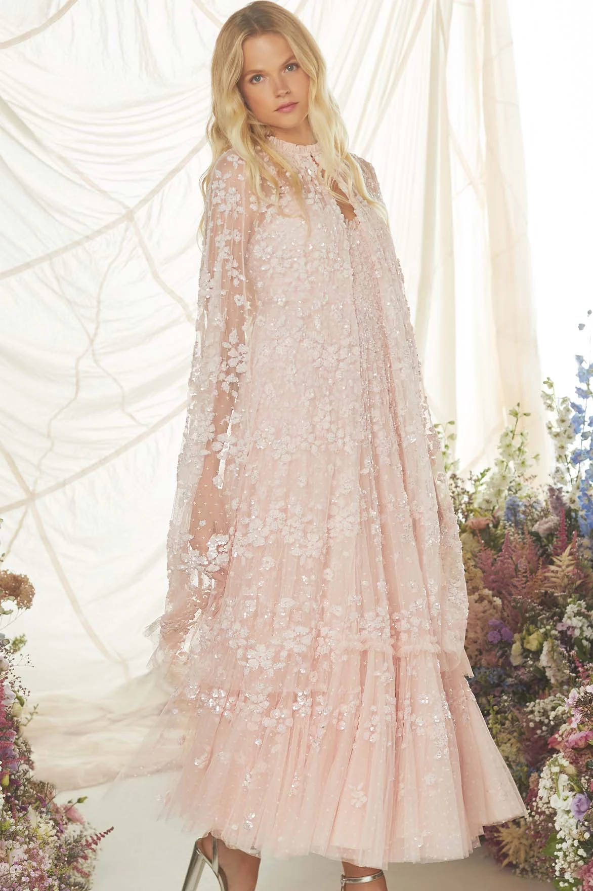 The Margot Midaxi Cape in Petal Pink. This cape is adorned with a floral, sequin artwork creating an all over shimmer effect. Crafted with a hook fastening at the neckline for effortless styling. Designed to layer over the Margot Cami Ankle Gown for a statement look. Make this cape your new go-to piece.