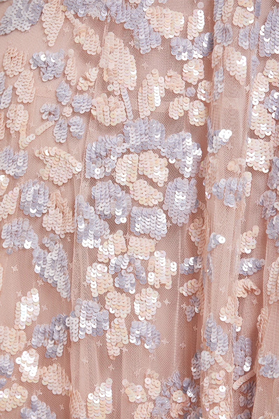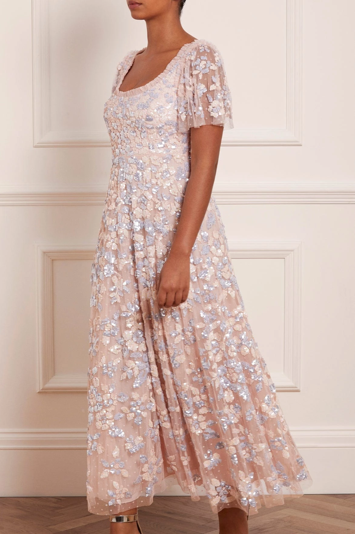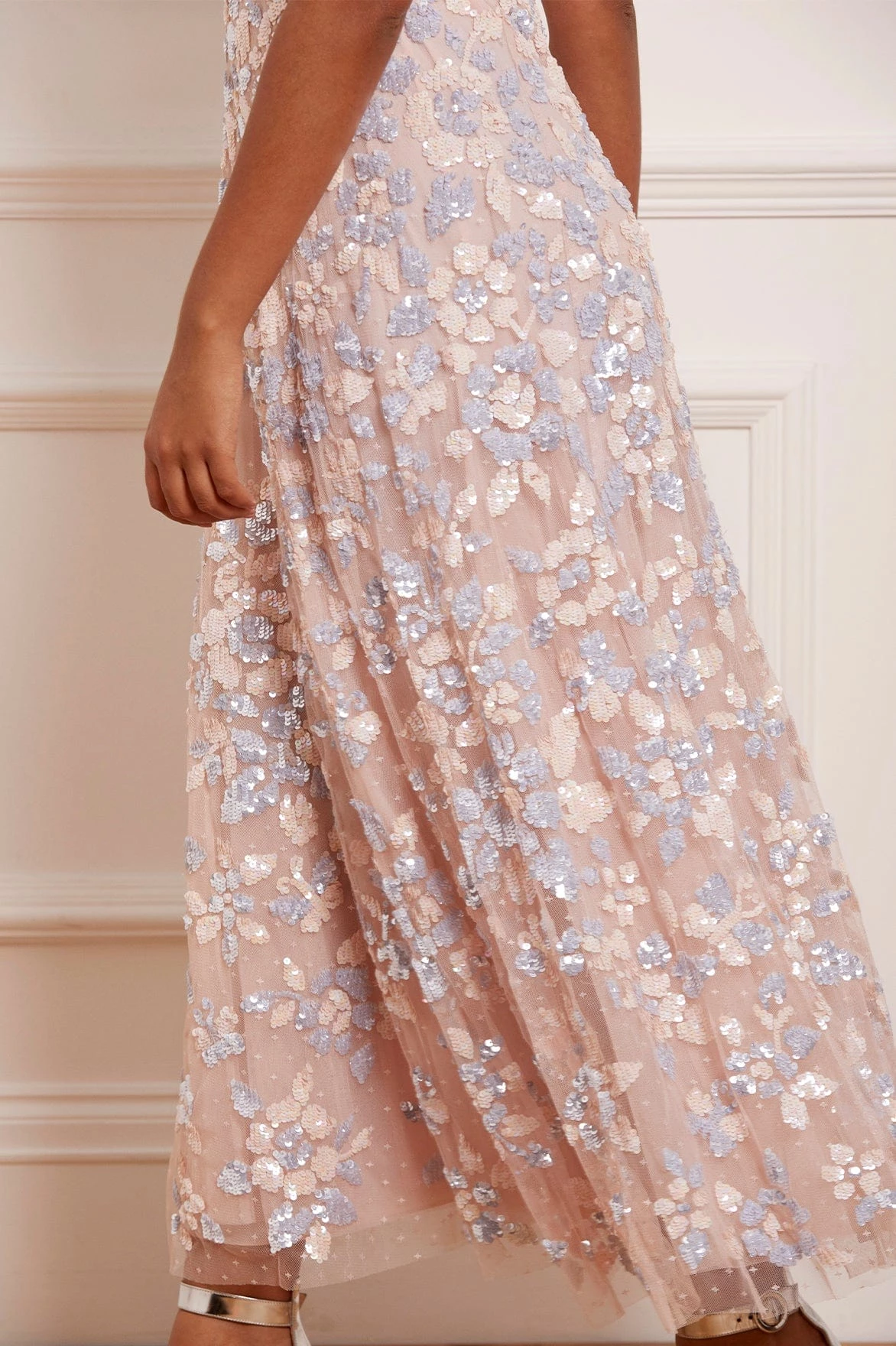 The Mary Rose Scoop Neck Ankle Gown in Petal Pink / Blue Multi. This ankle gown features a two tone floral sequin design creating a statement artwork. Beautifully crafted with a flattering silhouette. A net underlayer helps to shape this elegant piece. A truly show-stopping gown.