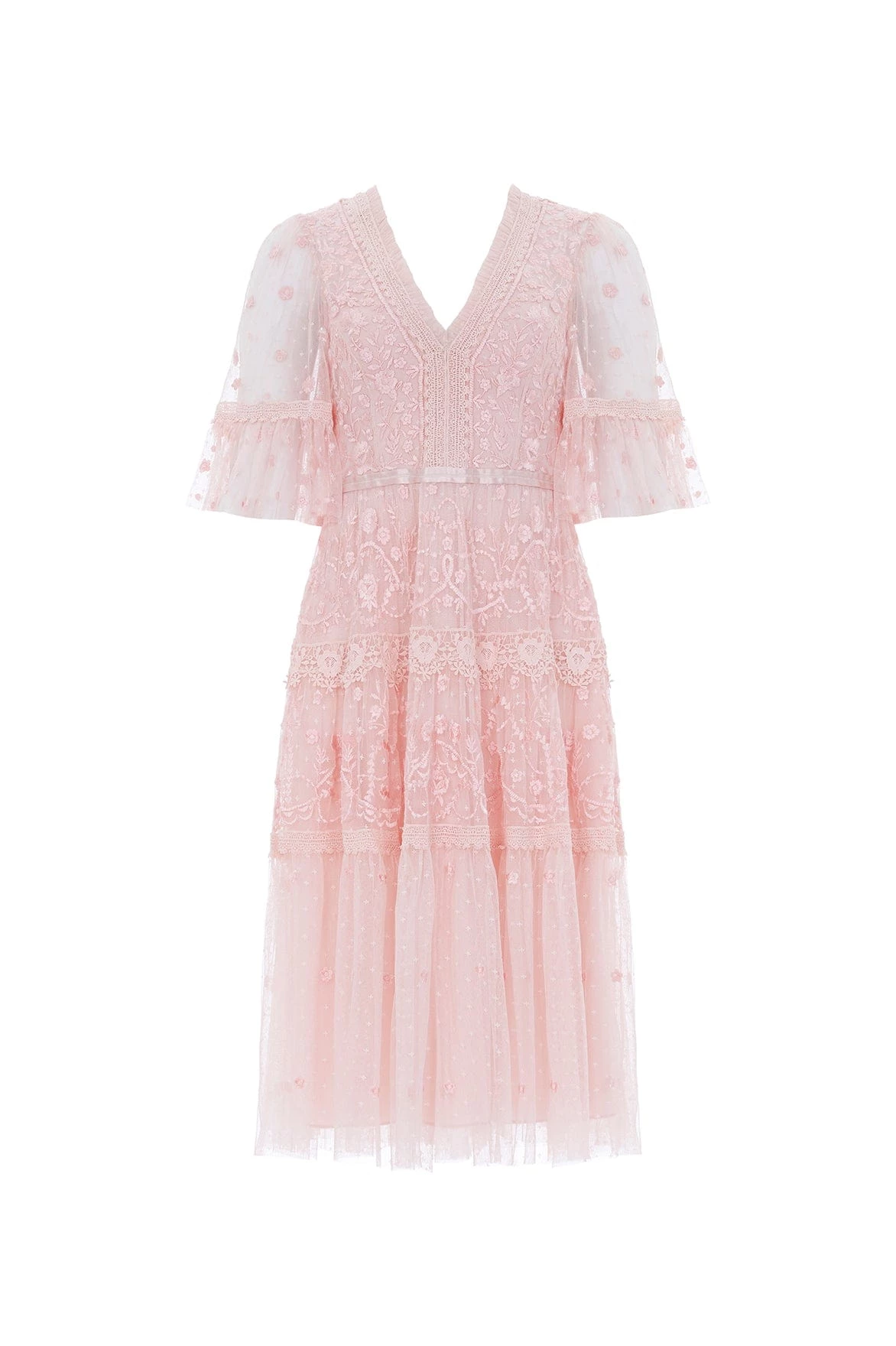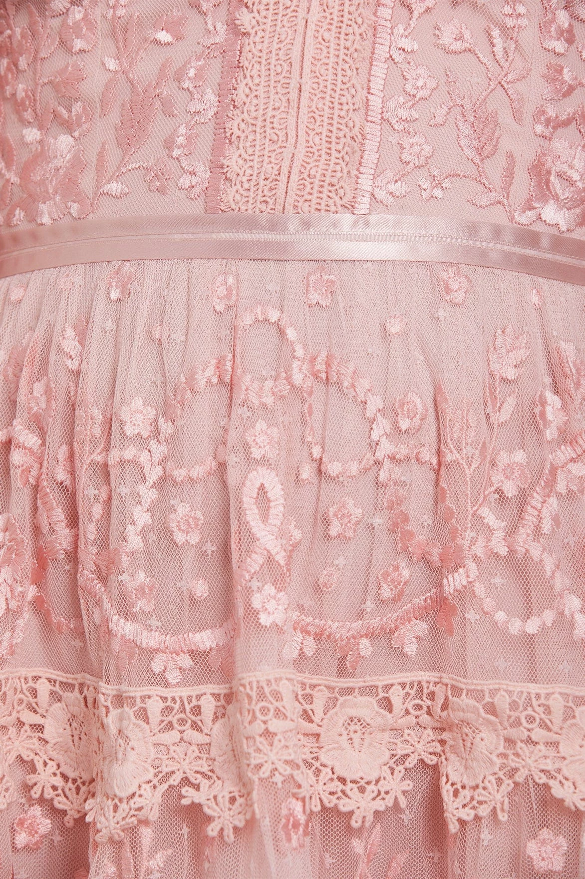 The Midsummer Lace Dress in Seashell Coral. A signature Needle & Thread style, updated for the Taking inspiration from Victorian lace, the Midsummer features intricately embroidered artwork in tonal colours on delicate tulle. Lace trims border the neckline and frame each tier of the skirt. This embroidered lace dress has sheer, romantic sleeves and our signature grosgrain ribbon at the waist. The perfect dress to take you from day to night.