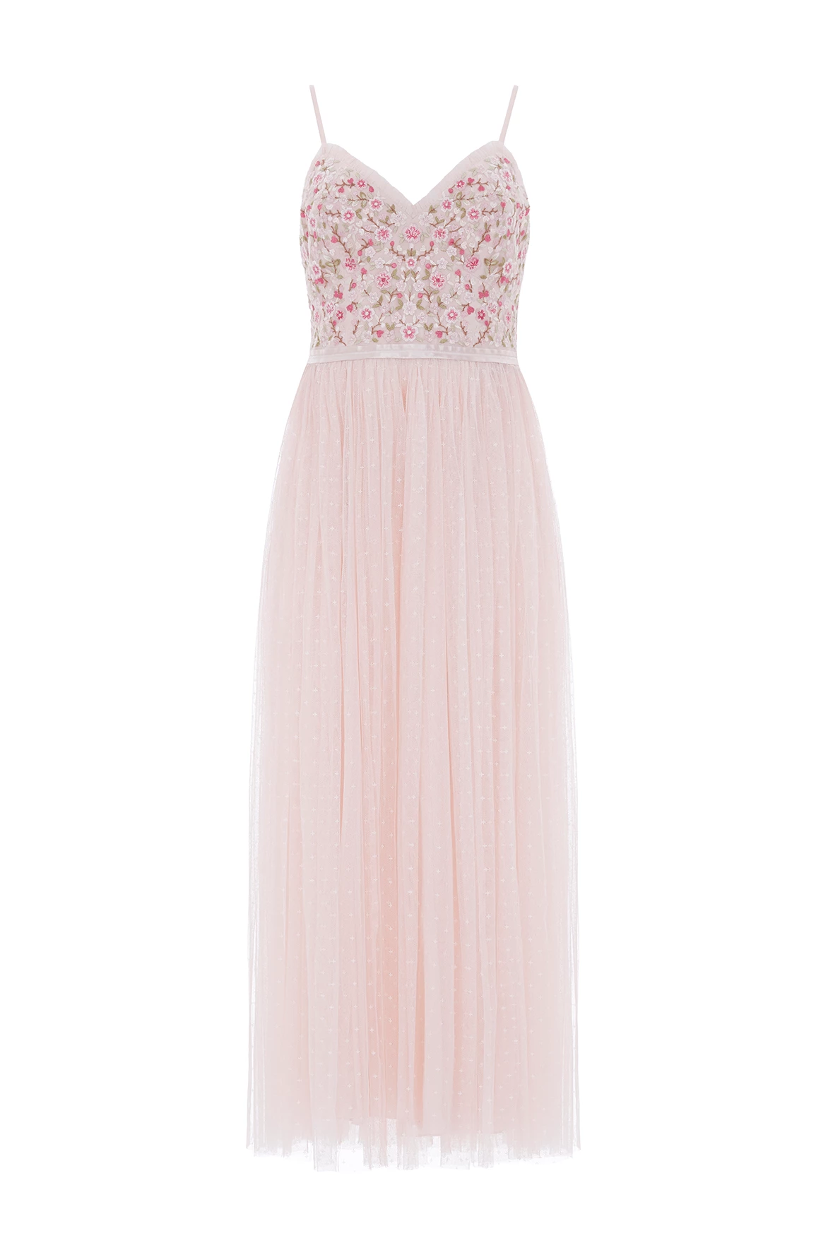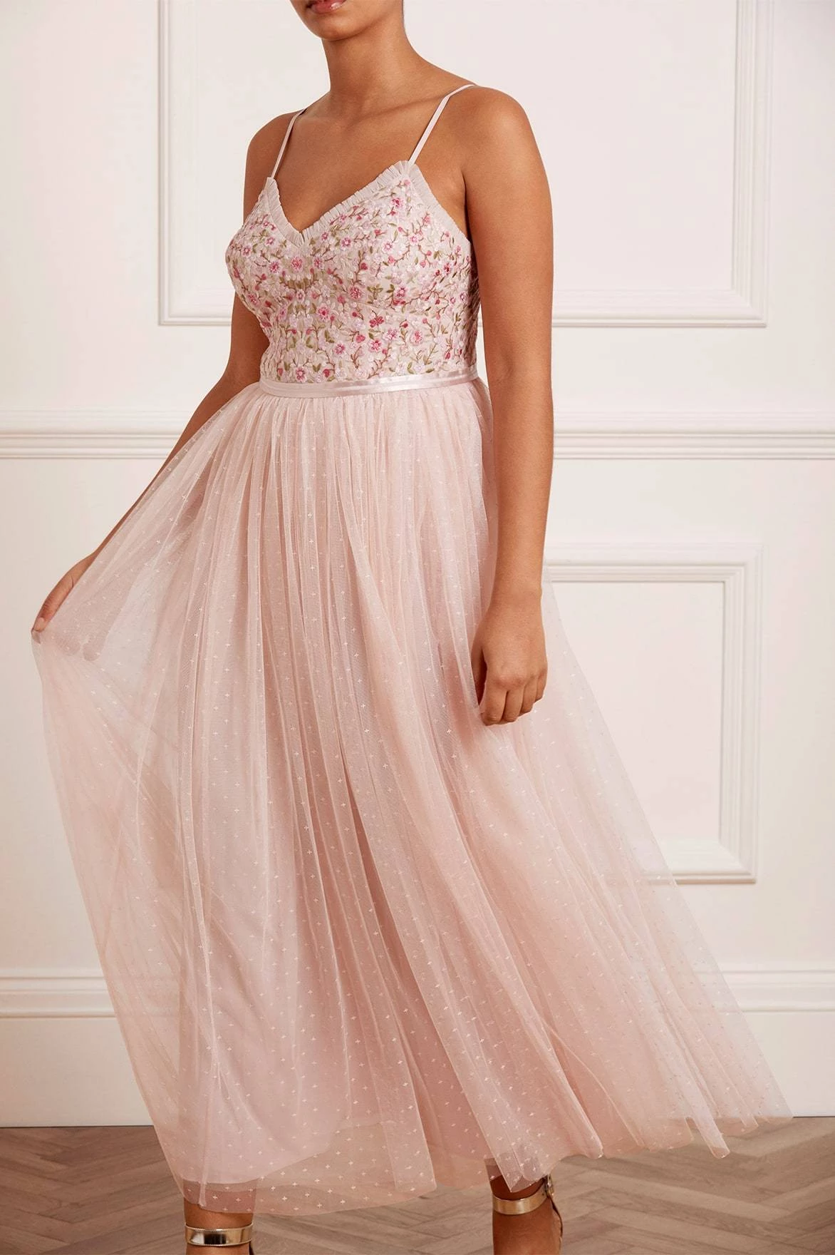 NEEDLE & THREAD EXCLUSIVE. The Rosie Lace Cami Bodice Ankle Gown in Petal Pink. Beautifully decorated with embroidery throughout, this gown features rose floral motifs, lace borders and a satin waistband. Its skirt is crafted from soft tulle with an ‘x’ motif design. The perfect gown for every special occasion.