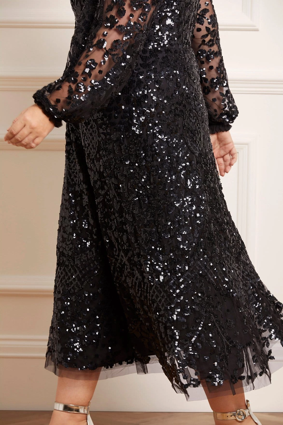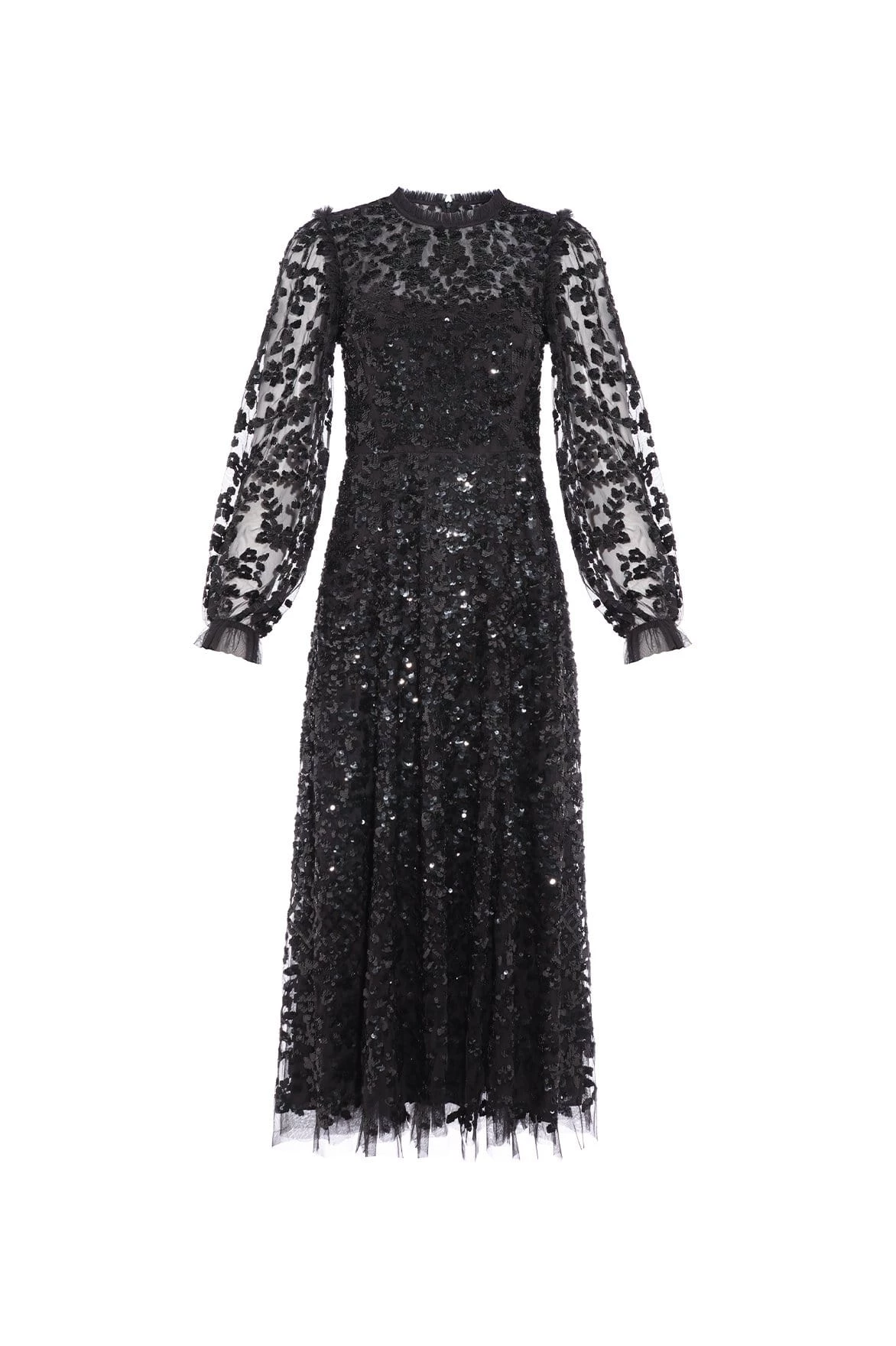 The Seren Long Sleeve Ballerina Dress in Graphite. This statement dress is adorned with a floral sequin artwork, creating an all-over shimmer effect. Crafted in our signature tulle , with an effortlessly flattering silhouette. Make a statement in this show-stopping ballerina dress.