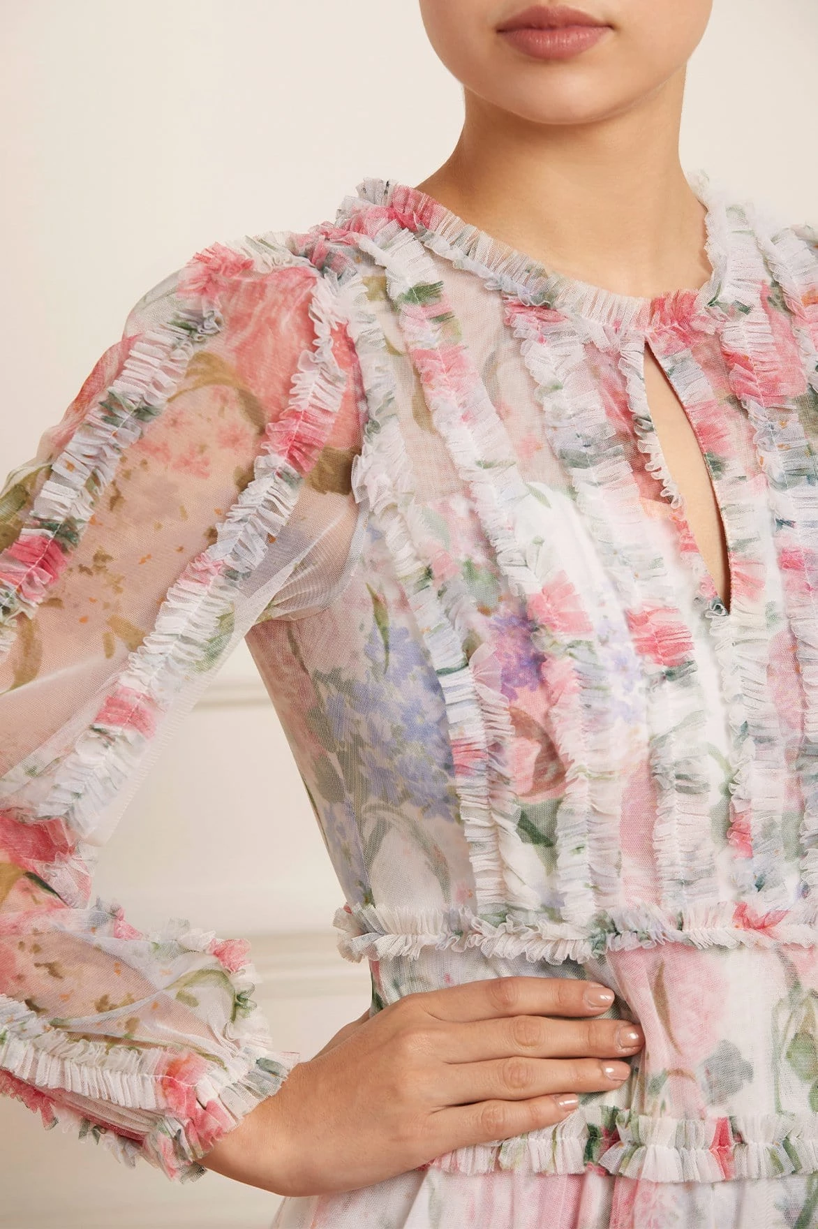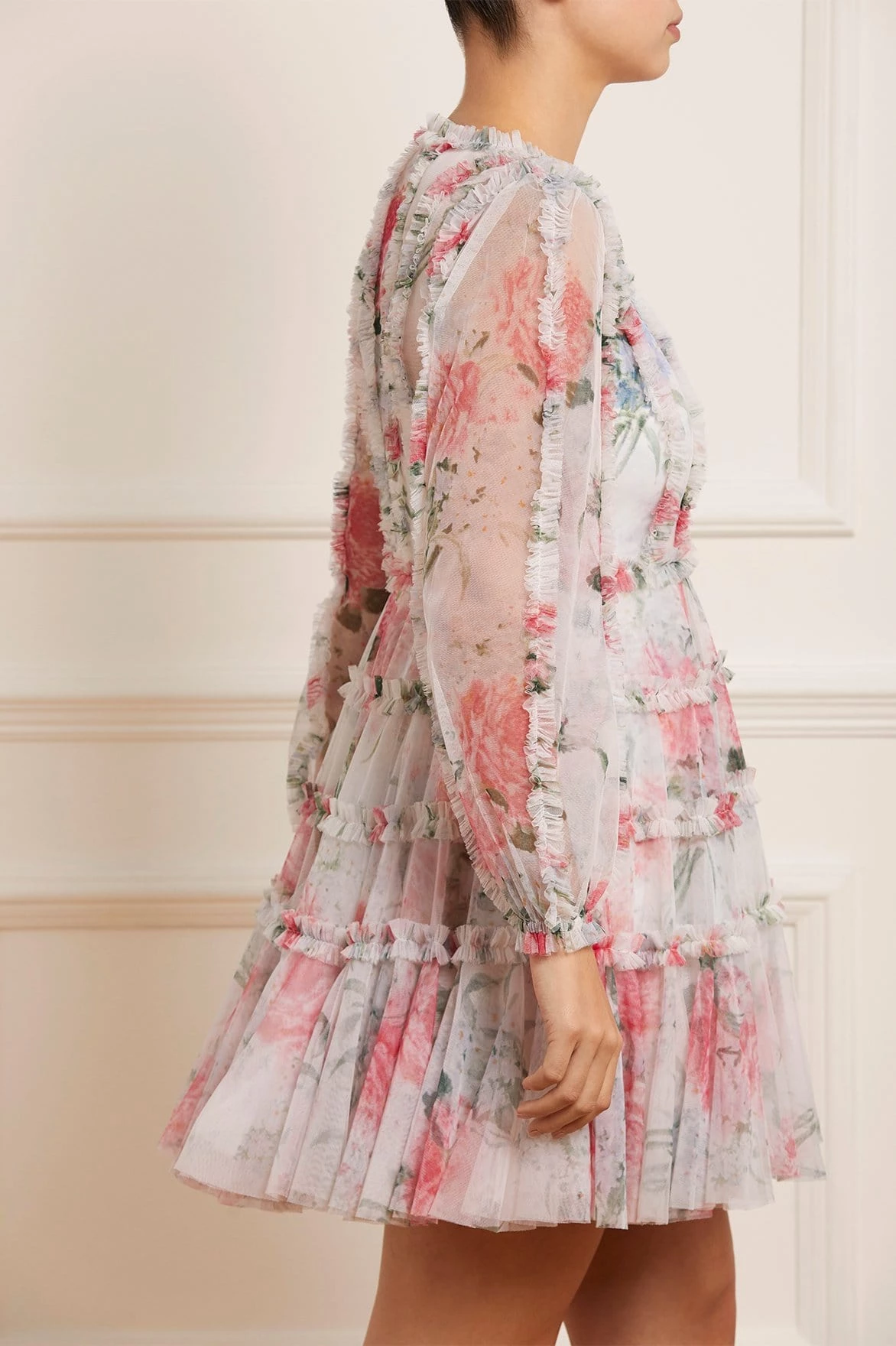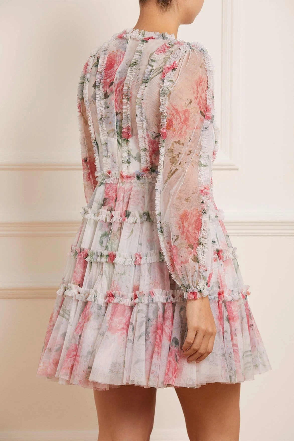 NEEDLE & THREAD EXCLUSIVE. The Sweet Posy Micro Mini Dress in White / Multi. A brand new length for the season ahead. This beautiful piece is inspired by a print taken from a hand painted 1800s artwork. This mini dress features soft roses in layered colours, creating a romantic texture throughout. Crafted with perfectly proportioned tiers and a net layer to create a dramatic, statement silhouette. Attend your next event in this truly romantic style.
