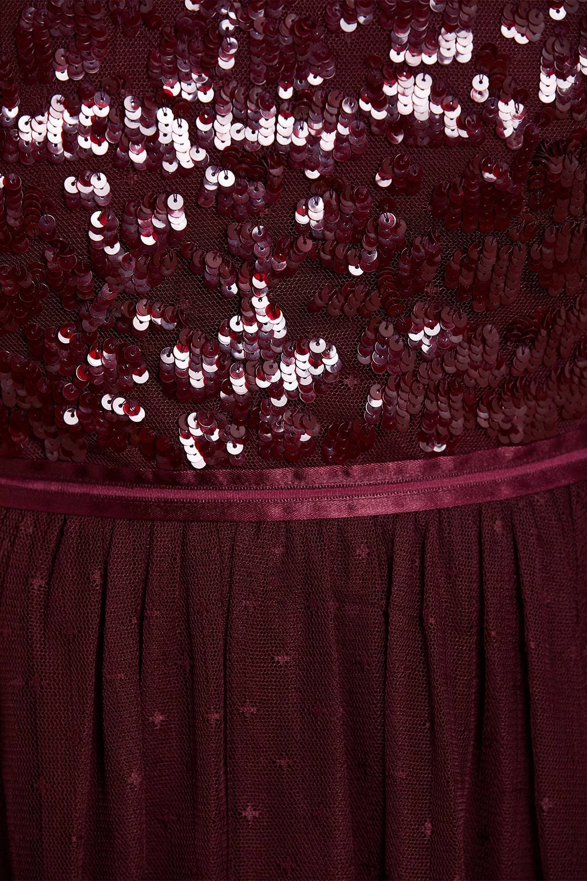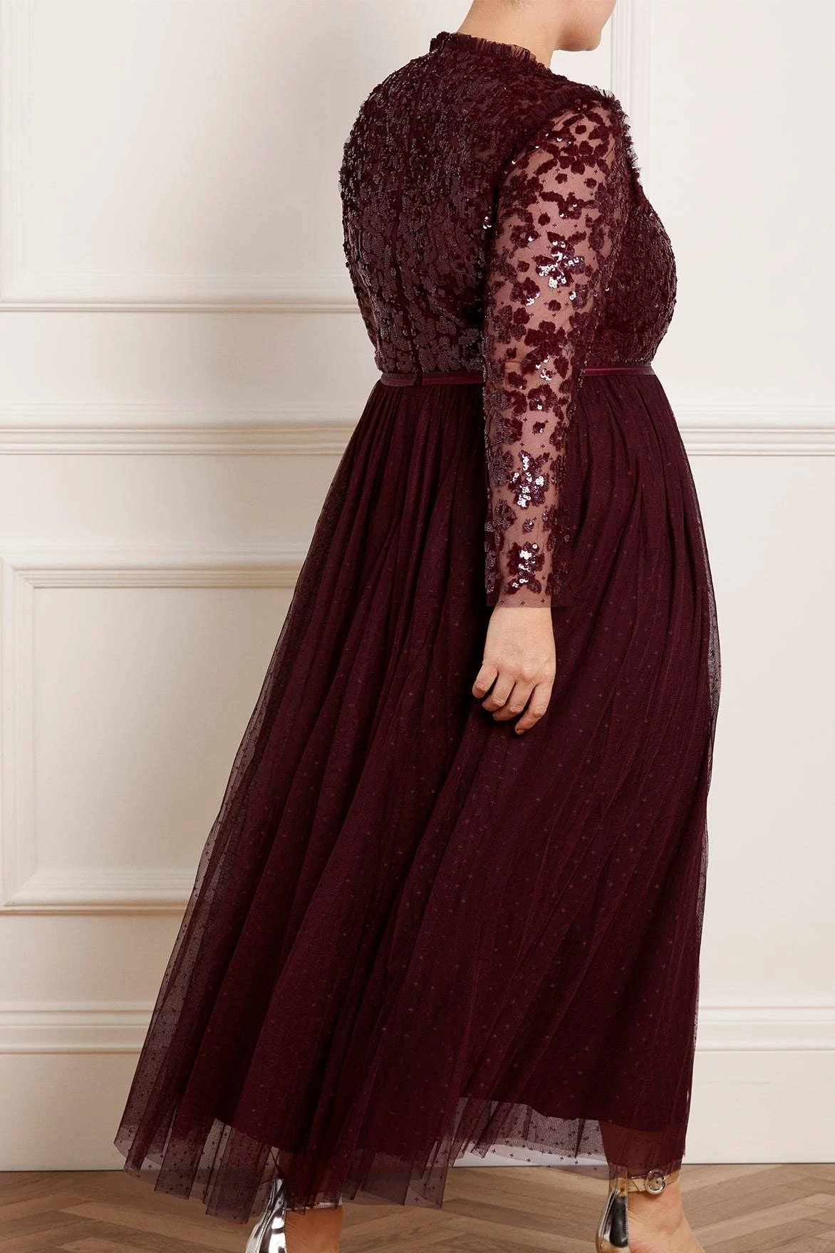The Amalie Bodice Long Sleeve Ankle Gown in Burgundy. Featuring a bodice decorated with intricate shimmering sequins and floral motifs, this gown is designed with a layered tulle skirt featuring ‘x’ motifs throughout, adding subtle texture. Make this gown your new season go-to.