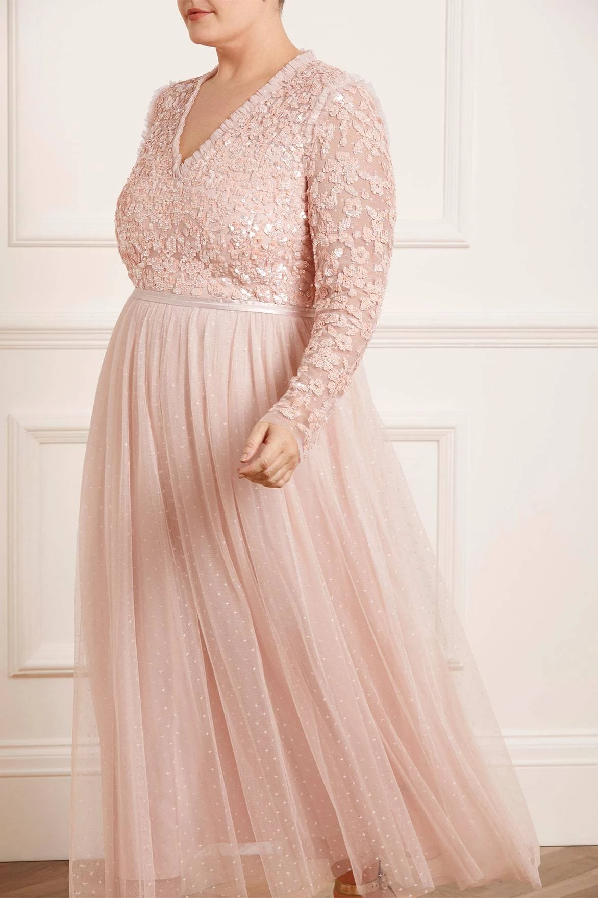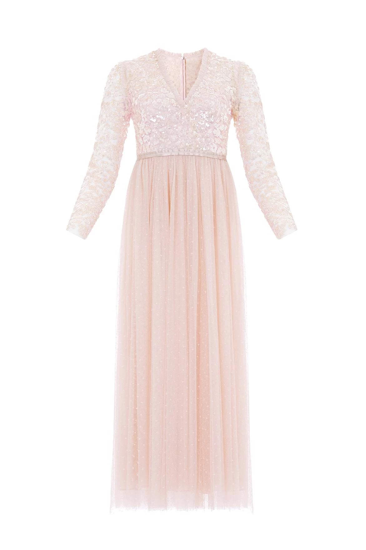 NEEDLE & THREAD EXCLUSIVE. The Amalie Bodice Long Sleeve V-Neck Ankle Gown in Petal Pink. Featuring a bodice decorated with intricate shimmering sequins and floral motifs, this long-sleeved, V-neck gown is designed with a layered tulle skirt featuring ‘x’ motifs throughout, adding subtle texture. Make this gown your new season go-to.