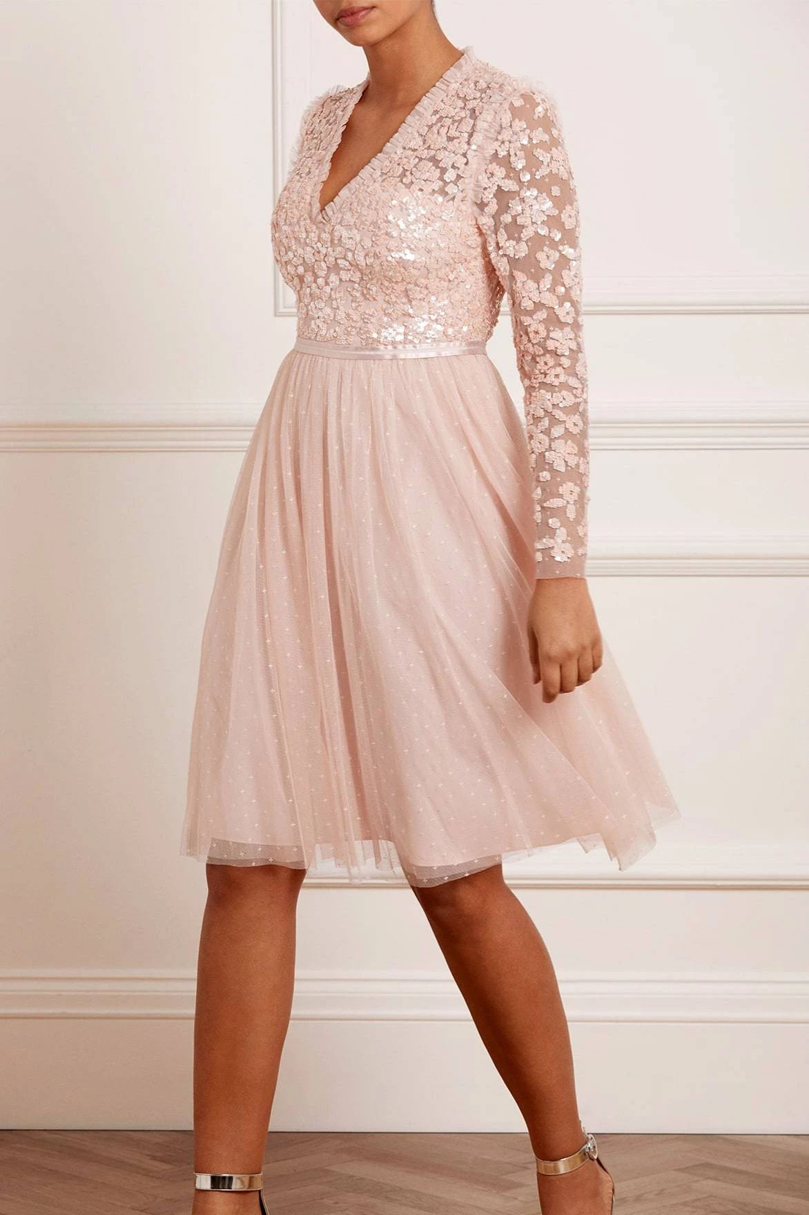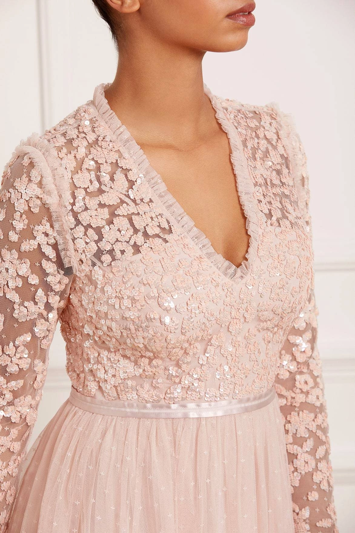NEEDLE & THREAD EXCLUSIVE. The Amalie Bodice Long Sleeve V-Neck Midi Dress in Petal Pink. Featuring a bodice decorated with intricate shimmering sequins and floral motifs, this long-sleeved, V-neck dress is designed with a layered tulle skirt featuring ‘x’ motifs throughout, adding subtle texture. Make this dress your new season go-to.
