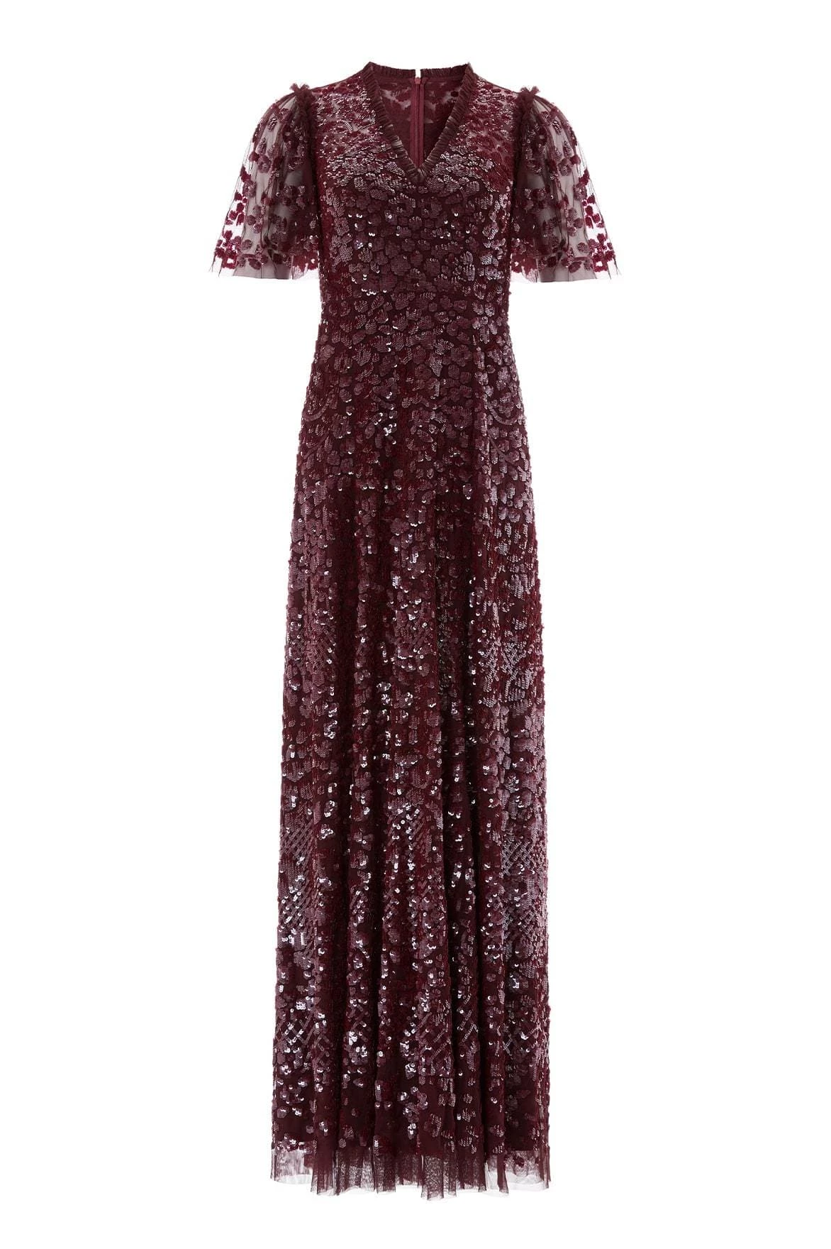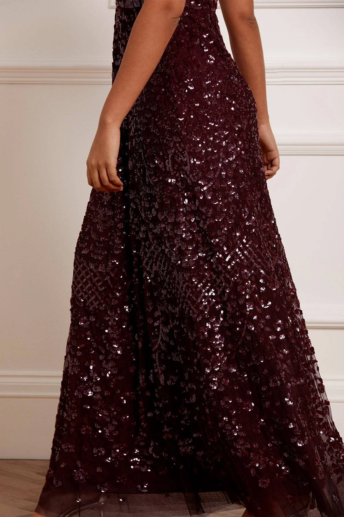 The Amalie Sequin V-Neck Gown in Burgundy. Decorated with intricate shimmering sequins and floral motifs, this short-sleeved, V-neck gown is designed with a layered tulle skirt featuring ‘x’ motifs throughout, adding subtle texture. Make this dress your new season go-to.