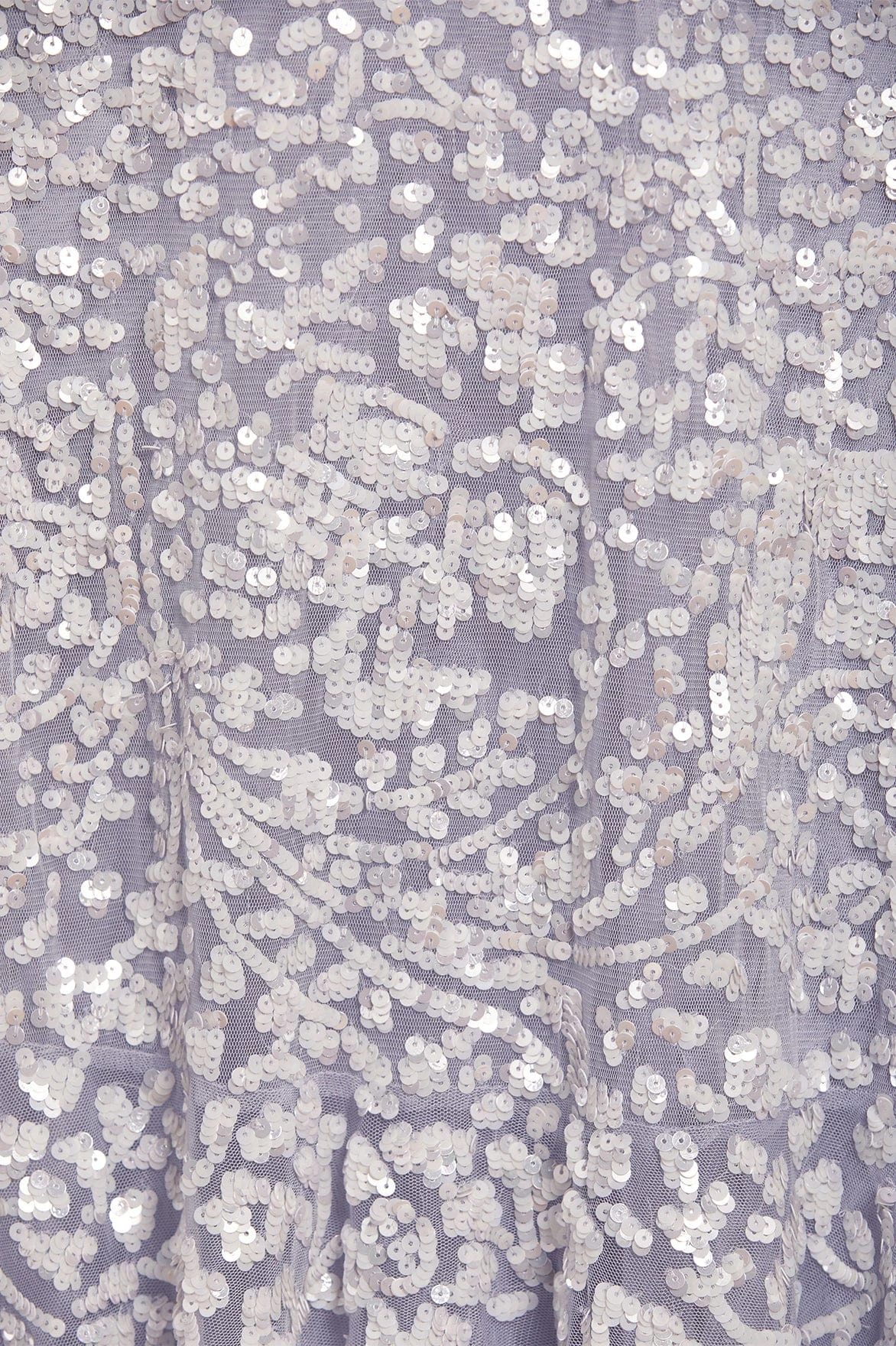 NEW SEASON. The Amaryllis Gown in Porcelain Blue/White. This embellished gown has a fluid floral artwork design with shimmering white sequins. Beautifully crafted with tulle details and a voluminous skirt to create added movement as you walk. Make a statement in the Amaryllis at your next event.