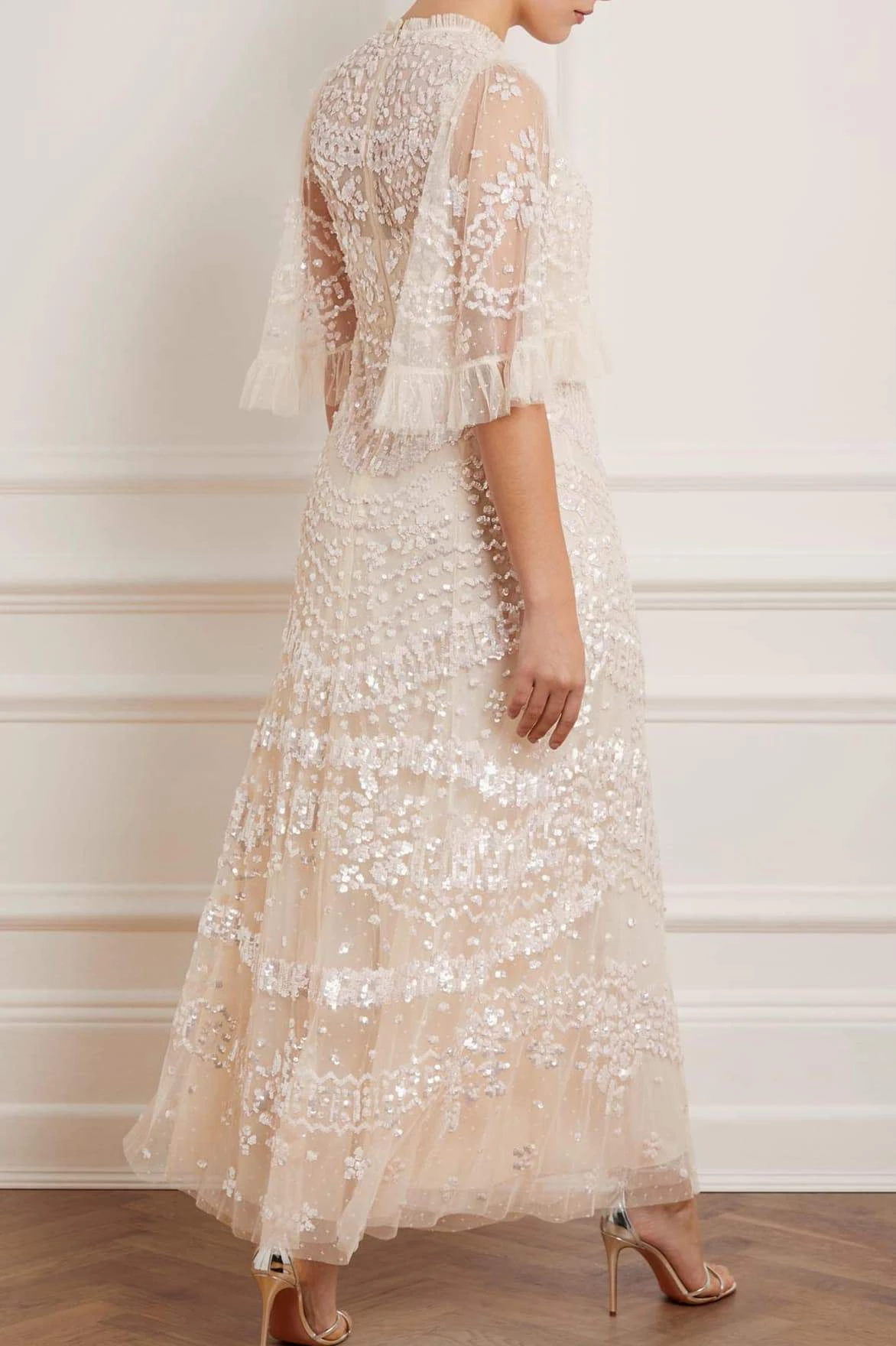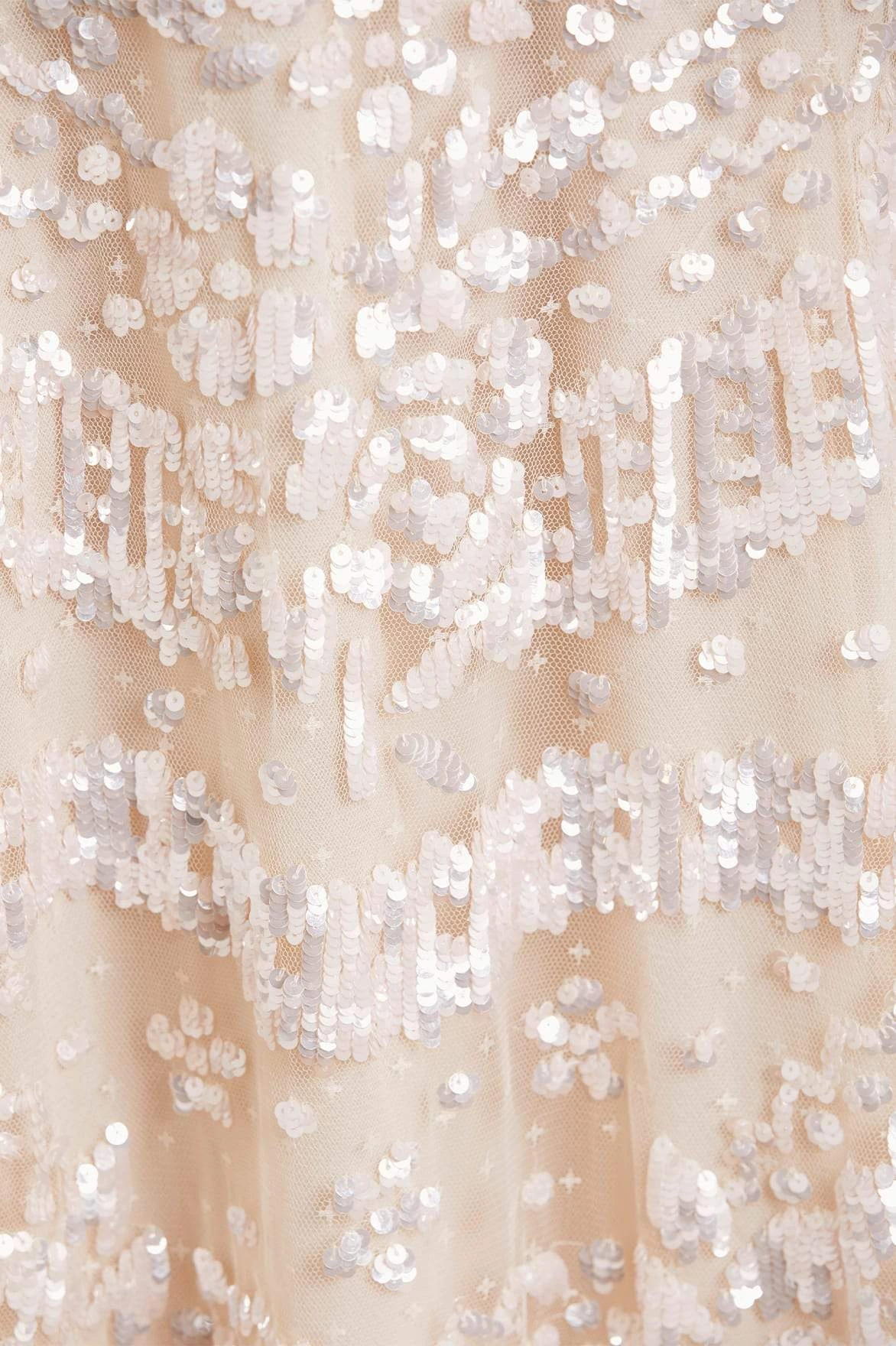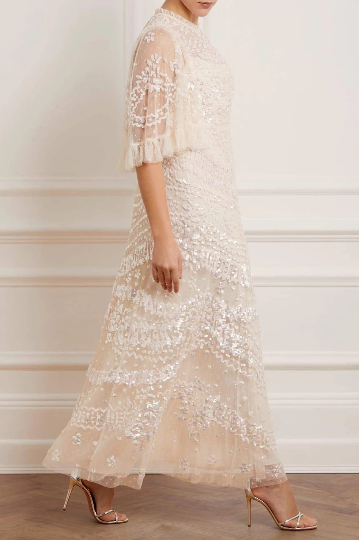 NEEDLE & THREAD EXCLUSIVE | The Anais Sequin Gown in Champagne / Pink. This gown is beautifully decorated in sequins, developed from a vintage, French hand-drawn lace design. Crafted with lace floral borders throughout, and floaty sleeves. The perfect dress for any occasion.