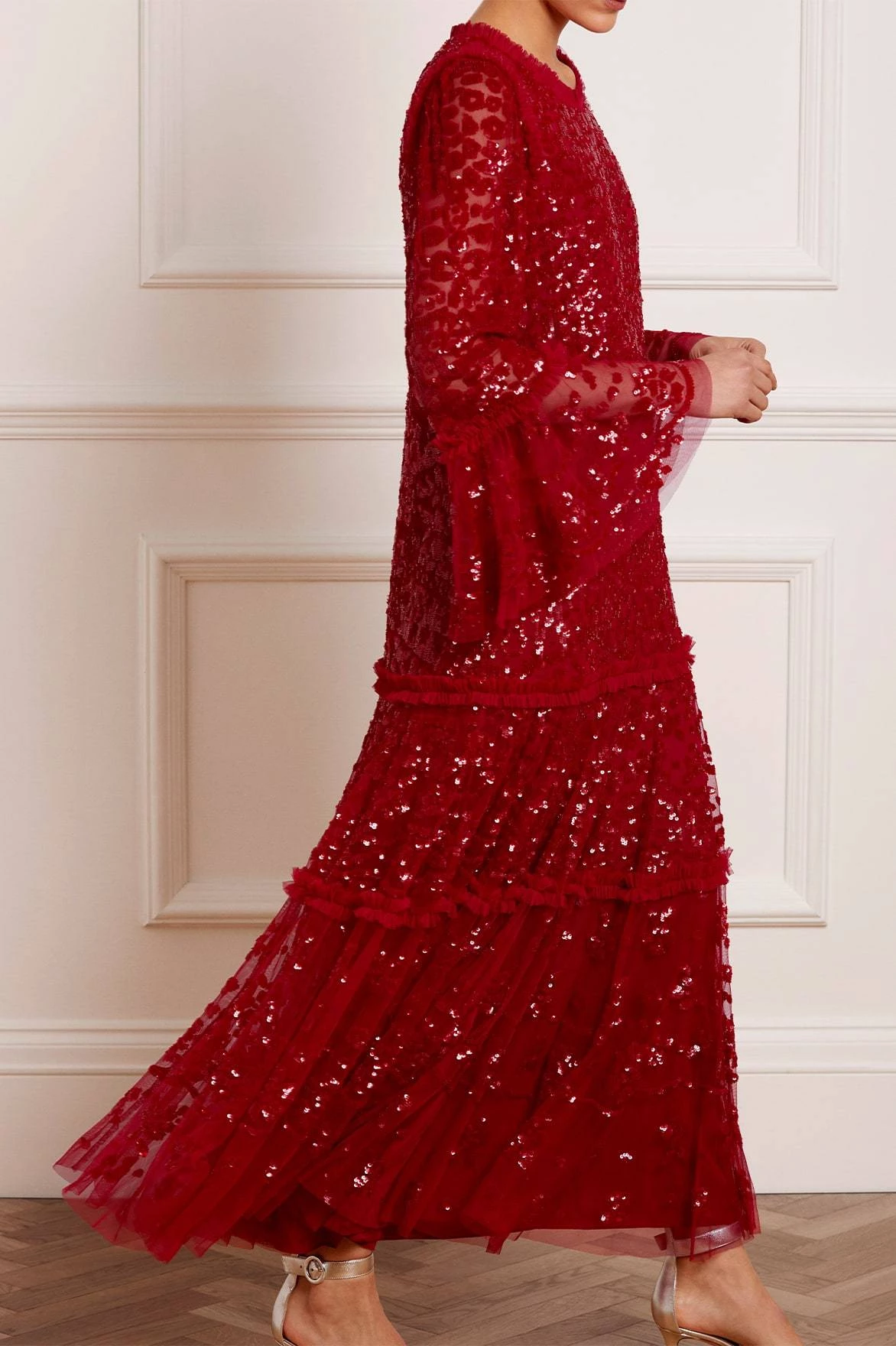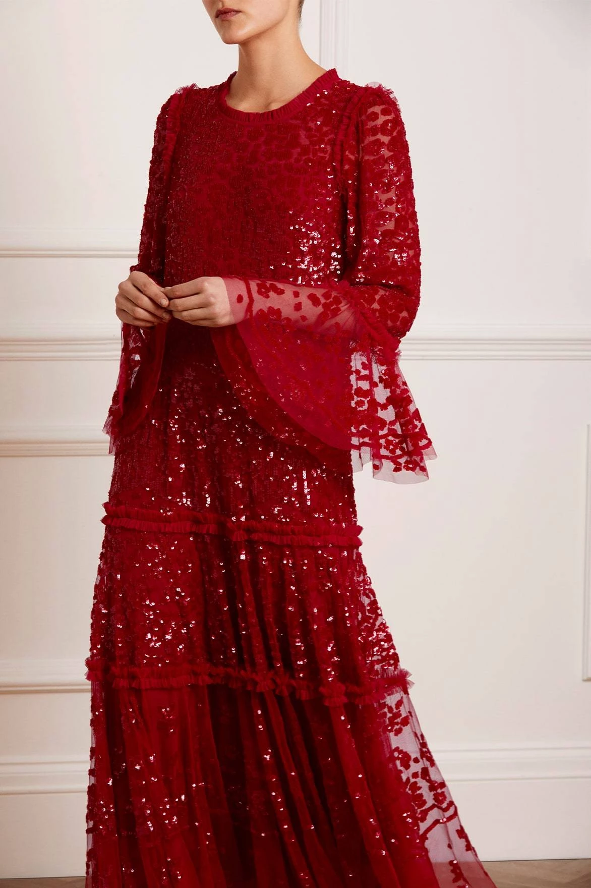 NEEDLE & THREAD EXCLUSIVE. The Annie Sequin Tiered Ankle Gown in Deep Red. Adorned with shimmering sequins in a floral and bow artwork, this gown is inspired by a lace tablecloth. Designed with a loose fit silhouette and tiered throughout, creating beautiful movement. Make an effortless statement.
