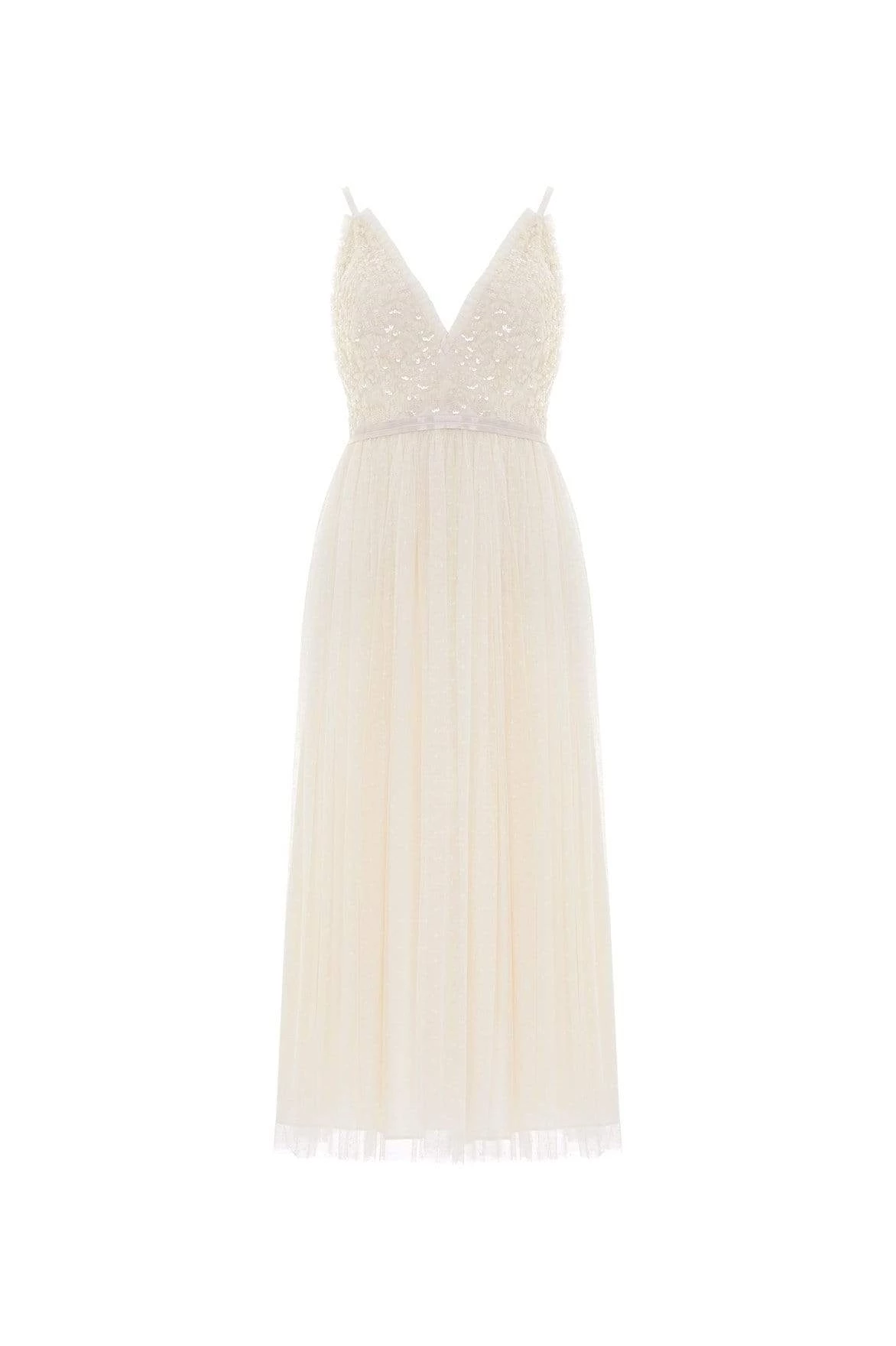 The Aurelia Bodice Cami Ballerina Dress in Champagne. This Needle & Thread signature style is beautifully designed with floral lace artwork inspired by a vintage tablecloth. Adorned with shimmering sequins on the bodice gently flowing into a soft tulle skirt. Make an entrance in the Aurelia.