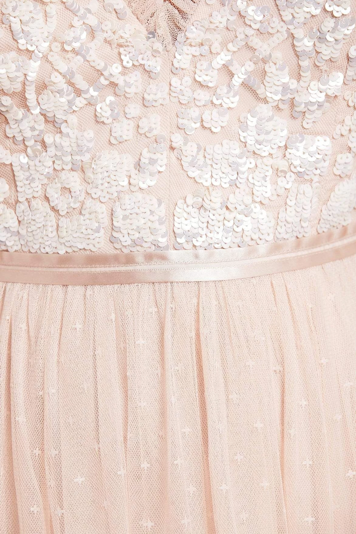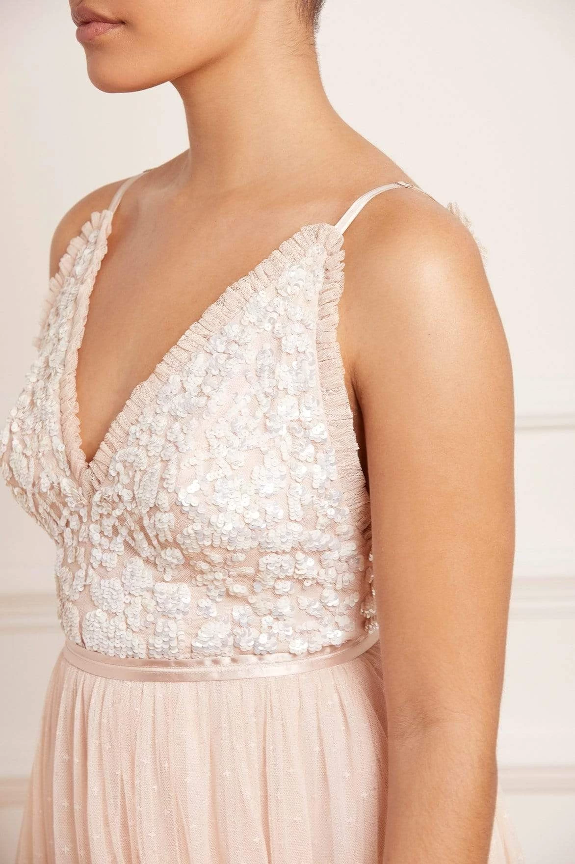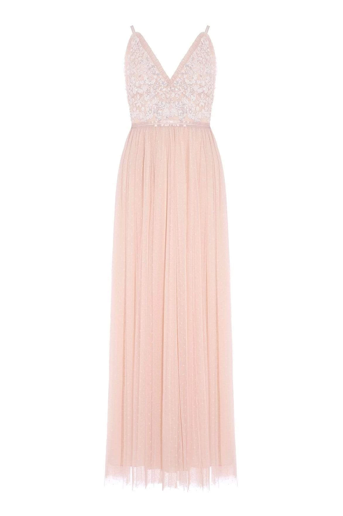 The Aurelia Bodice Cami Gown in Strawberry Icing. This Needle & Thread signature style is beautifully designed with floral lace artwork inspired by a vintage tablecloth. Adorned with shimmering sequins on the bodice gently flowing into a soft tulle full length skirt. Make an entrance in the Aurelia.