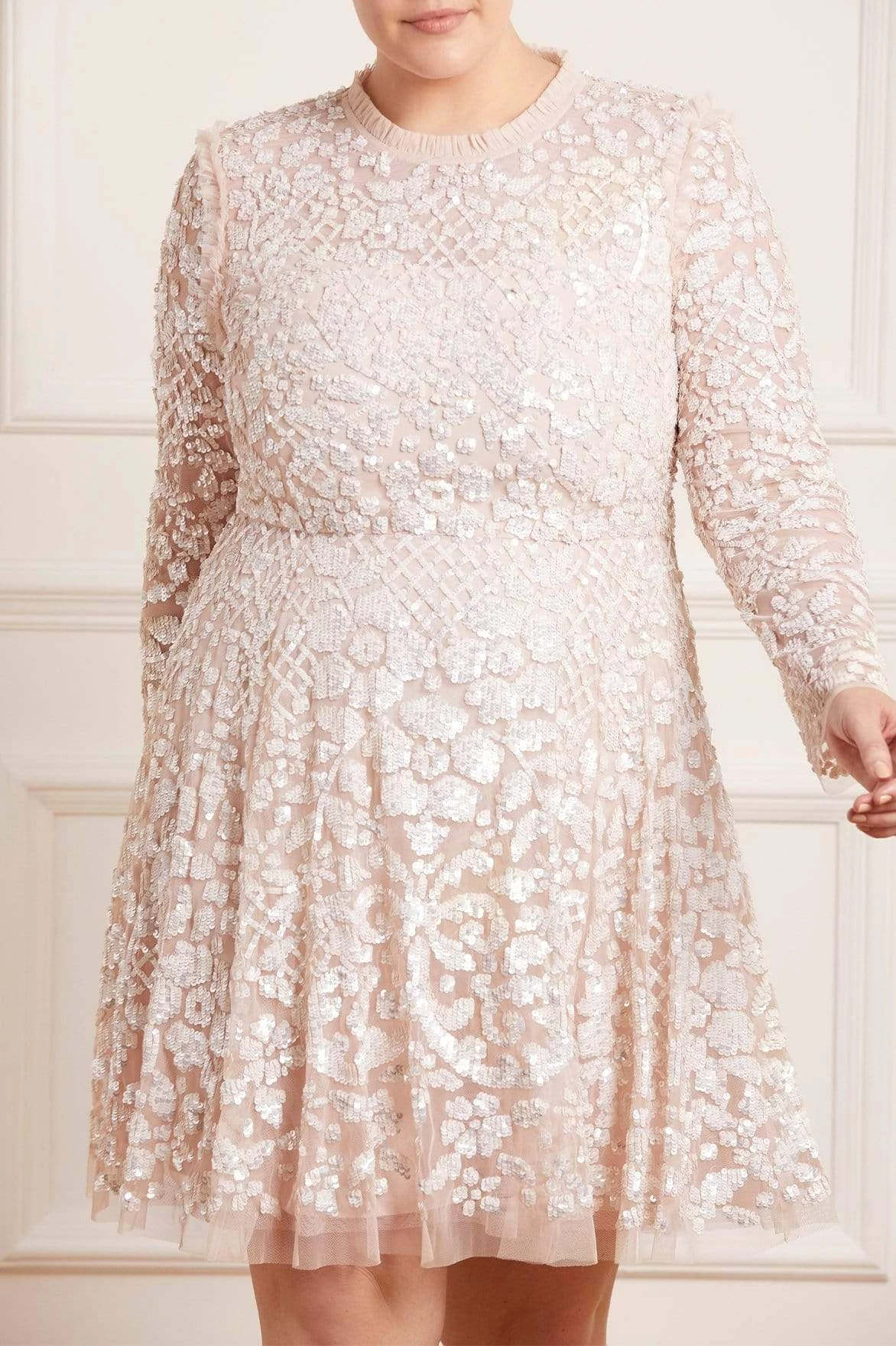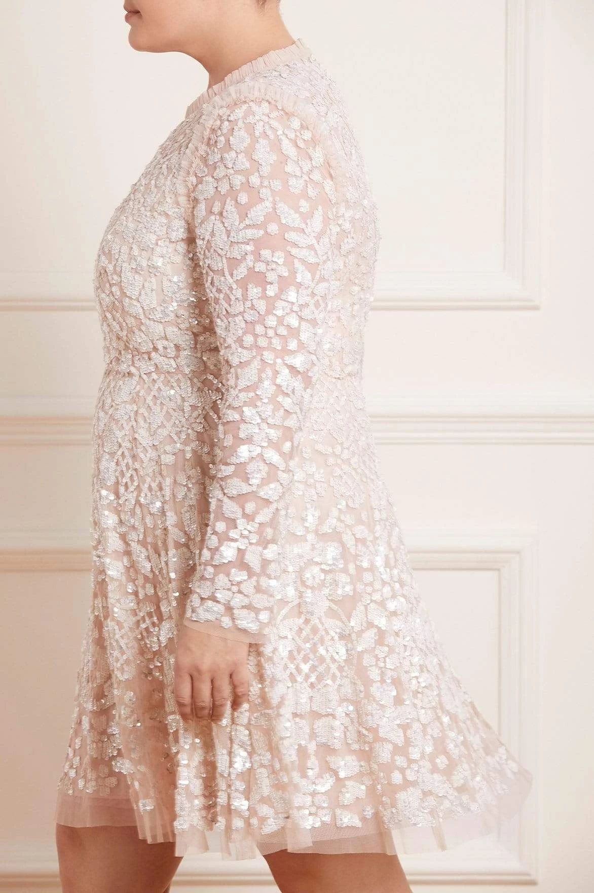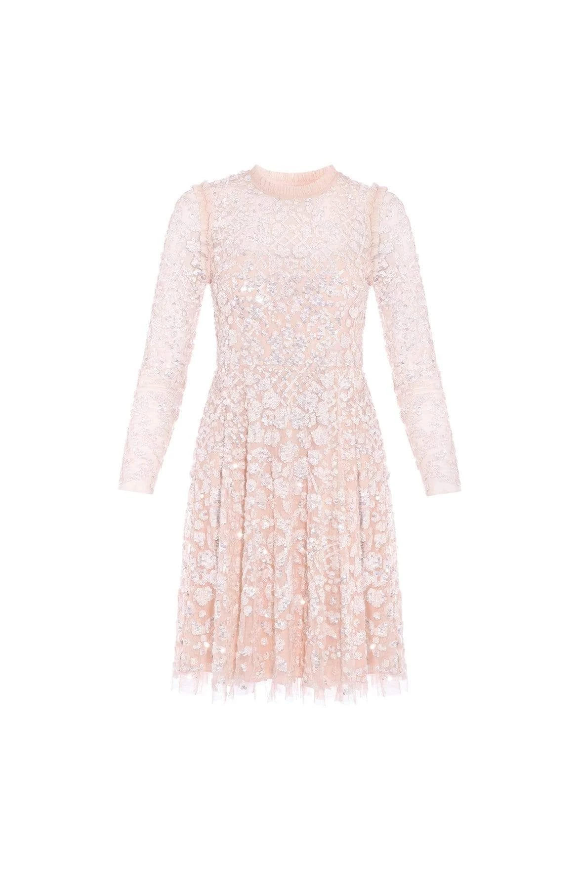 The Aurelia Long Sleeve Mini Dress in Strawberry Icing. This Needle & Thread signature style is beautifully designed with floral lace artwork inspired by a vintage tablecloth. Adorned with shimmering sequins and soft tulle frills in romantic, dusty pink. Make an entrance in the Aurelia.