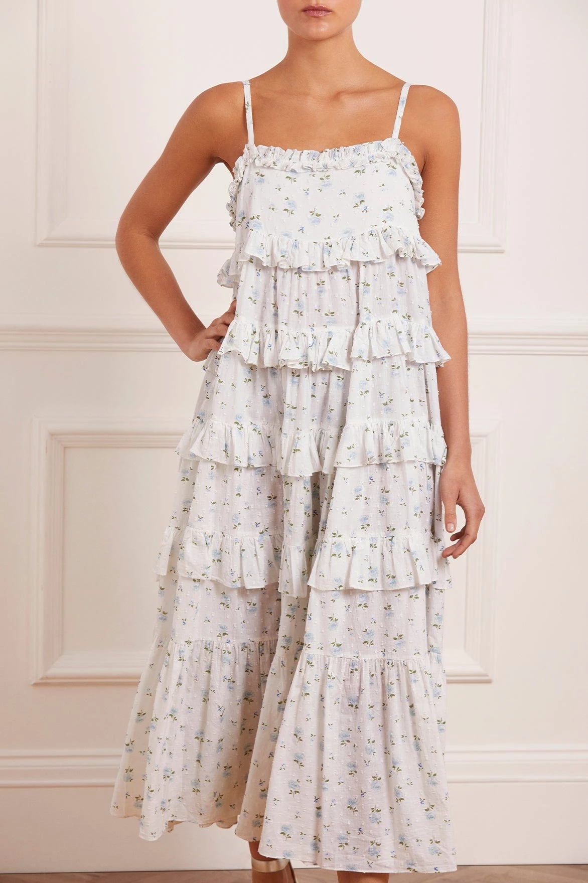 The Bijou Rose Cotton Ruffle Sun Dress in Moonshine / Blue. This cotton dress is decorated with a ditsy floral print scattered throughout. Designed beautifully with a playful silhouette and tiered frills for extra volume. A relaxed yet romantic statement look.