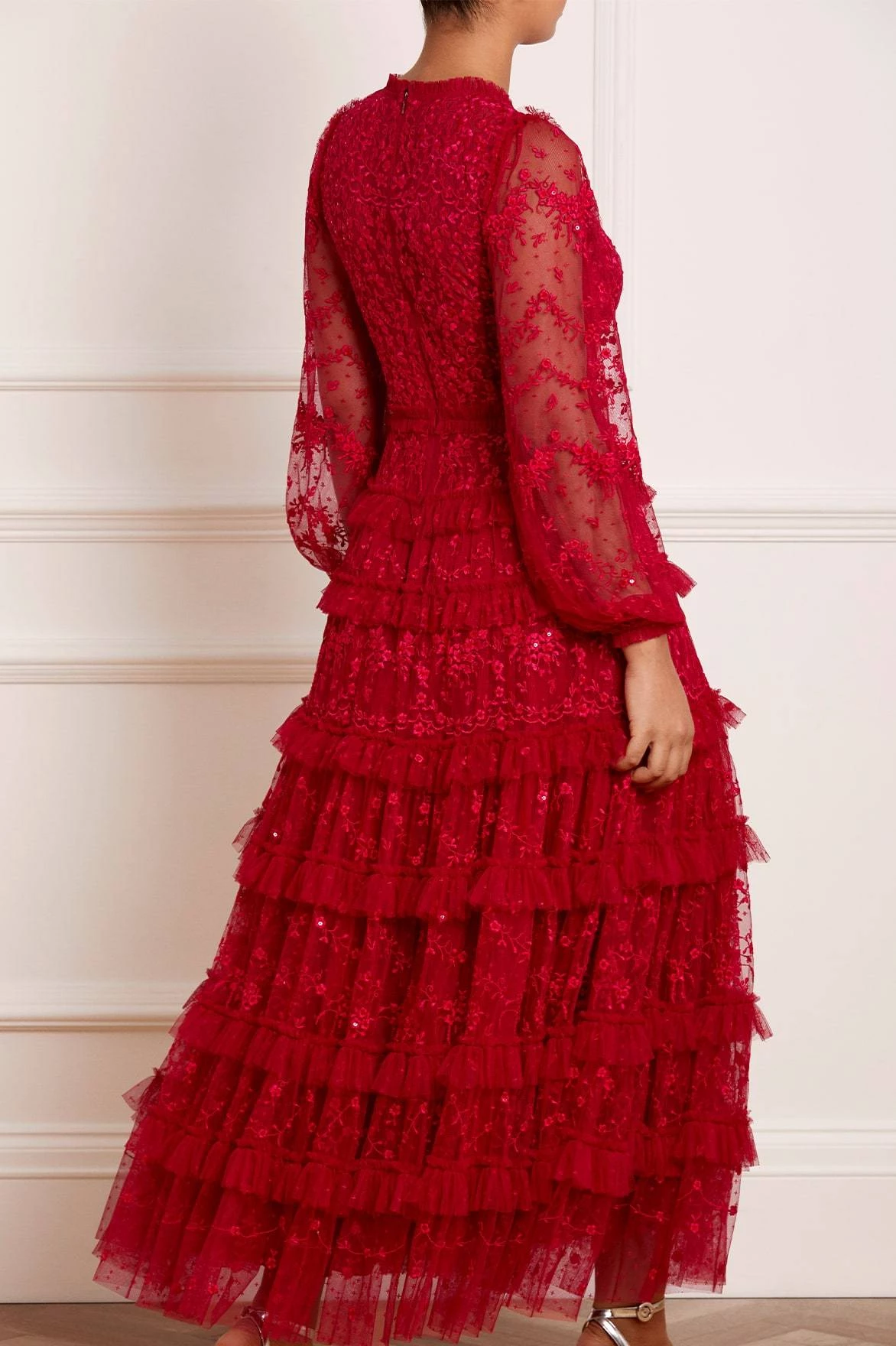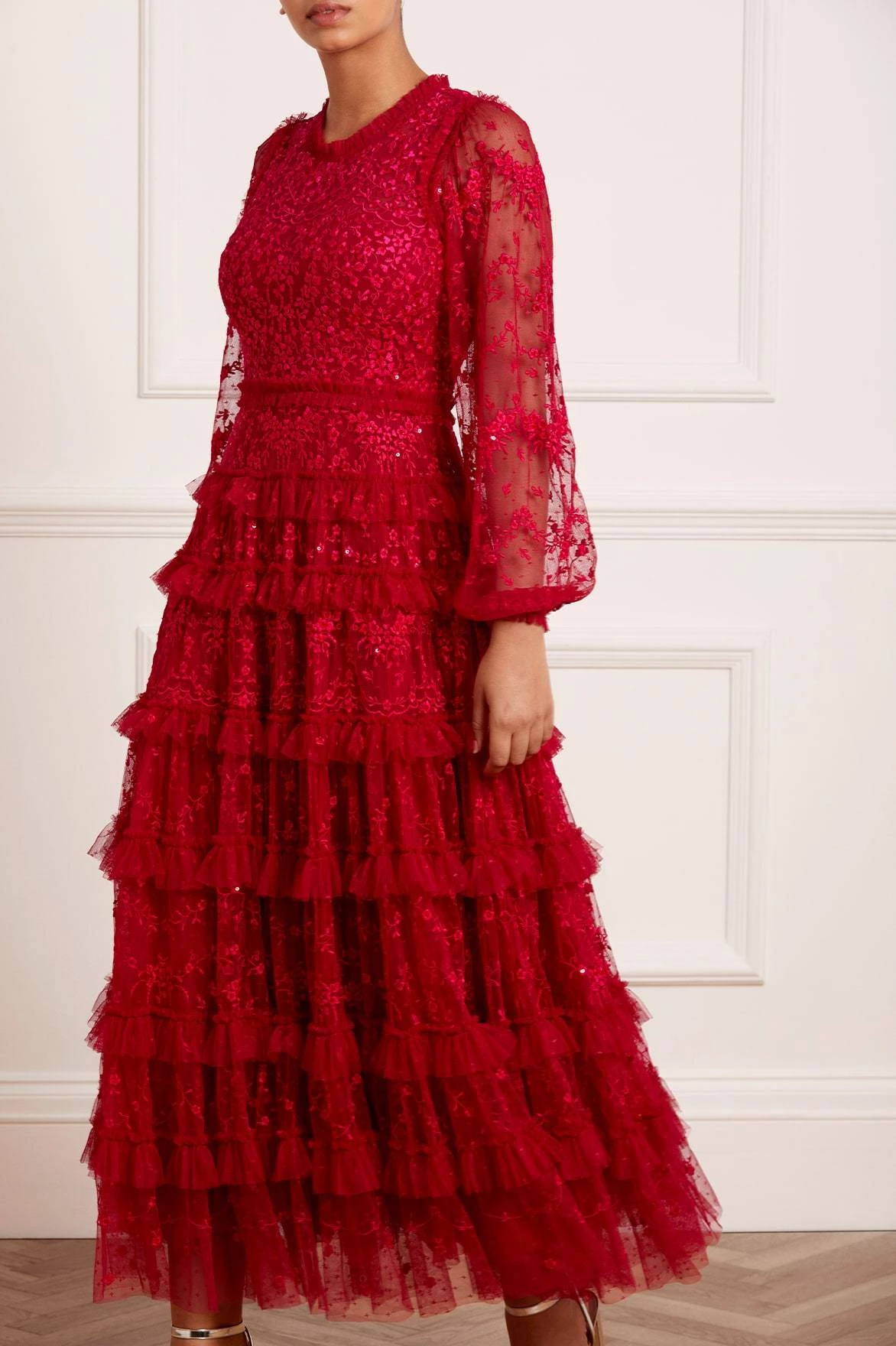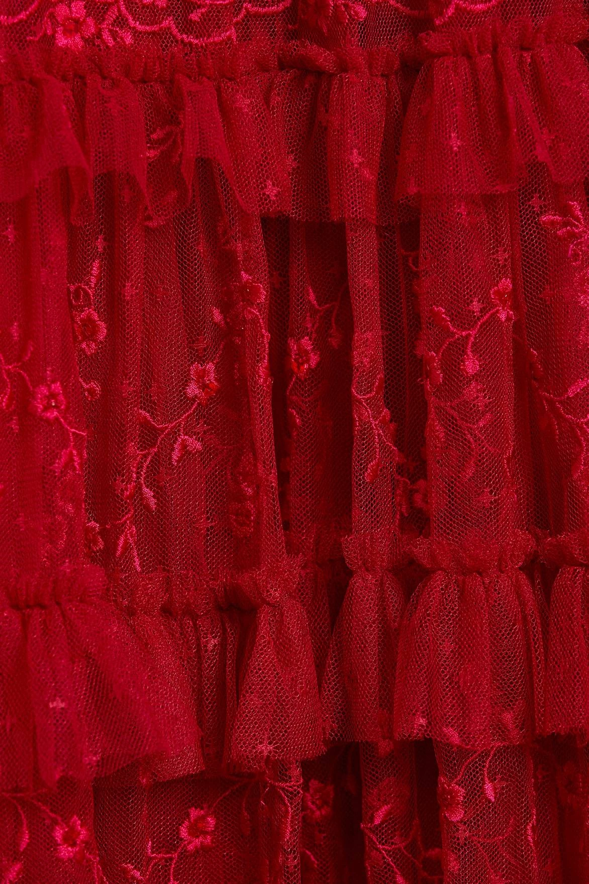 NEEDLE & THREAD EXCLUSIVE. The Blossom Lace Ankle Gown in Deep Red. Designed with a voluminous silhouette and layered frills, this gown is beautifully decorated with intricate embroidery and subtle clear sequins. A statement piece with a net layer to accentuate its dramatic silhouette. A truly show-stopping style.