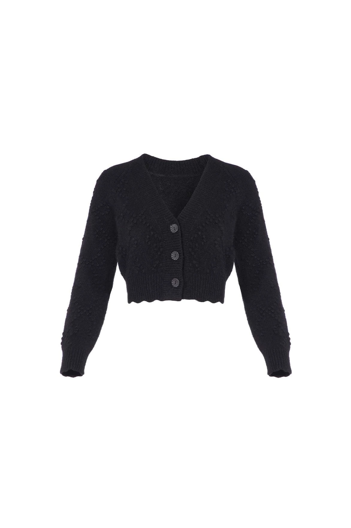 NEW SEASON | The Bow Stitch Cropped Cardigan in Black Developed in soft alpaca yarn creating a fluffy feel texture. Decorated with bobble stitches and romantic bow motifs creating a playful piece. This delicate knit is designed with a cropped fit finishing at the waist. Beautifully fitted with vintage sourced buttons with an intricate embossed design. Match with our tulle skirts for a statement look.