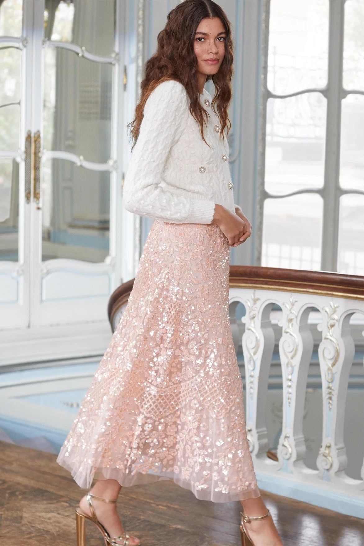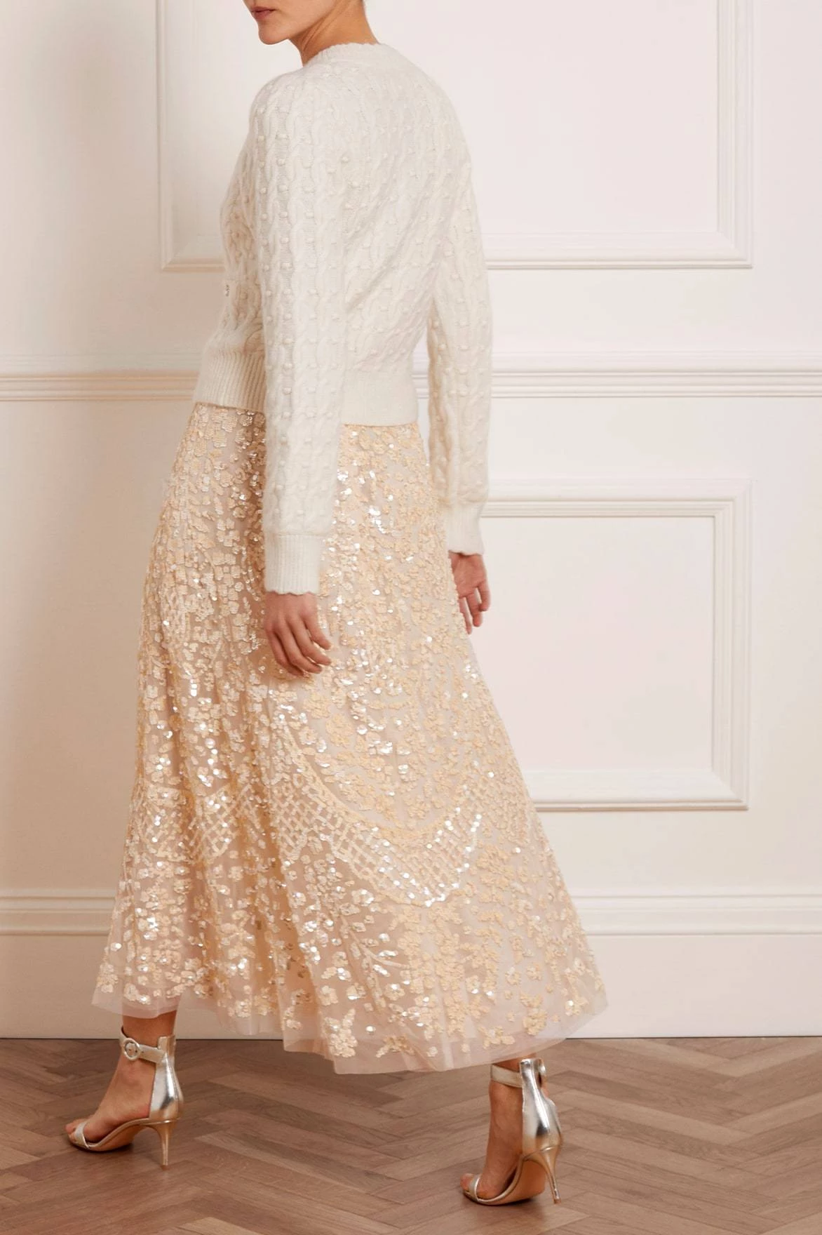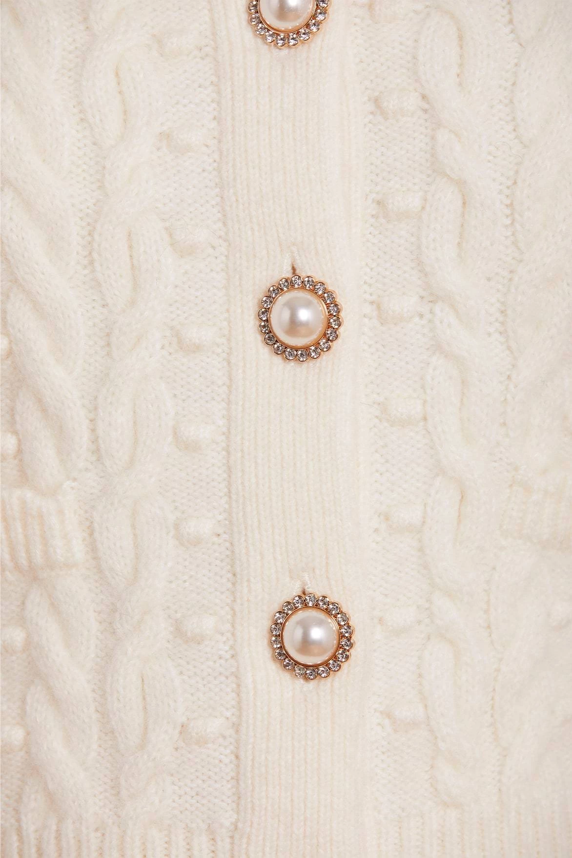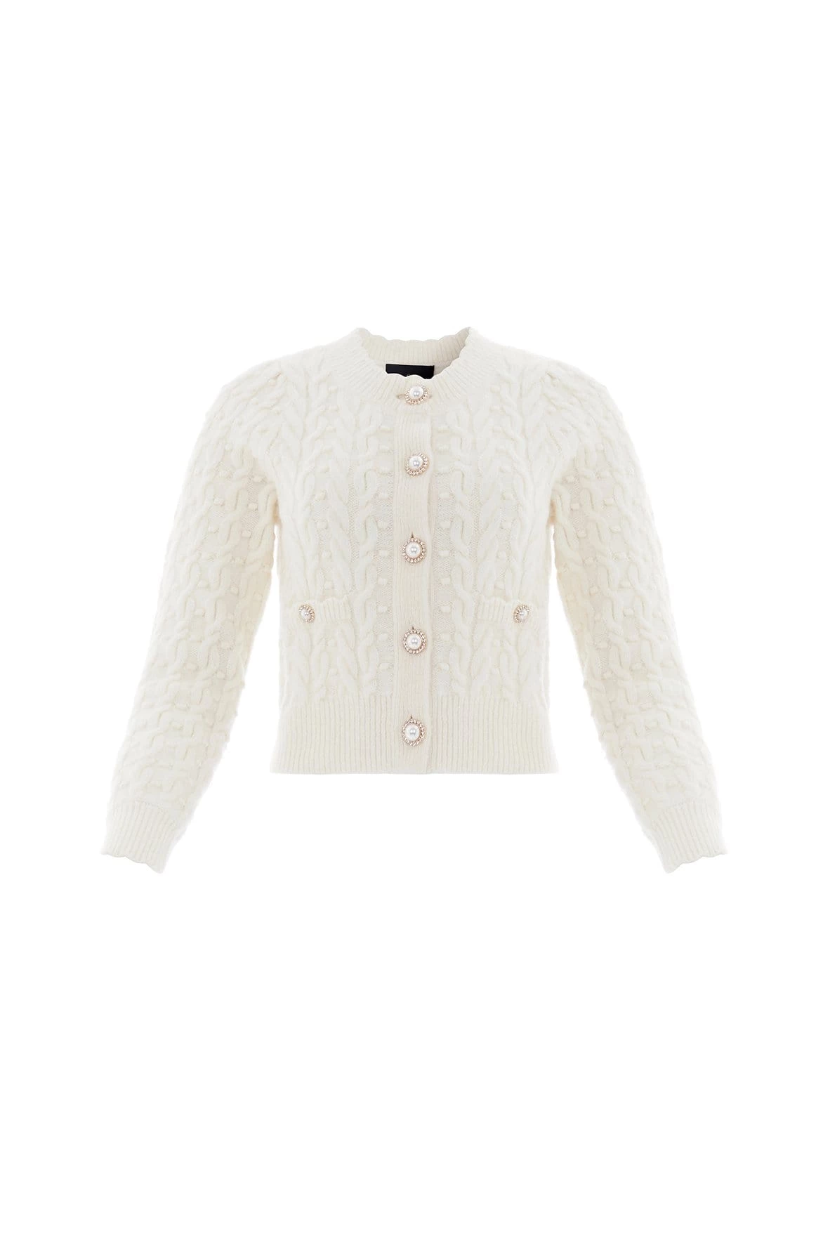 NEEDLE & THREAD EXCLUSIVE. The Cable Bobble Short Cardigan in Champagne. This cardigan is crafted from soft alpaca yarn, resulting in a cosy, fluffy texture. Featuring intricate cables and bobbles to create a substantial, deeply tactile knit. Designed with faux pockets, crystal buttons and scallop detailing. Make this style a new wardrobe favourite.