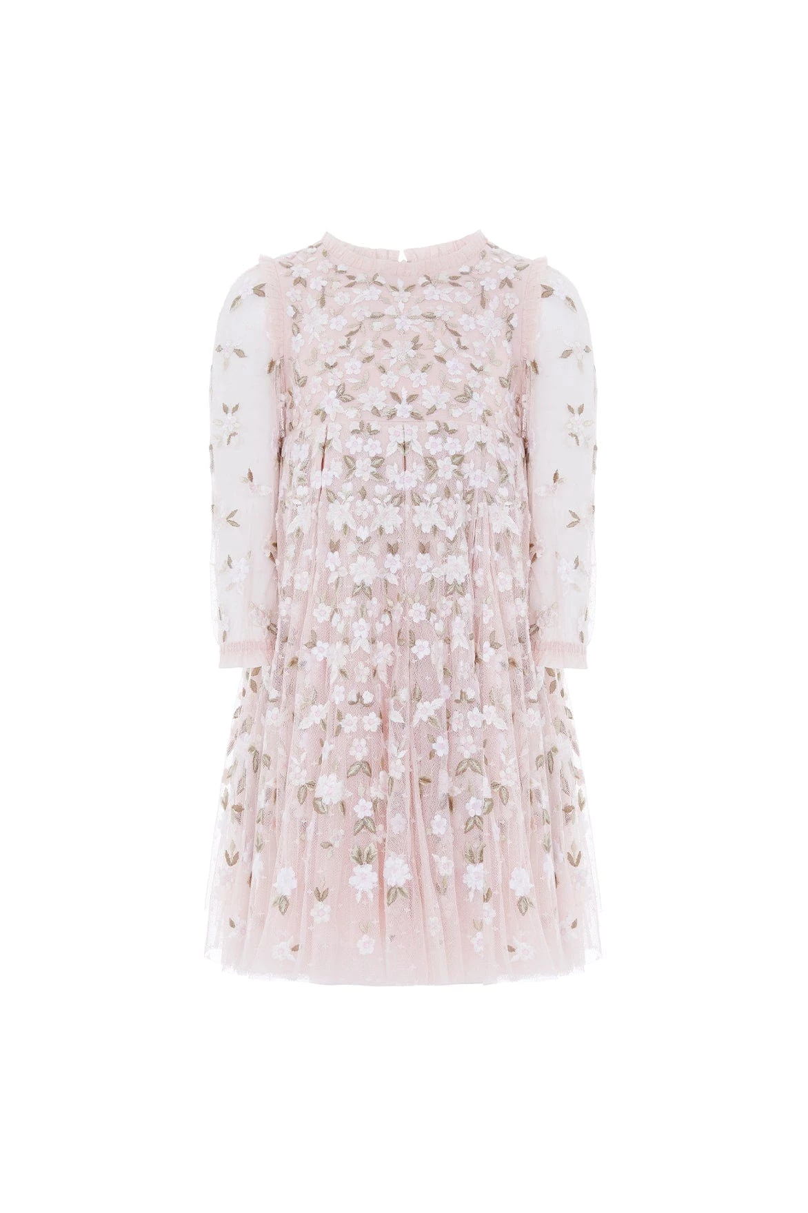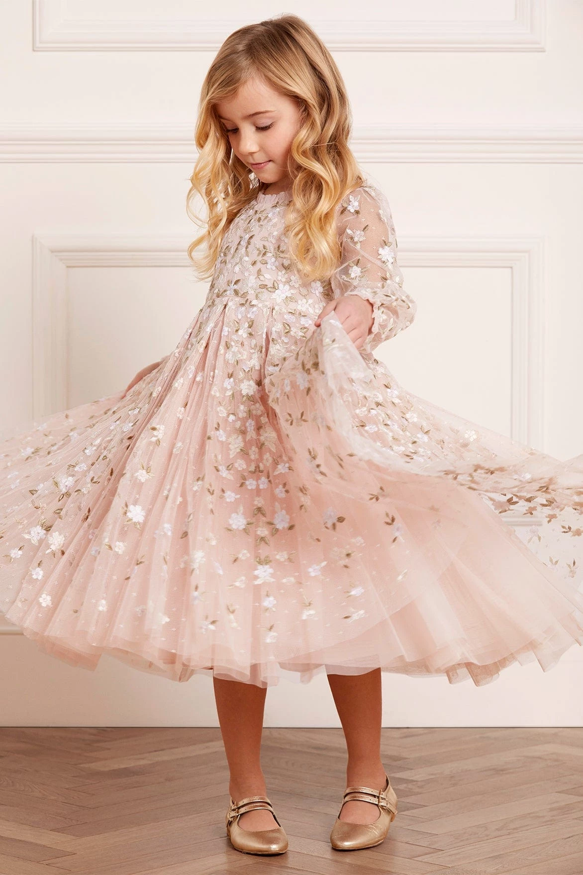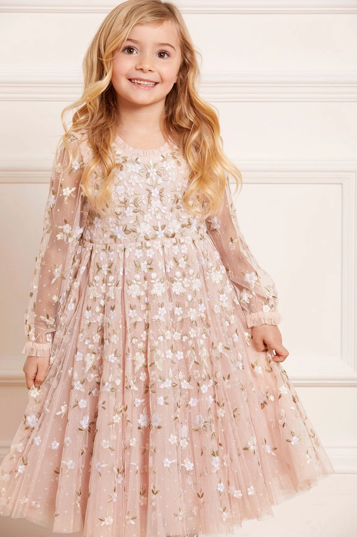 NEW SEASON | The Camellia Ditsy Long Sleeve KIDS Dress in Petal Pink/White. A classic Needle & Thread style. This dress is decorated beautifully with small, floral motifs on soft, pretty tulle fabric. Designed with a loose-fitting waist, pleated skirt, and a playful voluminous shape. The ultimate fairytale dress.