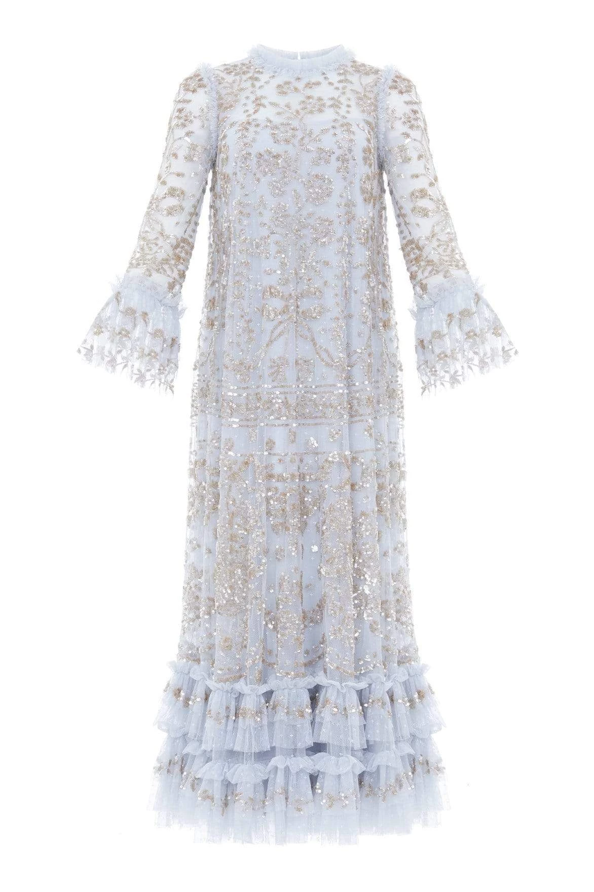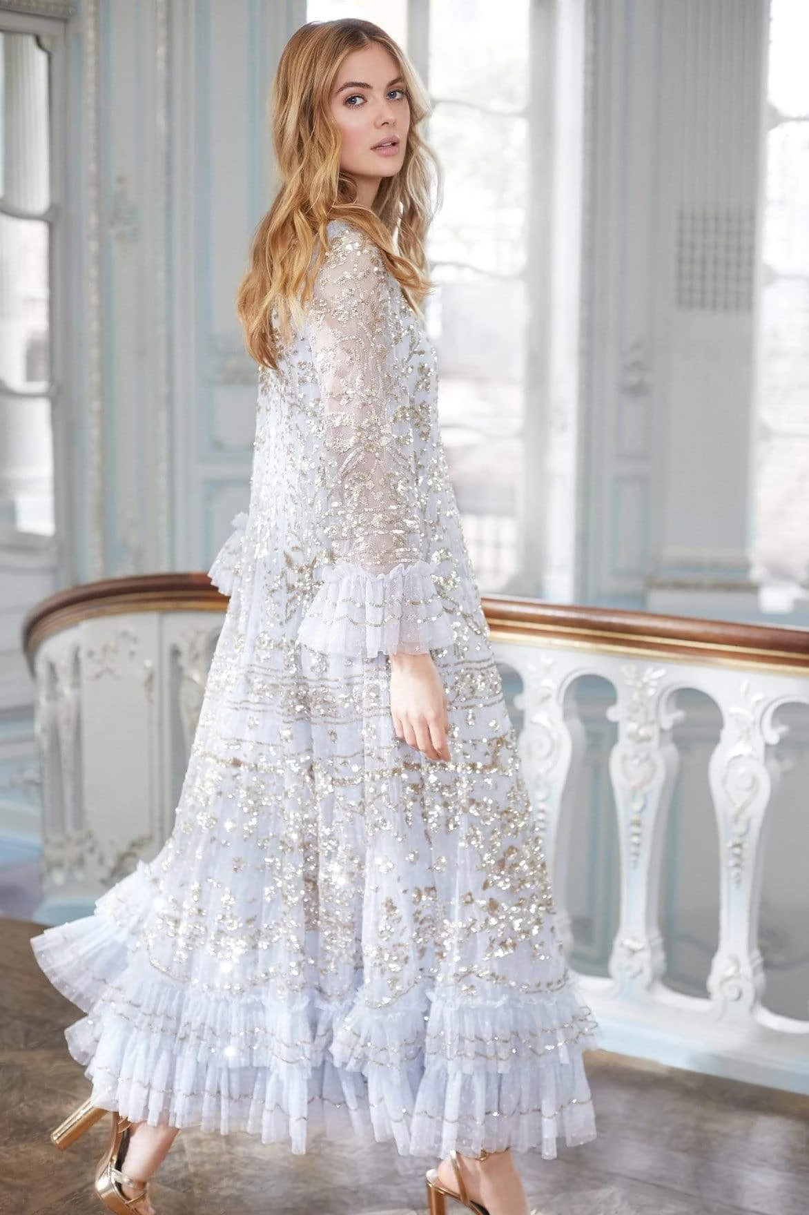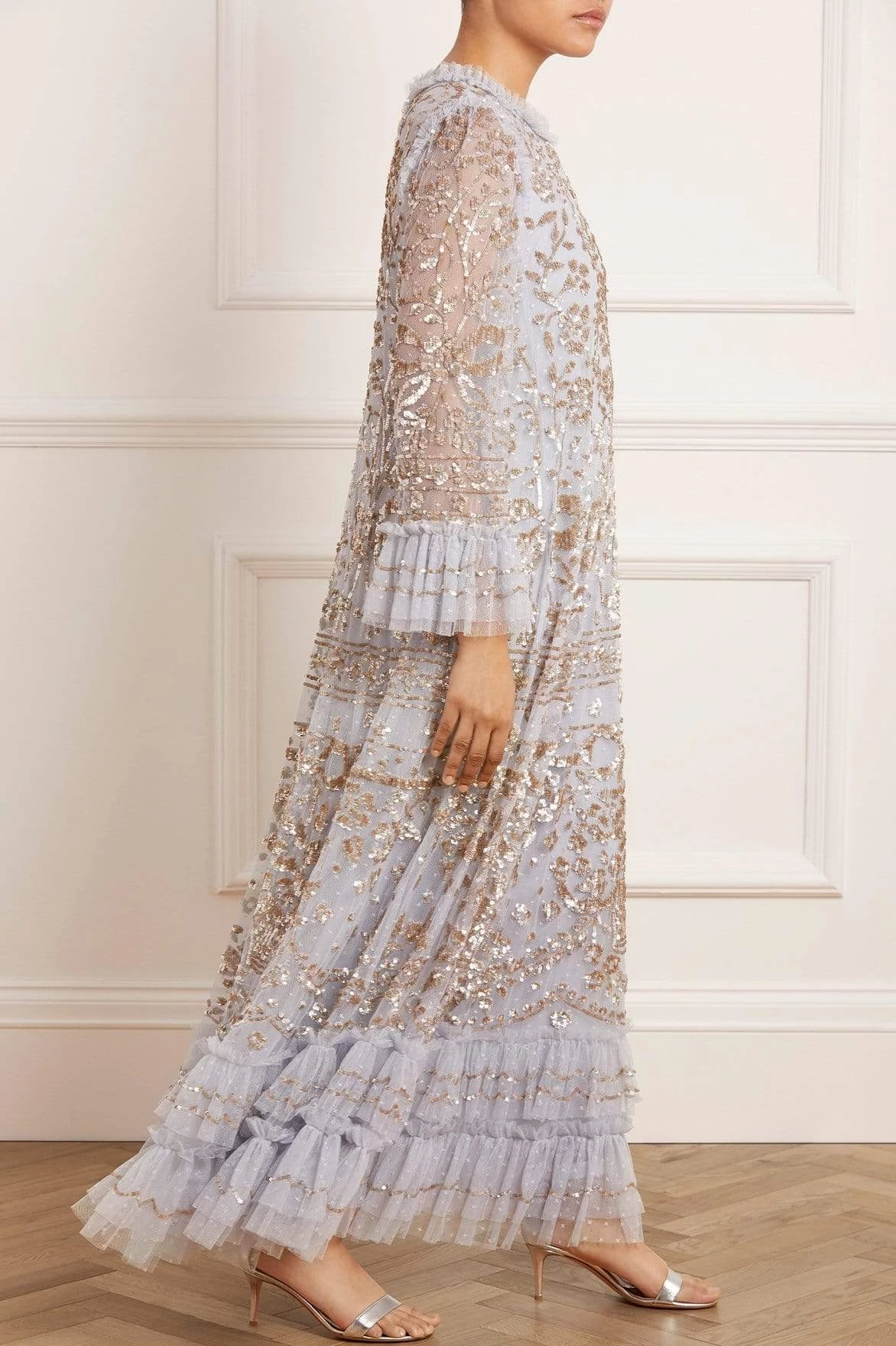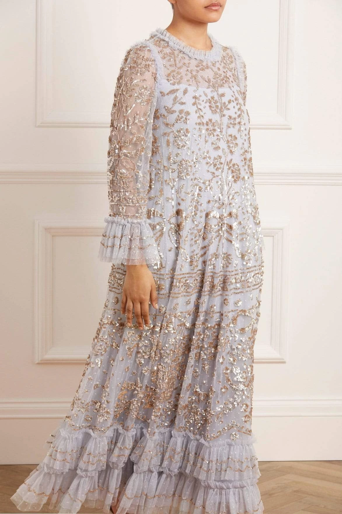 The Celia Long Sleeve Ankle Gown in Blue Mist / Gold. This statement long sleeve gown is designed with romantic artwork featuring ornate florals with ribbon bows, densely filled with shimmering gold sequins and exquisite detailing. Crafted with an effortless, loose fit with soft, playful tulle frills on the hem and cuffs. A key piece of the collection.
