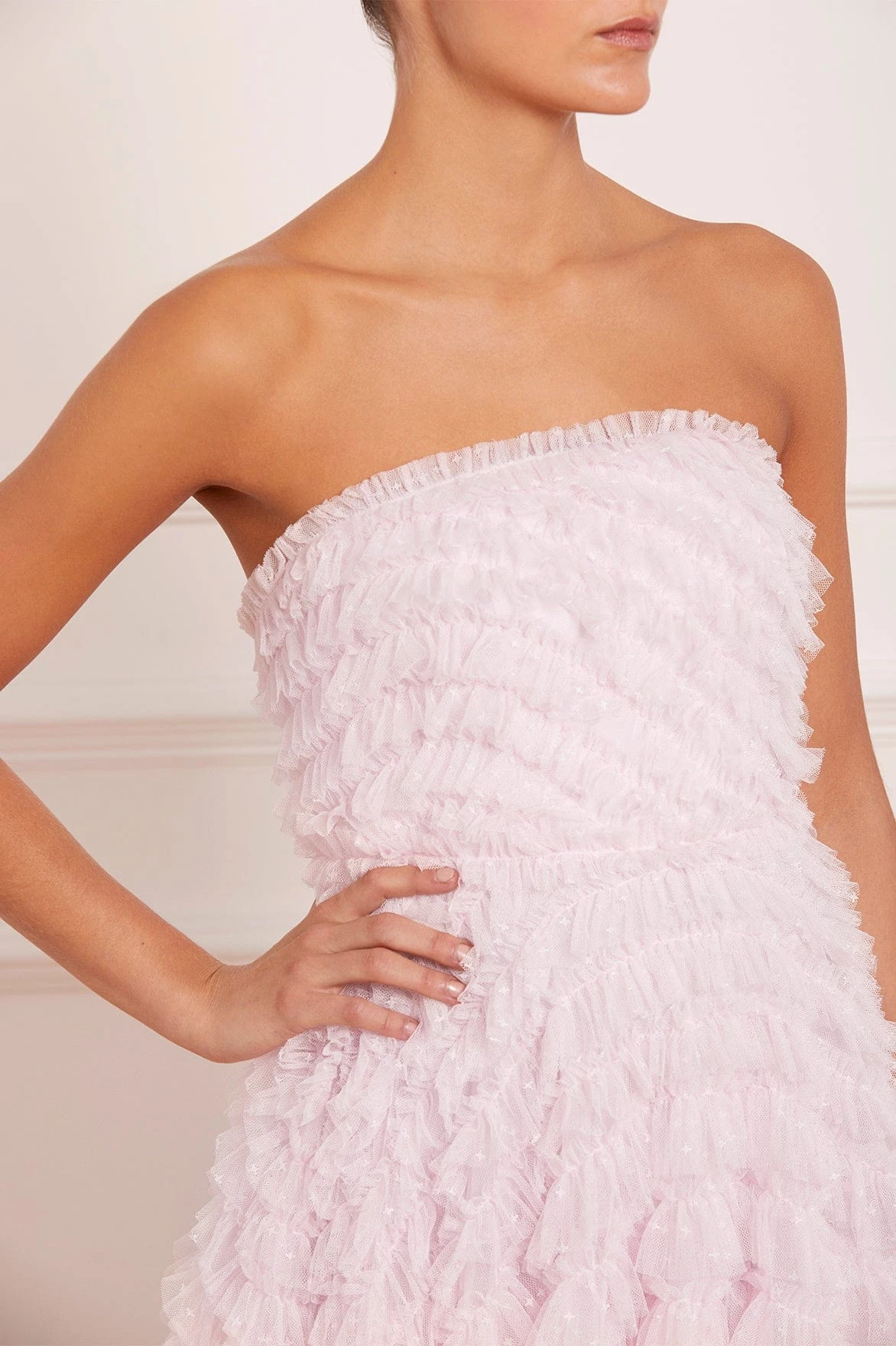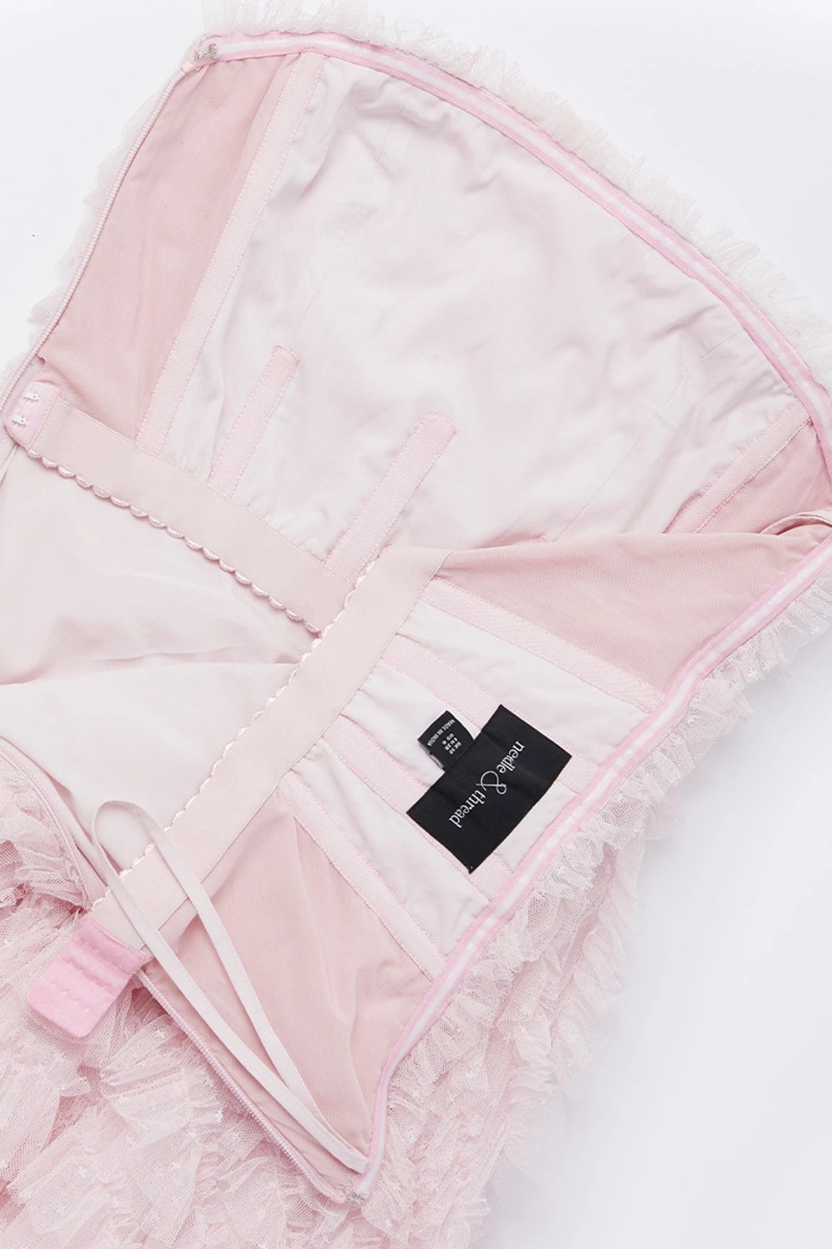 NEW SEASON | NEEDLE & THREAD EXCLUSIVE. The Elizabeth Rose Corset Ankle Gown in Wisteria. This corset gown is a classic, romantic style. Beautifully designed with large frills and layered tulle throughout the silhouette, adding volume and creating whimsical movement. The corset bodice features internal panels of power mesh fabric, adding structure to hold the silhouette in place whilst still allowing movement and comfort. Make a statement in the Elizabeth Rose.