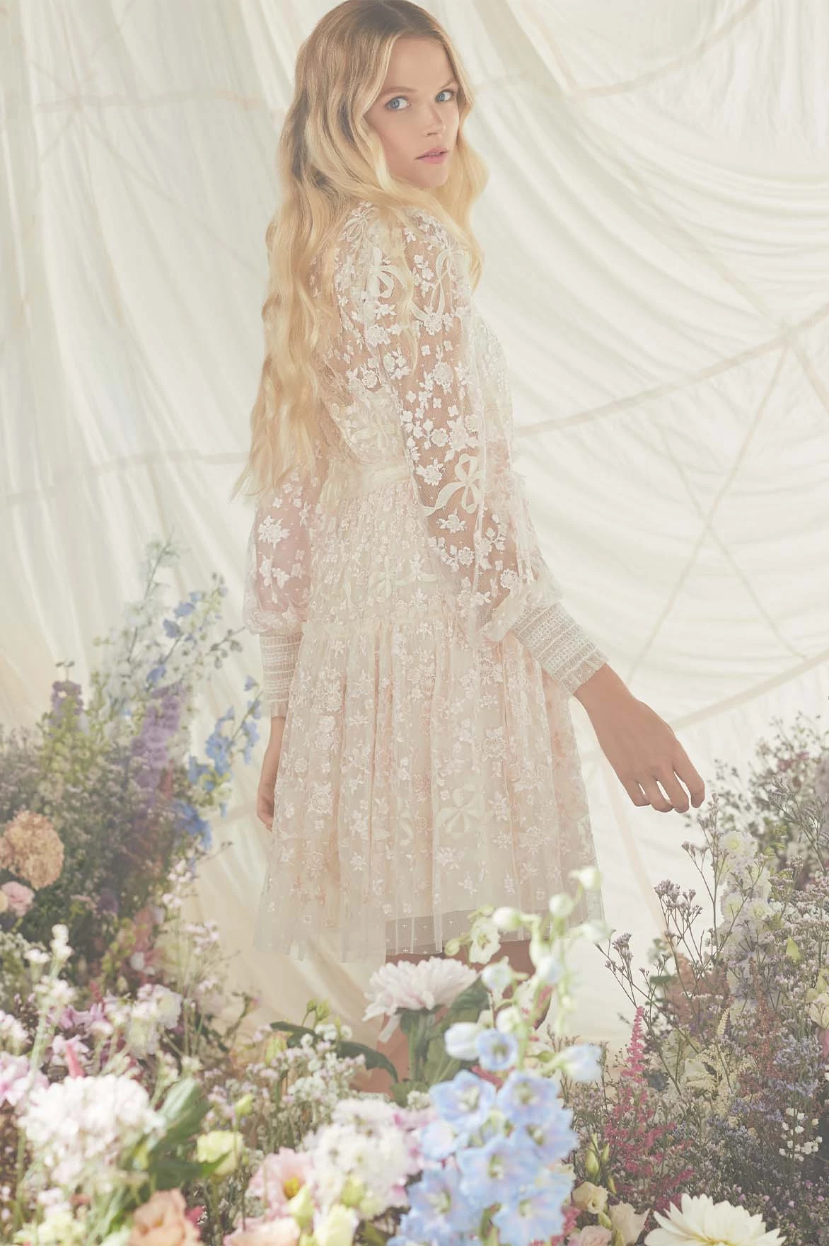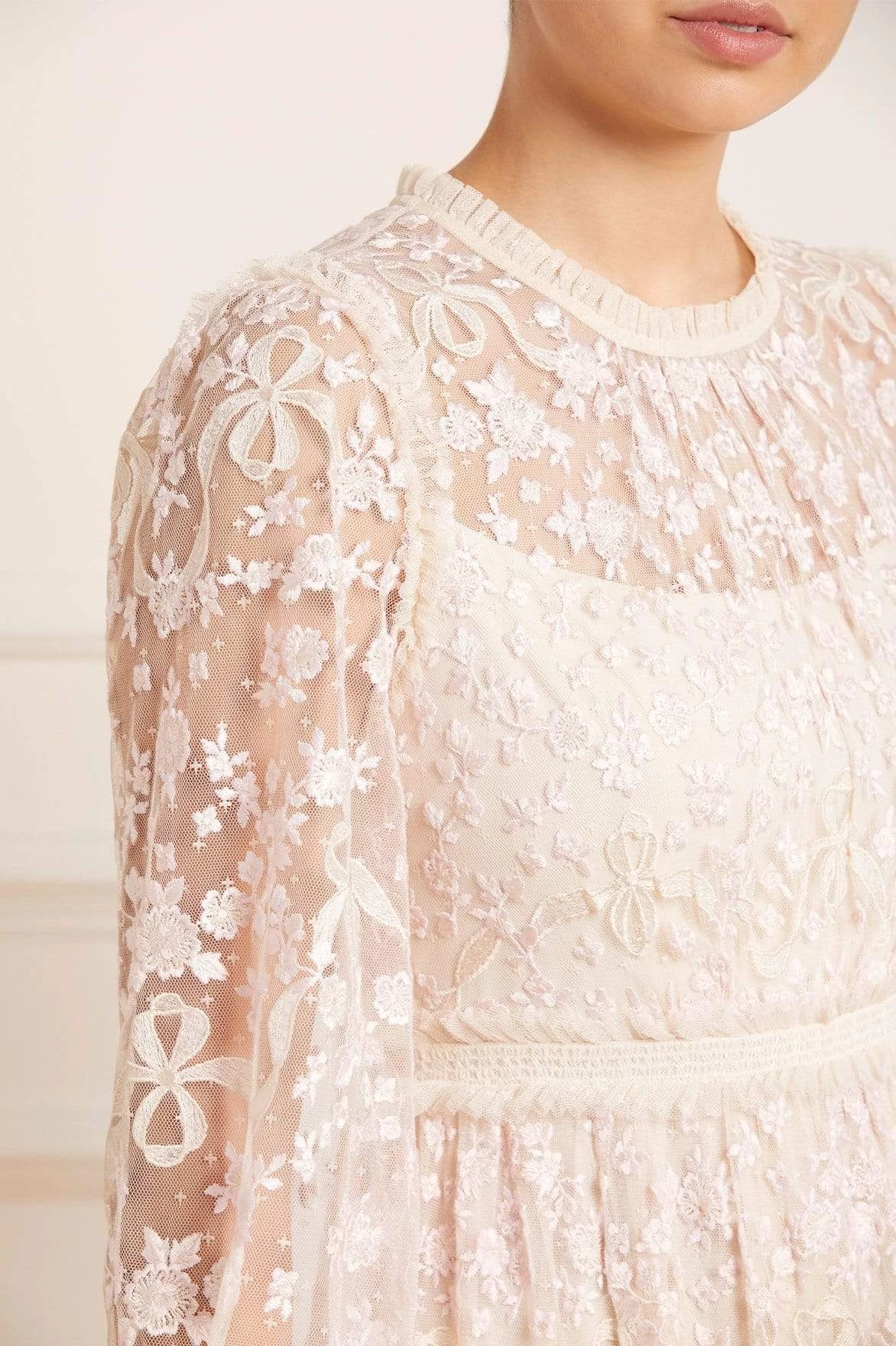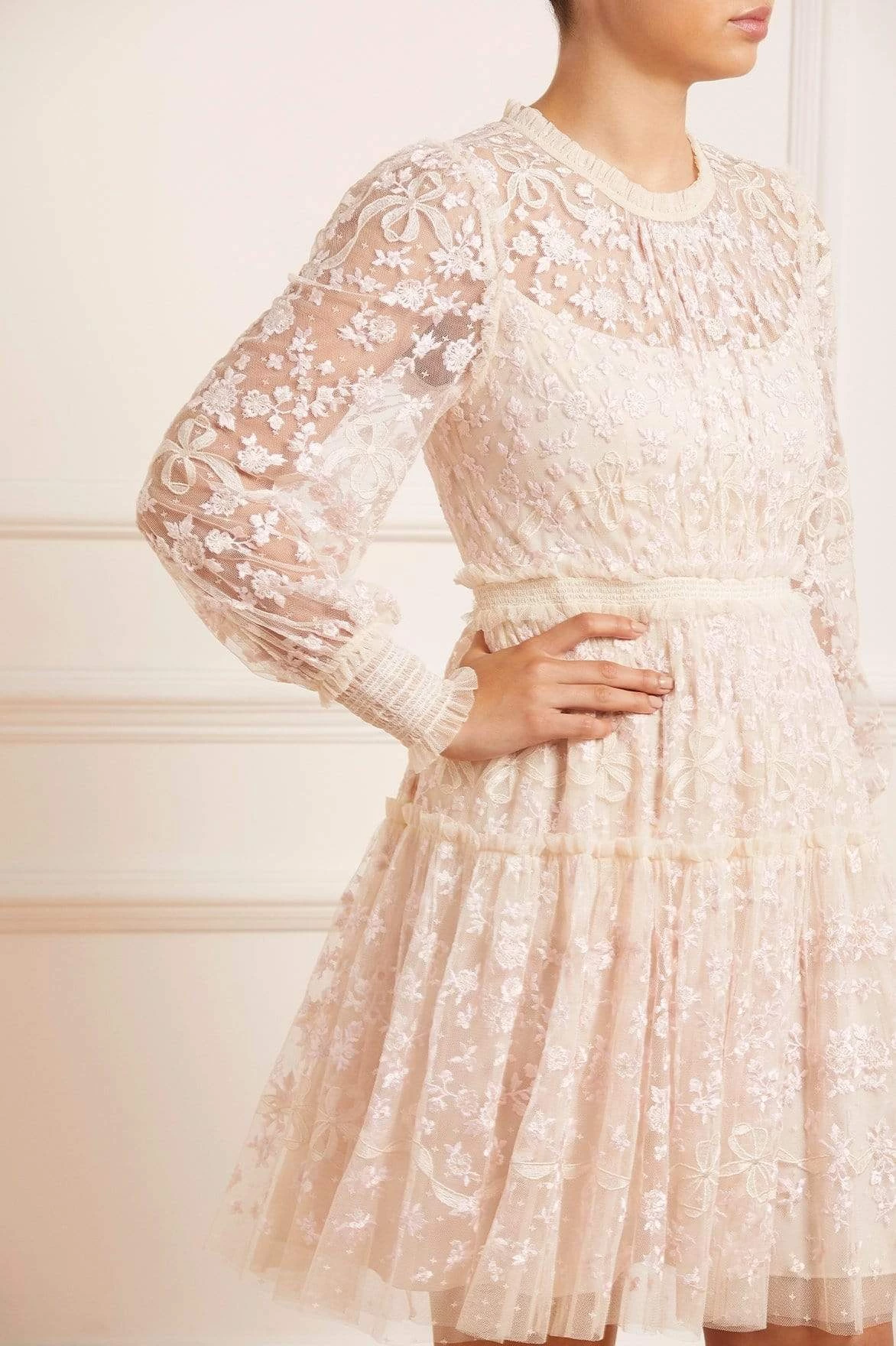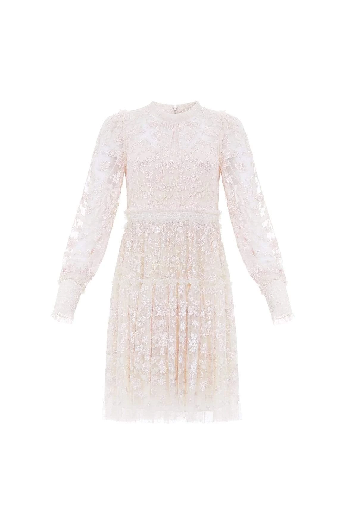 The Emilana Dress in Champagne. This romantic dress is beautifully embroidered with delicate floral and ribbon motifs. The artwork on the dress is inspired by a series of hand-embroidered French postcards from the early 1900s, creating a soft, pretty design. Crafted with signature Needle & Thread details, tiered panels and smocked cuff sleeves for easy wearing. Make this dress your new wardrobe staple.