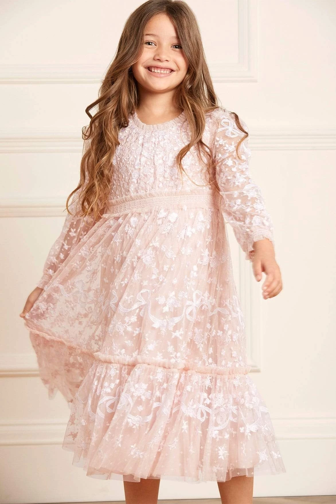 NEW SEASON | The Emilana Long Sleeve KIDS Dress in Petal Pink. This dress is embroidered with floral and bow motifs in gentle pastel tones. Featuring soft layered tulle to create frothy volume, combined with comfortable elasticated waist and cuffs. This effortless style is perfect for every occasion.