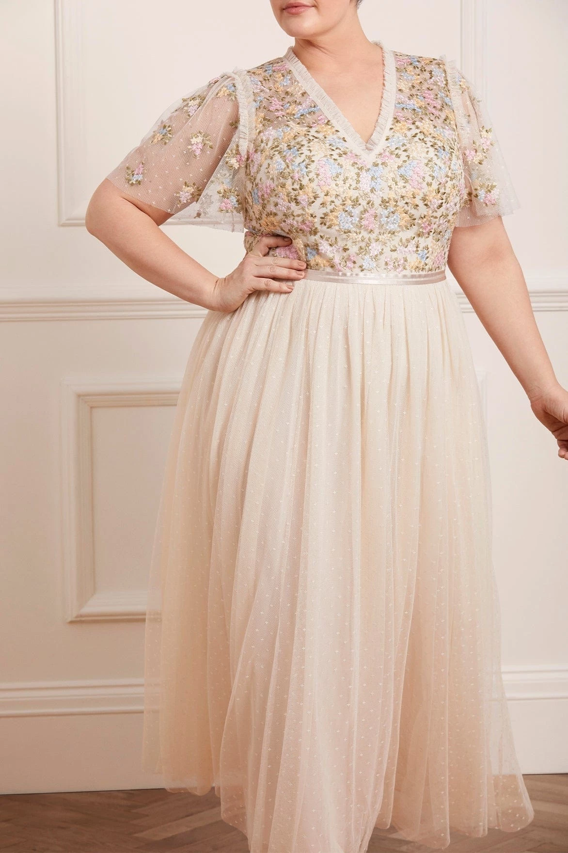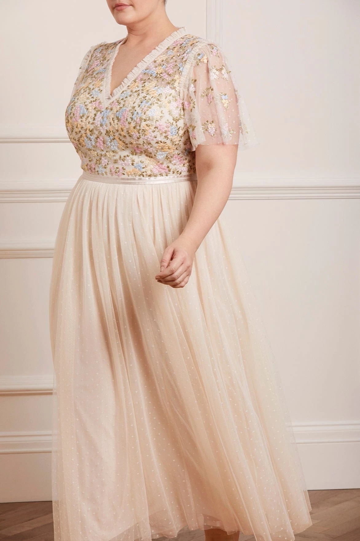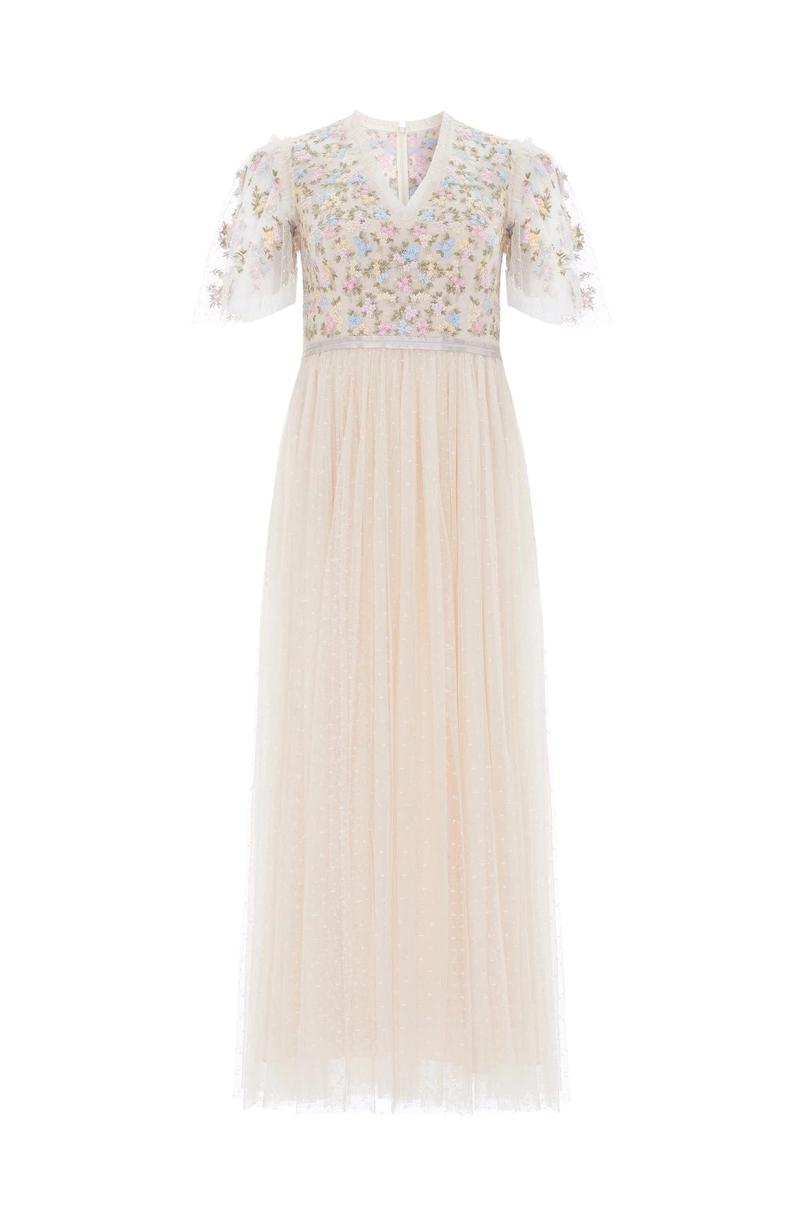 The Emma Ditsy Bodice V-Neck Ankle Gown in Champagne / Summer Daze. Beautifully crafted with an intricately embellished bodice featuring pretty floral clusters. This ankle gown has a V-neckline design, cap sleeves and tulle trim detailing. Designed with layers of frothy tulle, creating romantic movement as you walk. A truly exquisite piece.