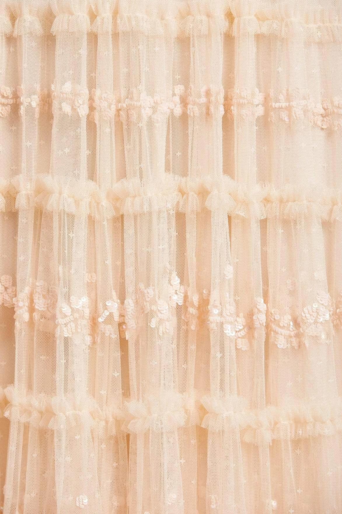 The Eve Sequin Cami Gown in Champagne / Pink. This beautiful gown is developed with a flattering V-neckline and a sweeping skirt, creating romantic movement as you walk. Crafted with layers of our signature kisses tulle, and intricately adorned with shimmering sequin borders in pretty, lace-inspired designs. Make a statement in the Eve.
