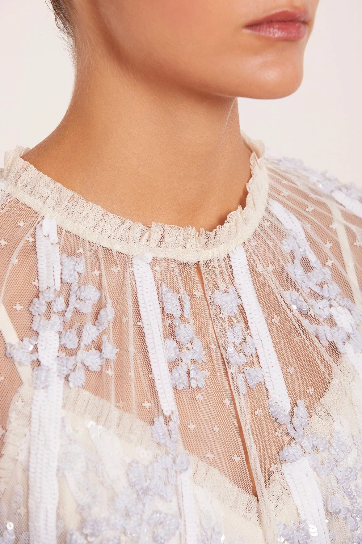 The Floral Evermore Midaxi Cape in Champagne / Blue. This midaxi cape is intricately adorned with a romantic artwork featuring floral motifs and shimmering sequins. Delicately designed in textured soft tulle with signature Needle & Thread frills. The perfect styling piece to layer over the Floral Evermore Sequin Cami Ankle Gown.